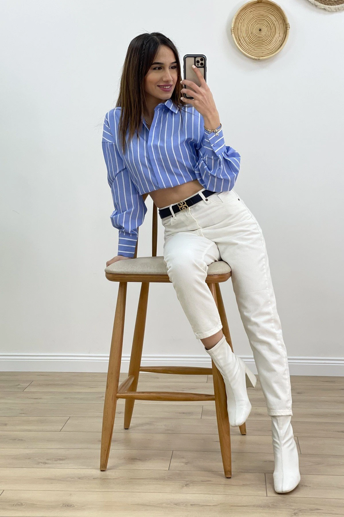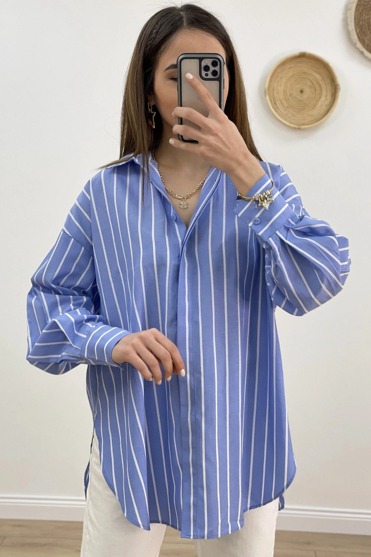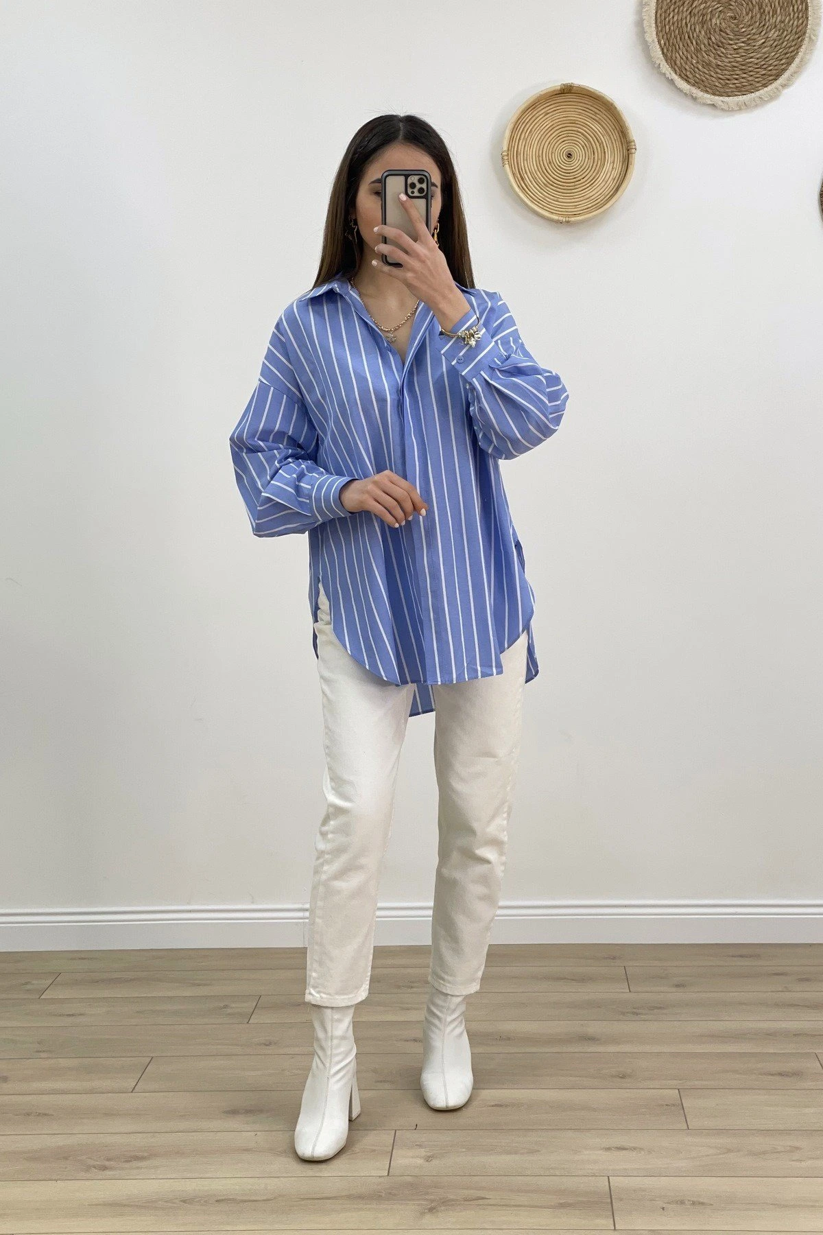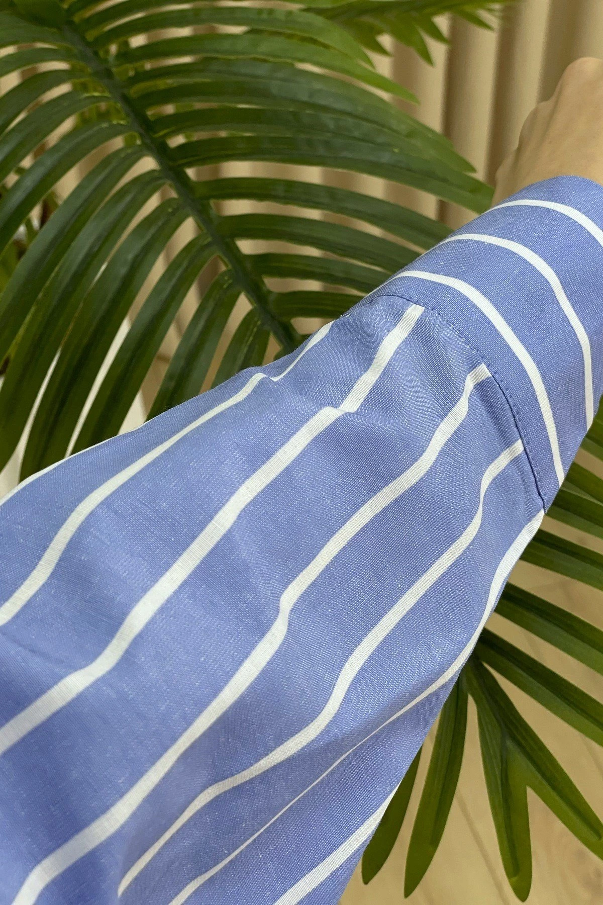 ETEĞİ OVAL YIRTMAÇLI ÇİZGİLİ SALAŞ GÖMLEK – MAVİ