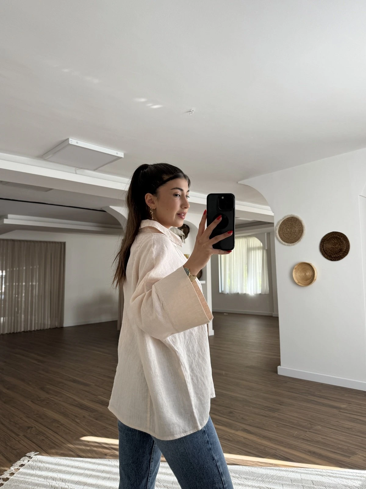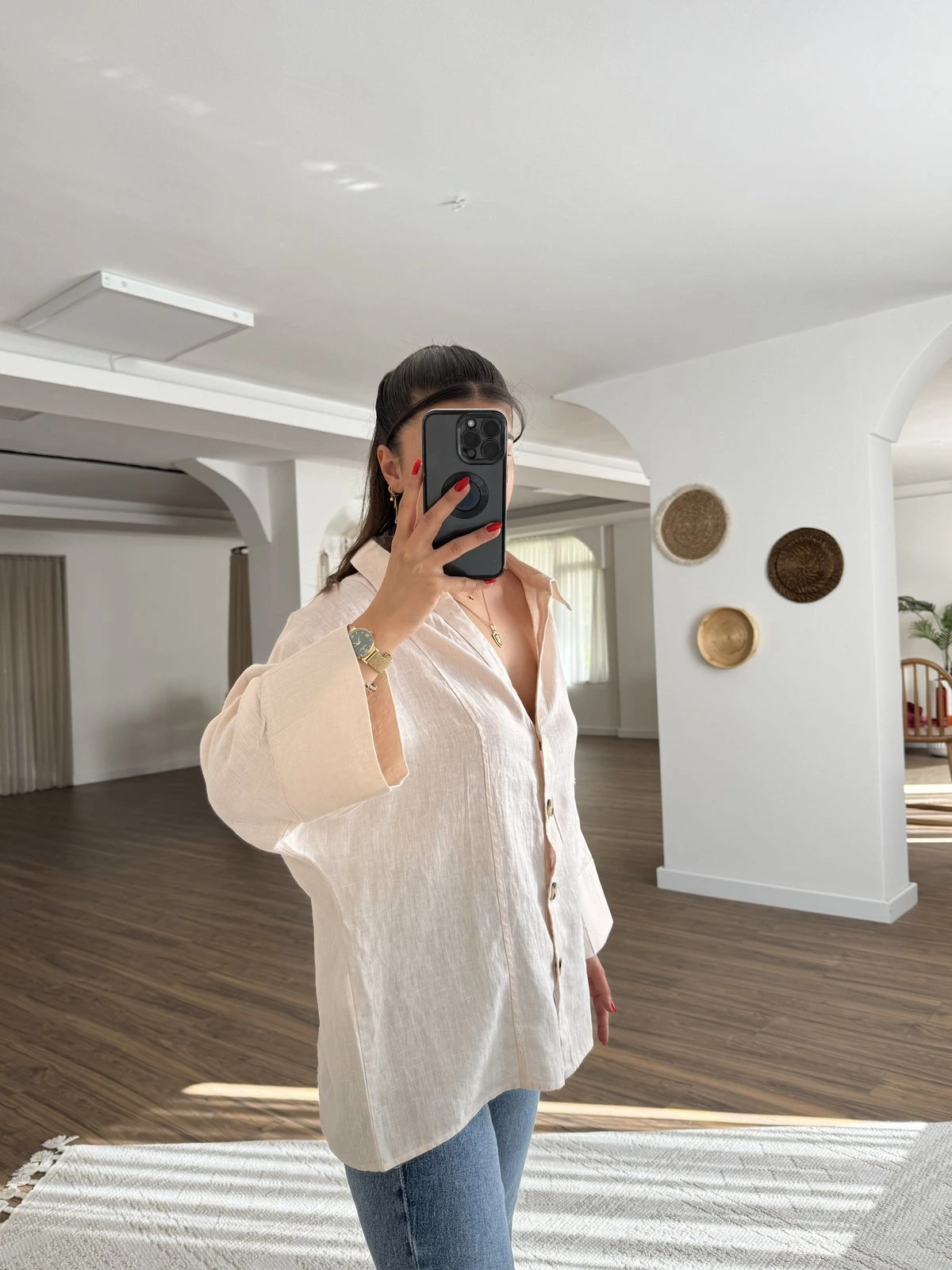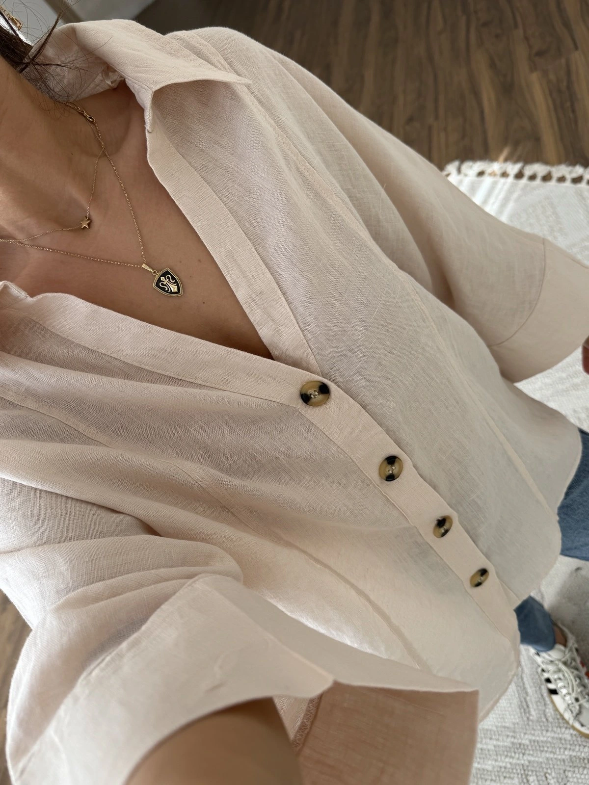 GENİŞ V YAKA KEMİK DÜĞME HAM KETEN GÖMLEK – SOMON