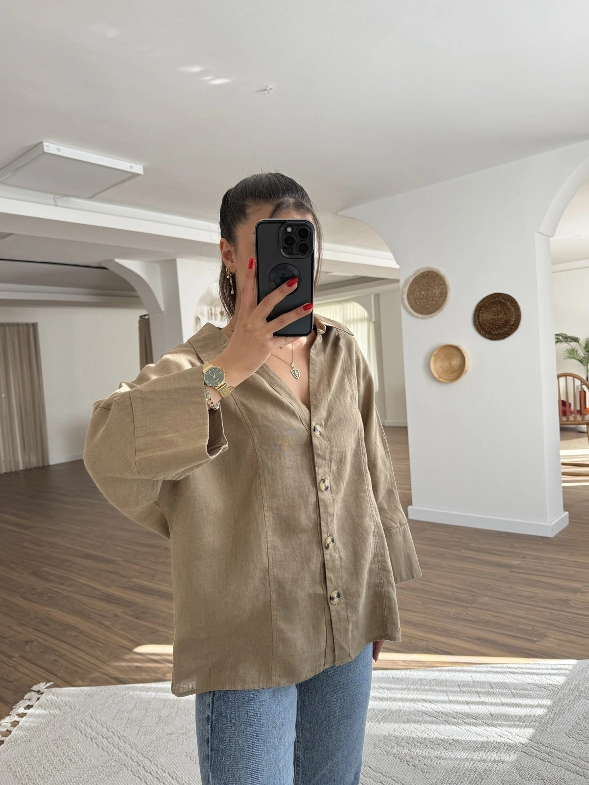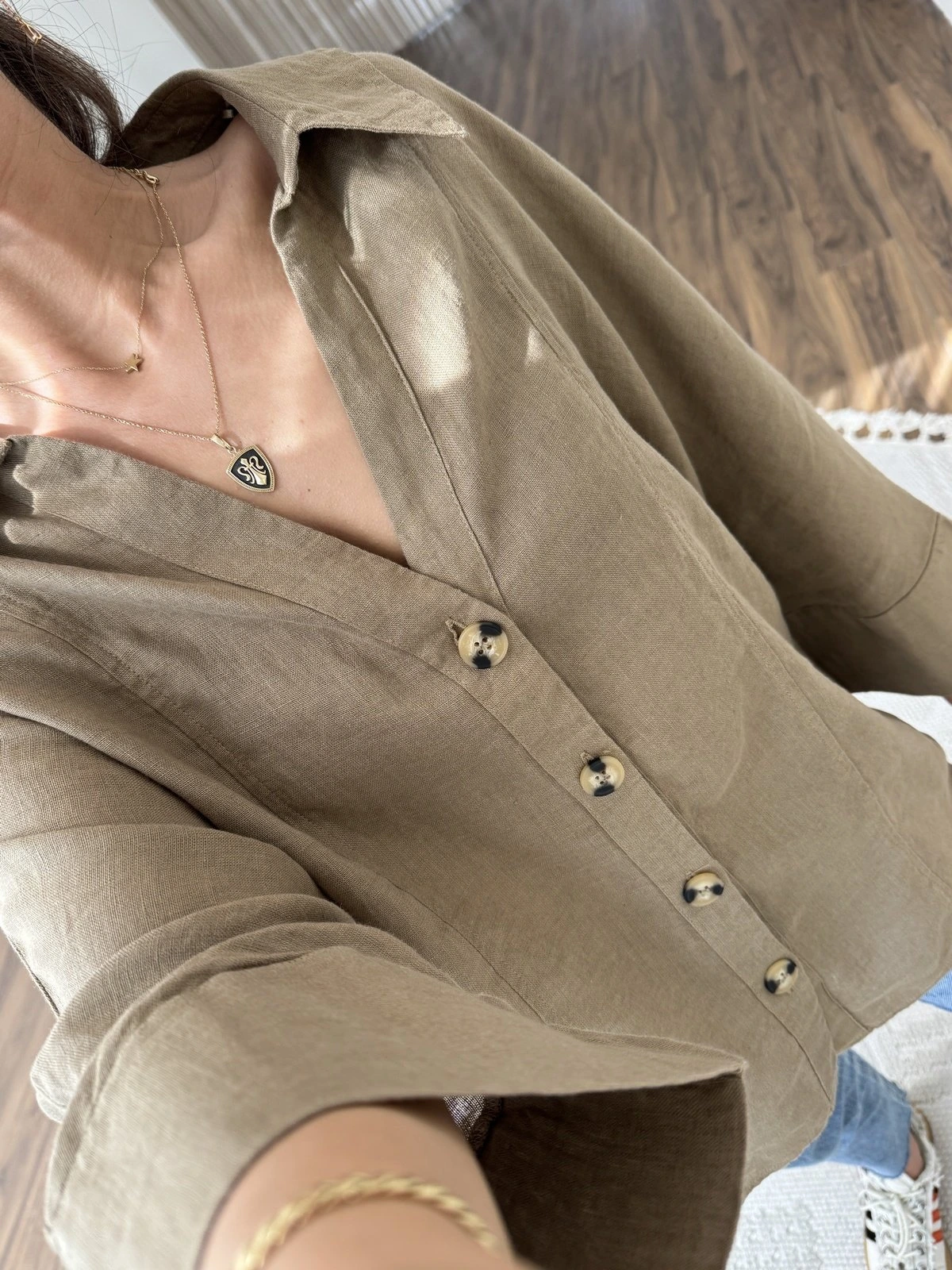 GENİŞ V YAKA KEMİK DÜĞME HAM KETEN GÖMLEK – TOPRAK