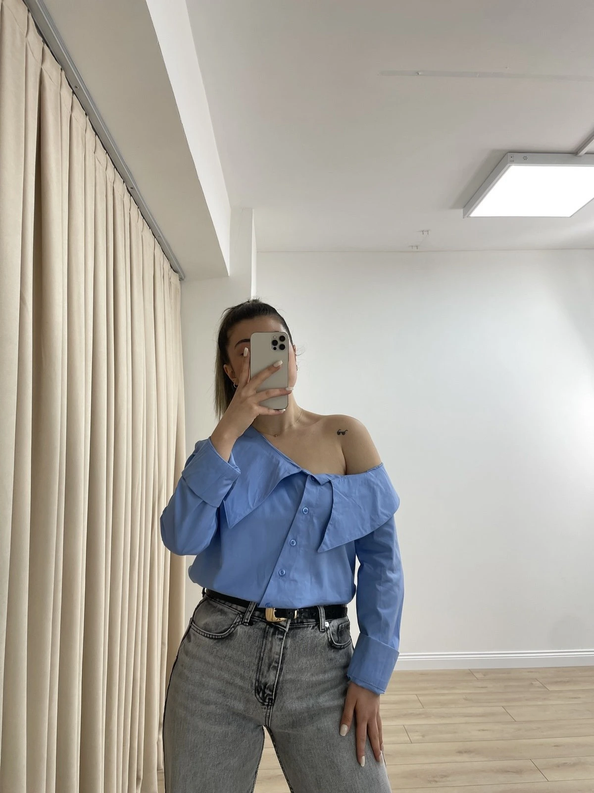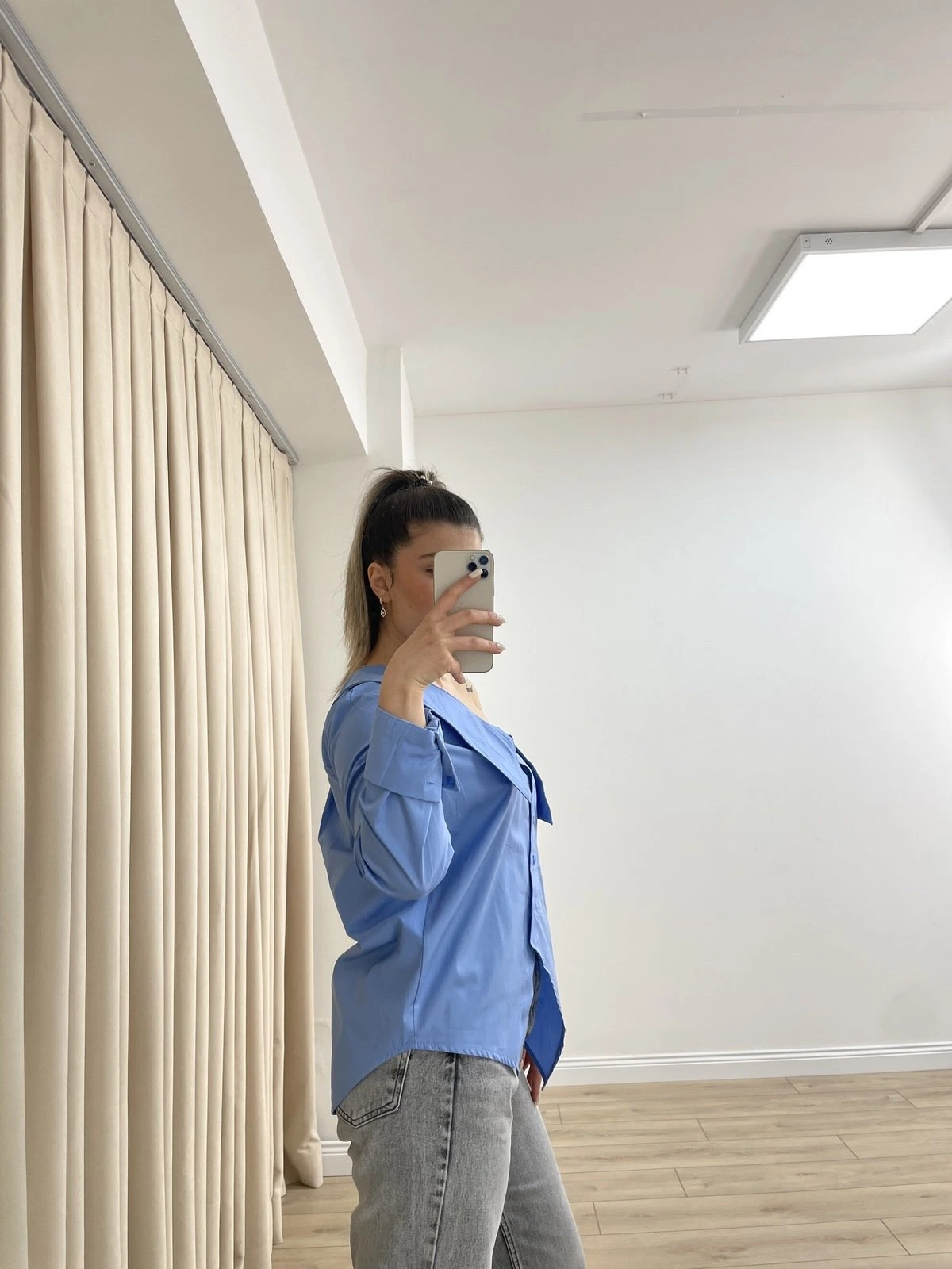 GENİŞ YAKA ASİMETRİK PAMUK GÖMLEK – MAVİ