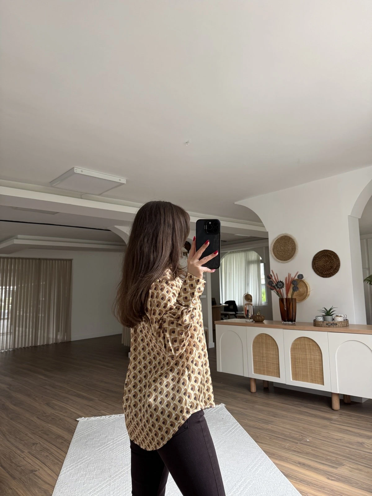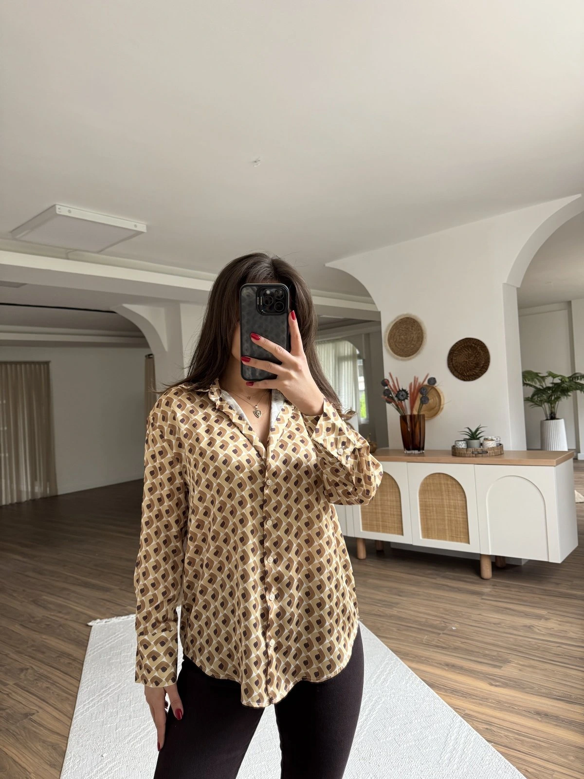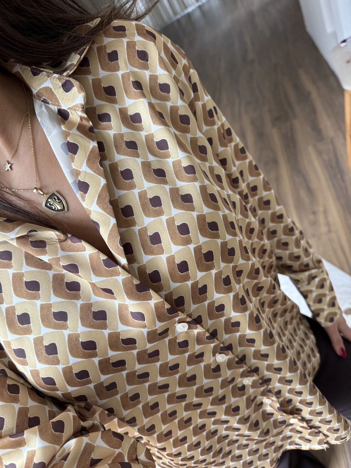 GEOMETRİK DESEN V YAKA SATEN GÖMLEK – HARDAL