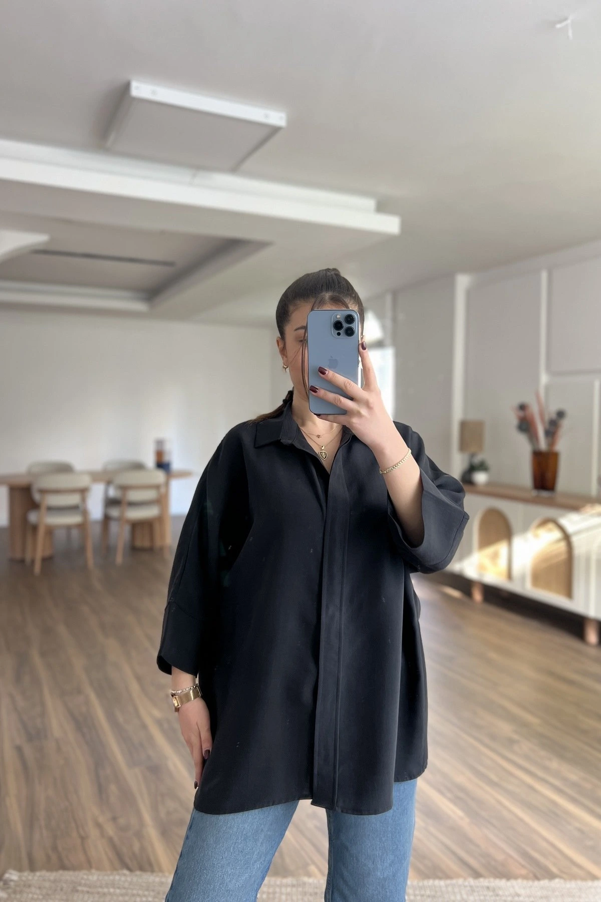 GİZLİ DÜĞME TRUVAKAR KOL TENSEL SALAŞ GÖMLEK – SİYAH