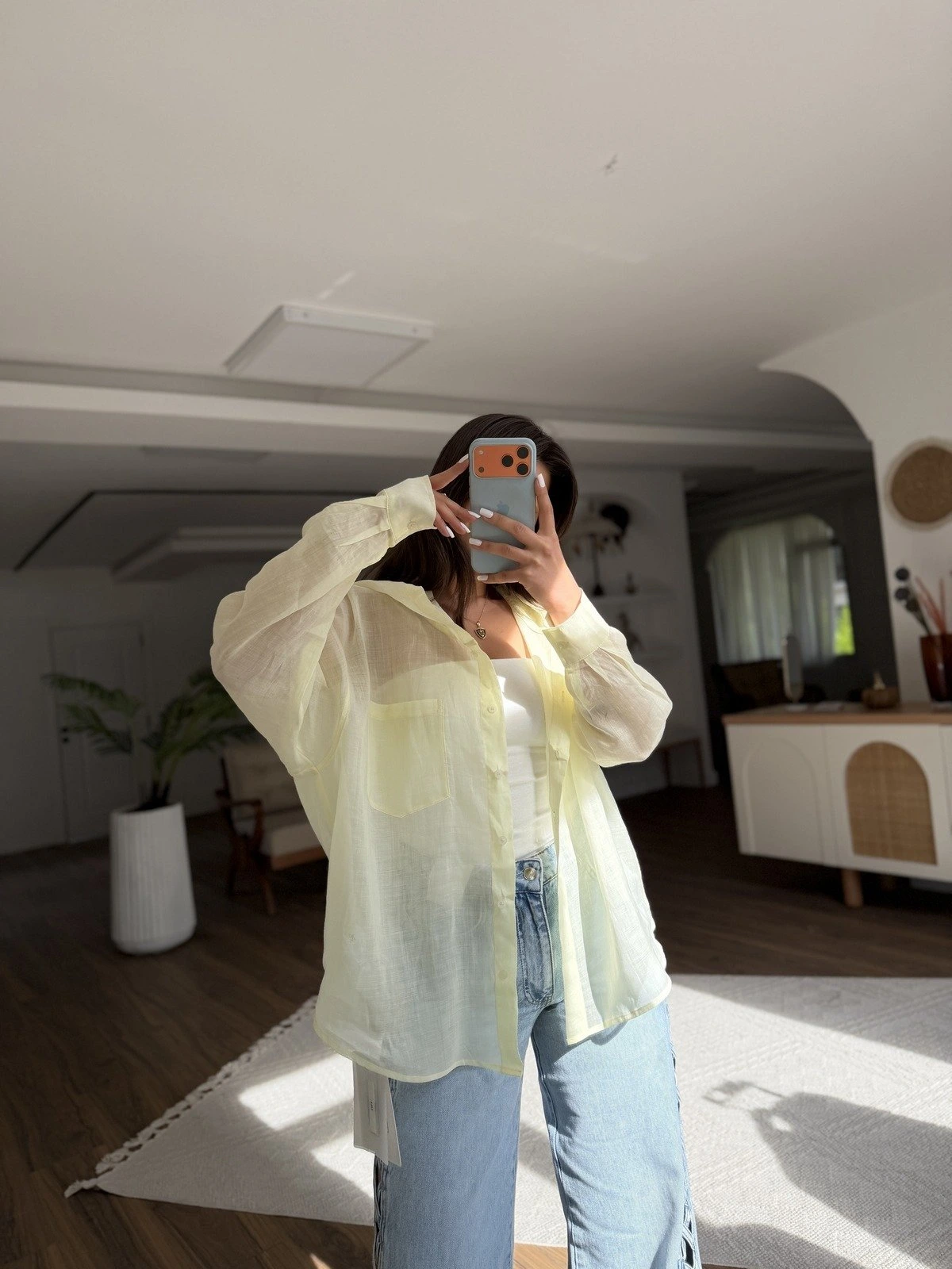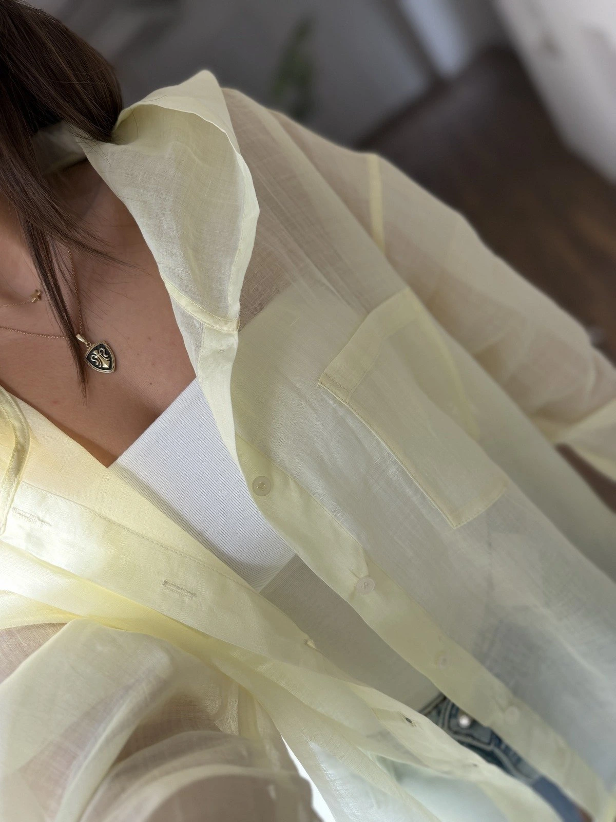 KAPÜŞONLU TEK OVERSİZE İNCE KETEN GÖMLEK – SARI