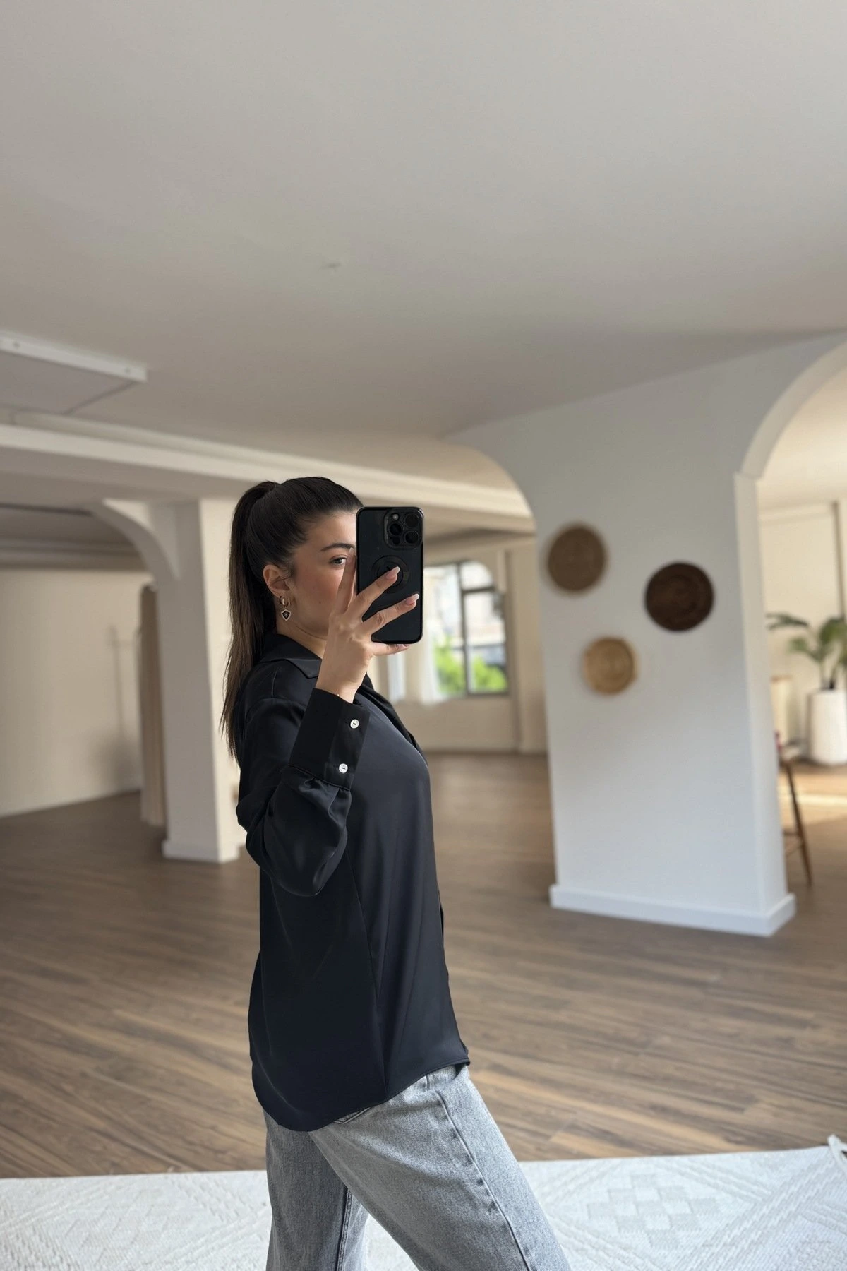 KLASİK SATEN V YAKA GÖMLEK – SİYAH