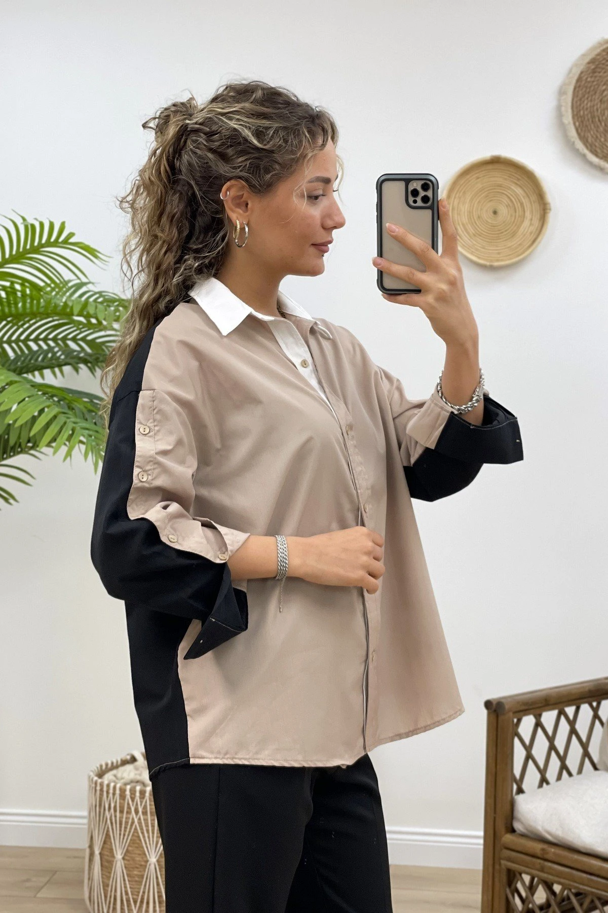 KOL DÜĞMELİ ÇİFT RENK GÖMLEK – BEJ