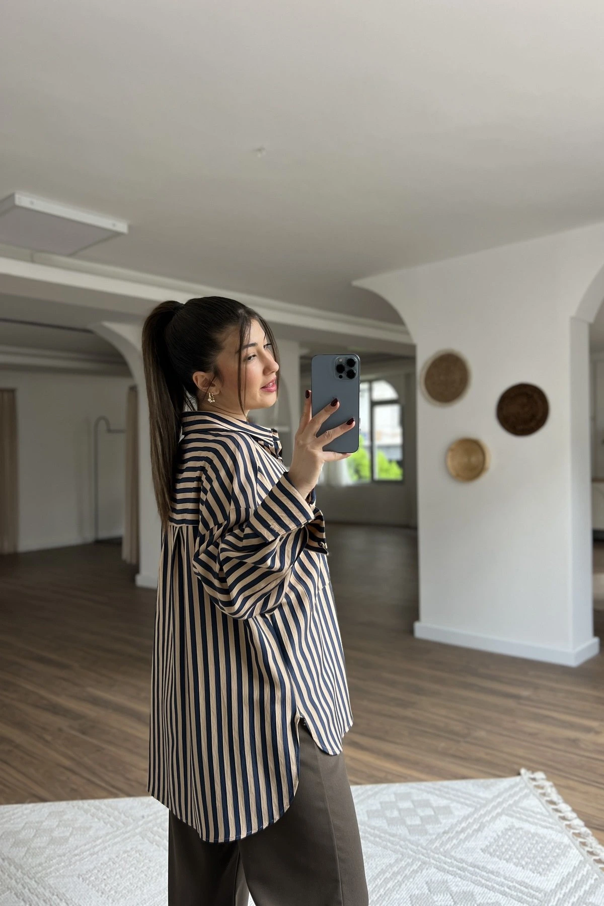 KUMAŞ DÜĞME ÇİZGİLİ GENİŞ MANŞET OVERSİZE VİSKON GÖMLEK – CAMEL LACİVERT