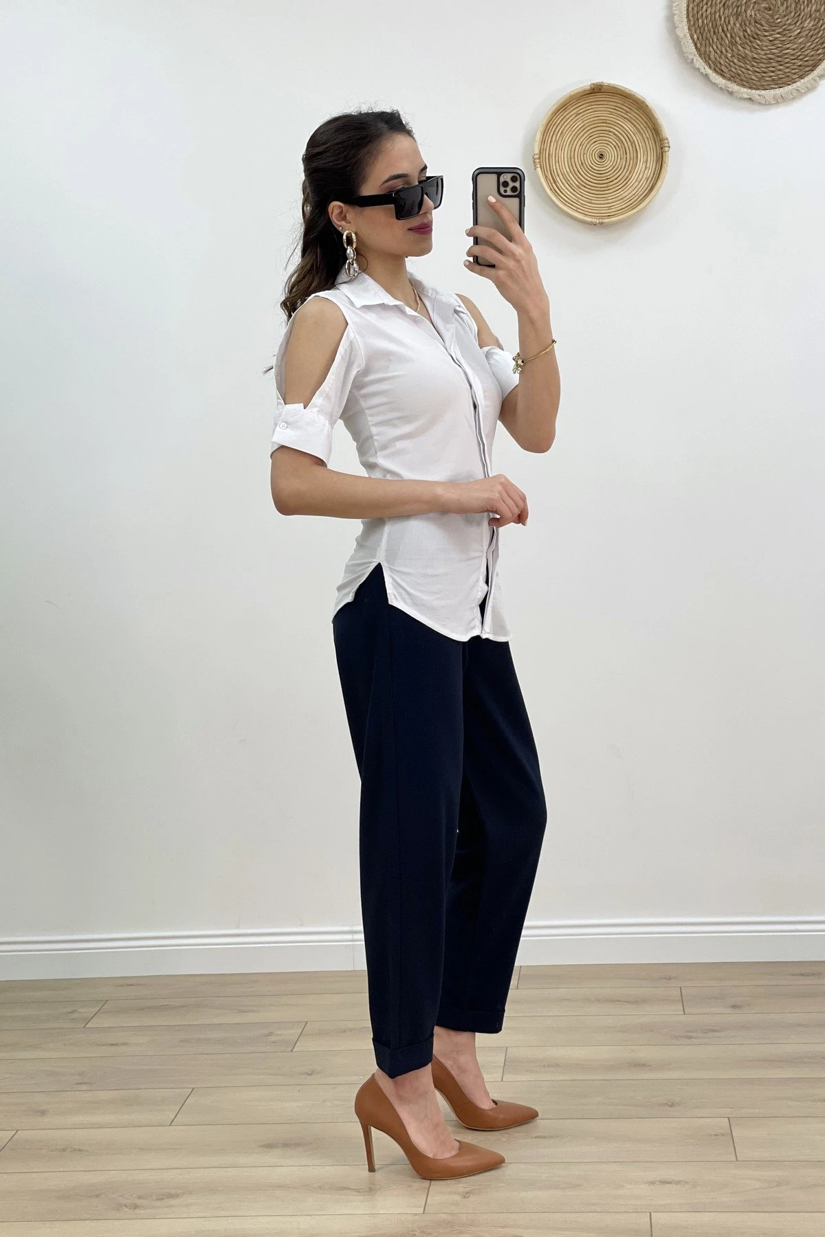 LİKRALI KOL DEKOLTELİ KISA KOL GÖMLEK – BEYAZ