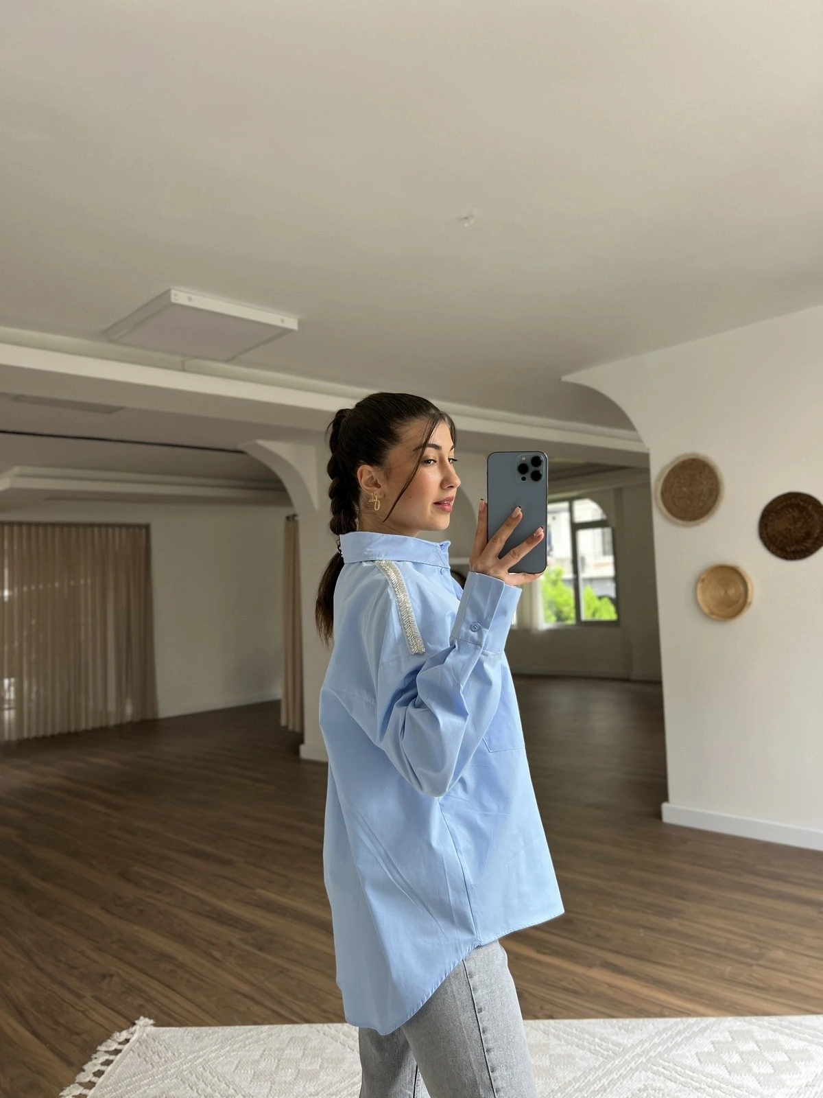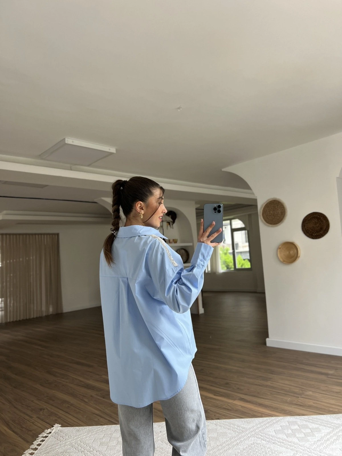 OMUZ BONCUK DETAY SALAŞ PAMUK GÖMLEK – MAVİ