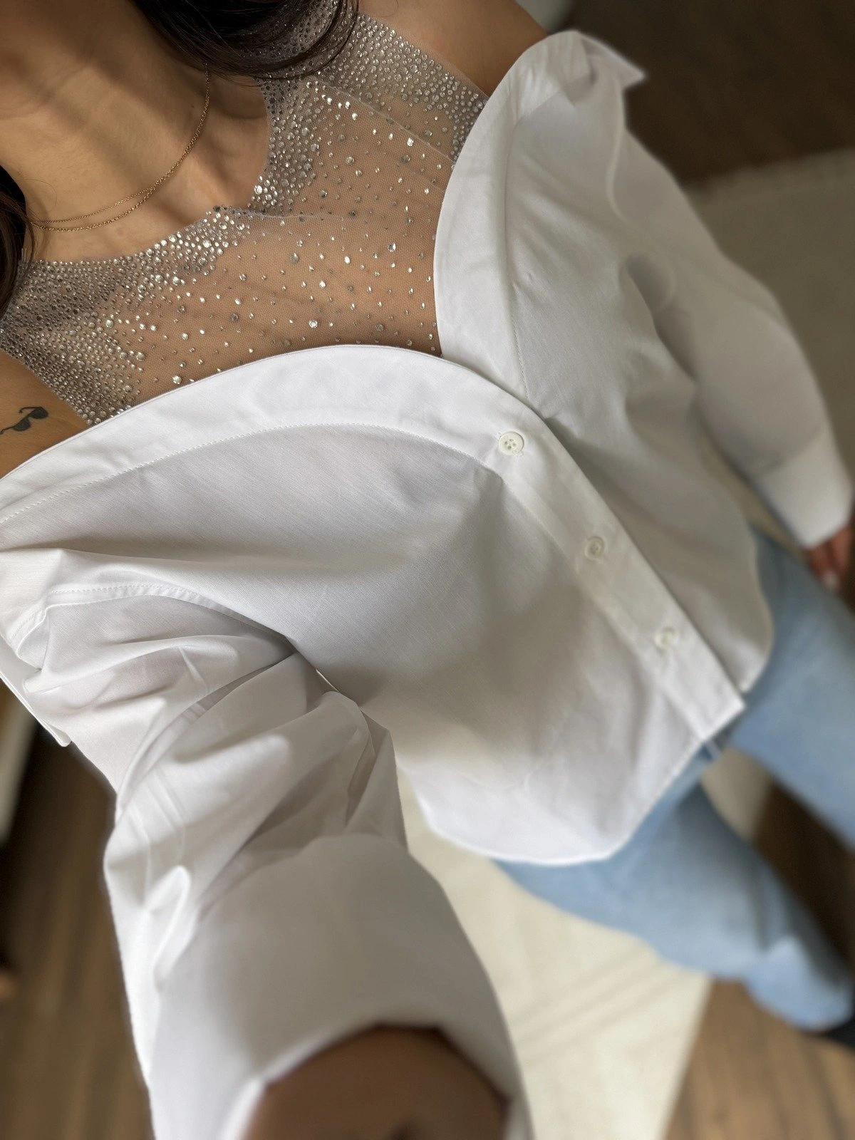OMUZ TÜL TAŞ BASKI MADONNA YAKA PAMUK GÖMLEK – BEYAZ