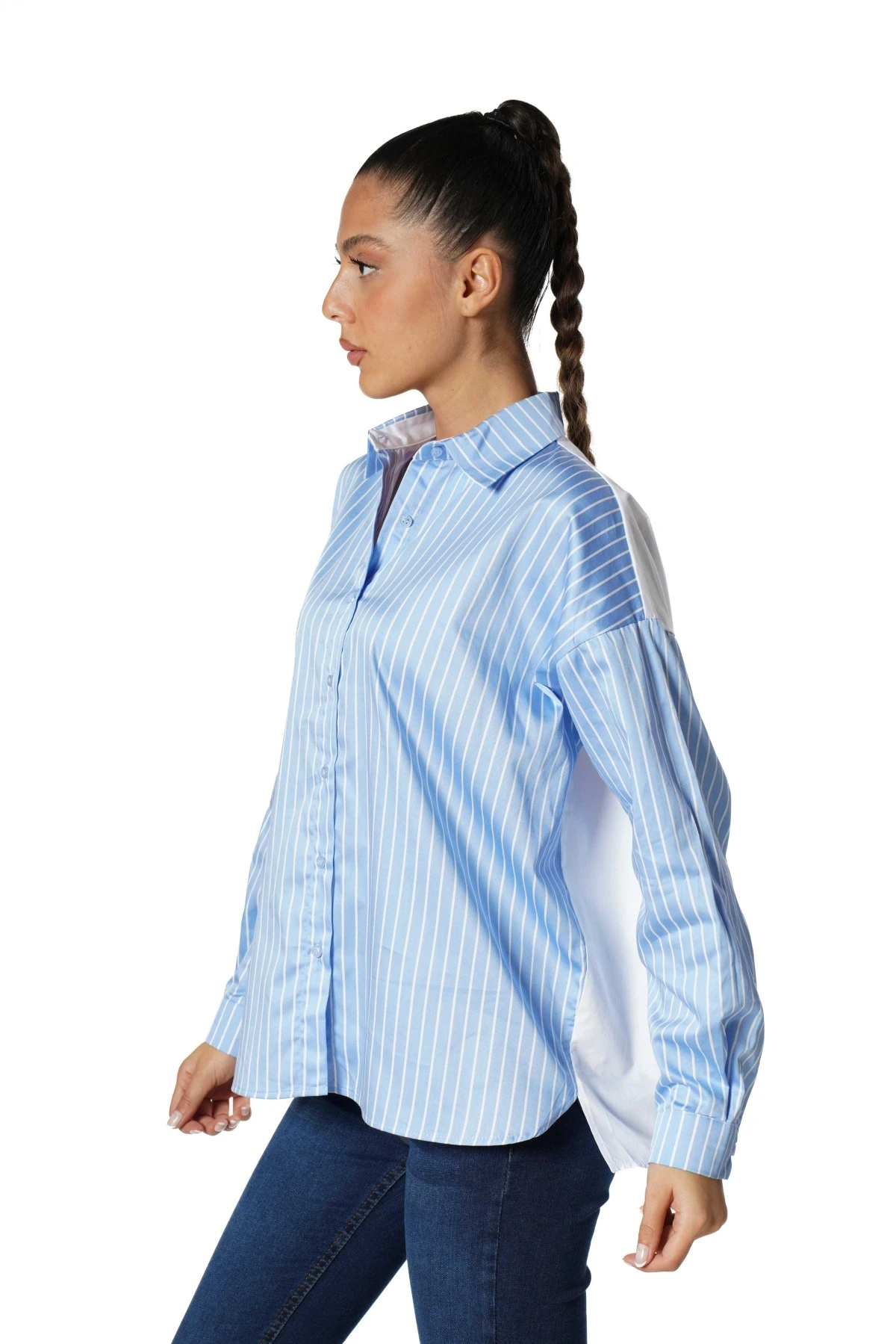 ÖN ÇİZGİLİ ARKA DÜZ RENK PAMUK GÖMLEK – MAVİ BEYAZ