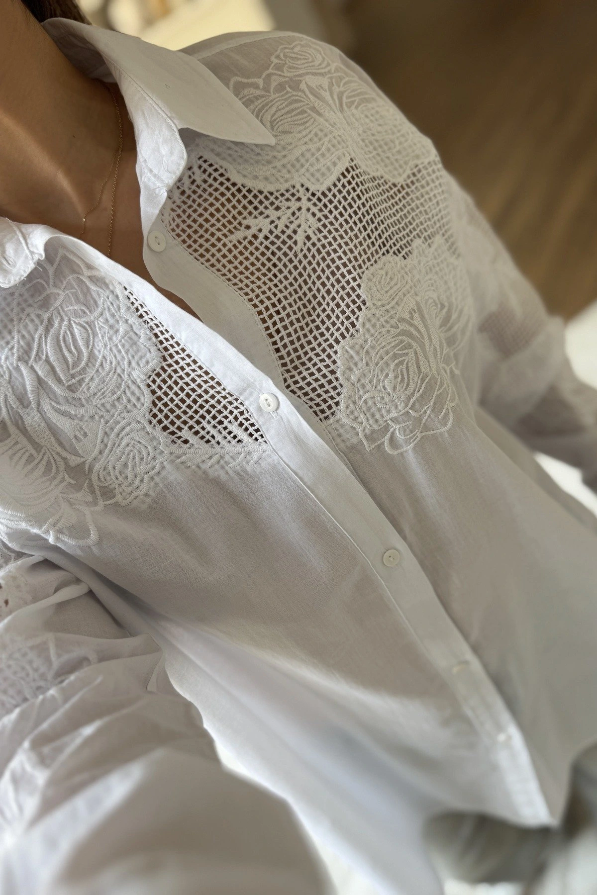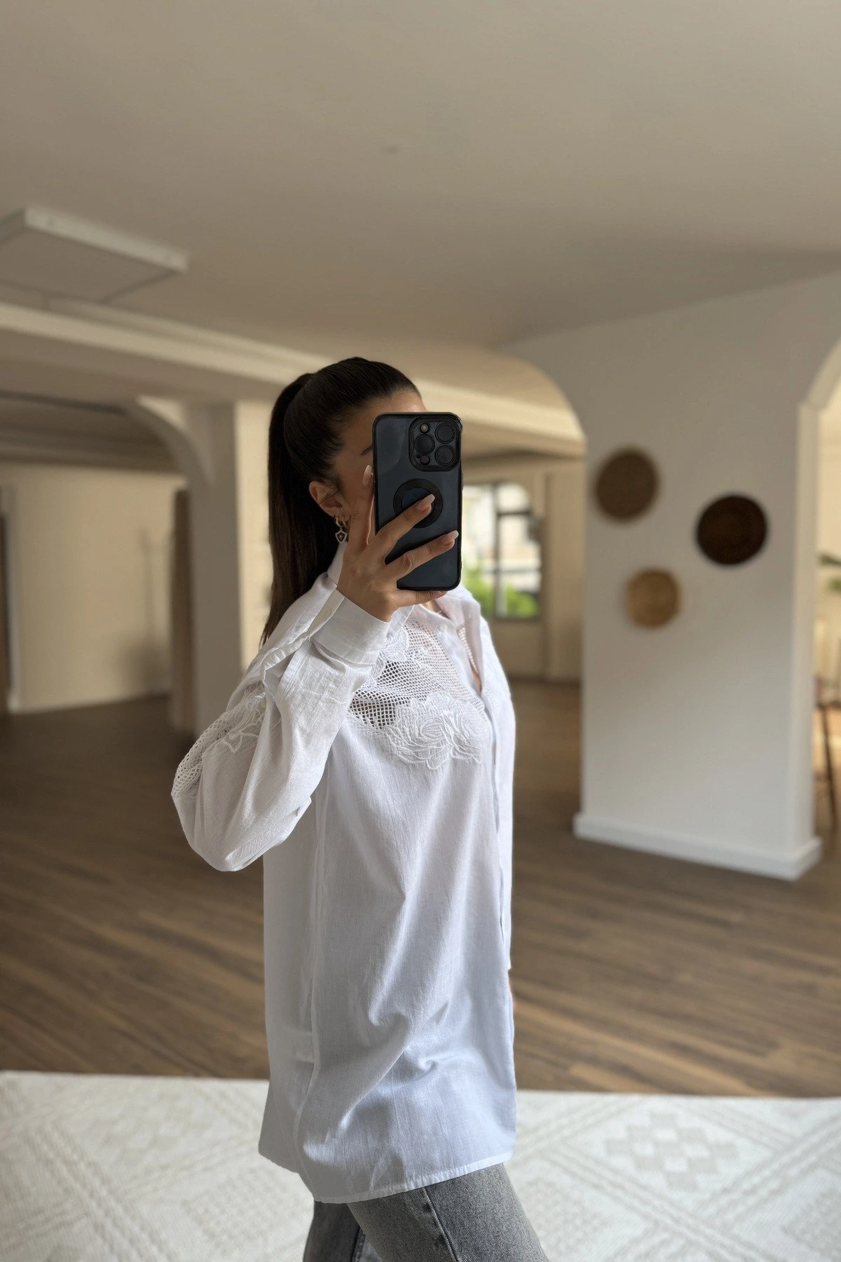 ÖN KOL GÜPÜR NAKIŞ İŞLEME PAMUK SALAŞ GÖMLEK – BEYAZ