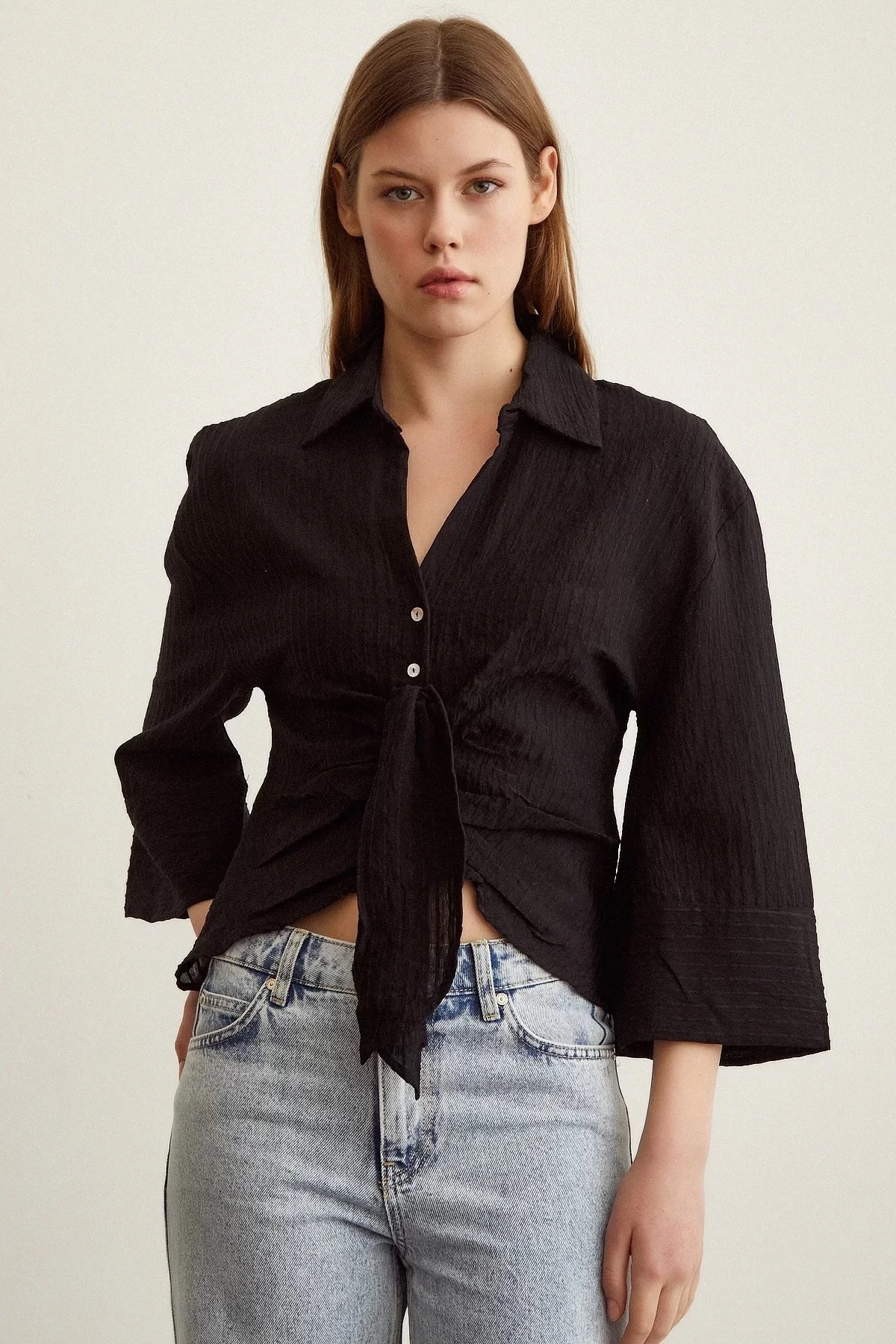 ÖNÜ BAĞLAMALI DOKULU ÇİZGİLİ VİSKON GÖMLEK – SİYAH
