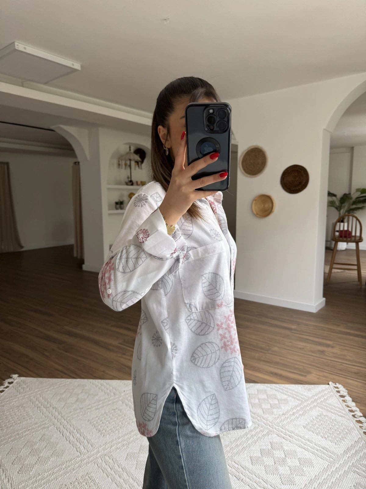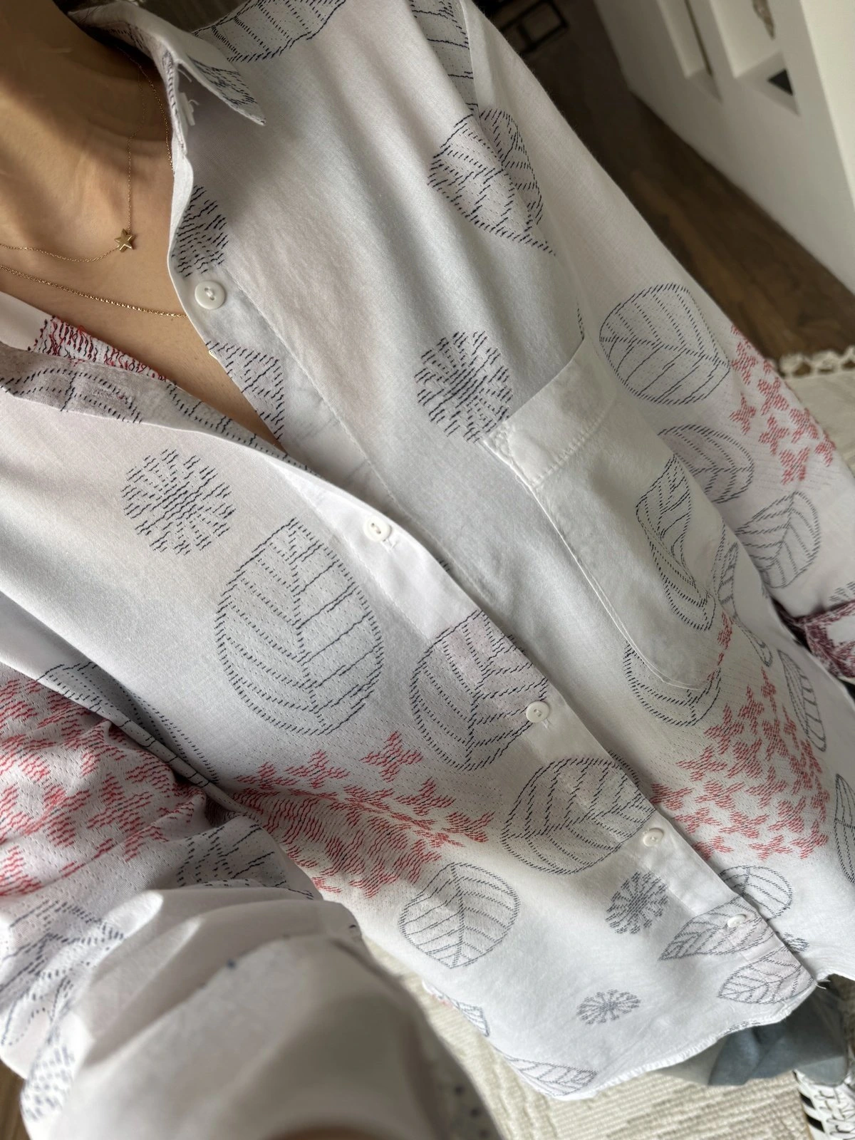 RENKLİ DOKU İŞLEME PAMUK VİSKON SALAŞ GÖMLEK – BEYAZ-KIRMIZI