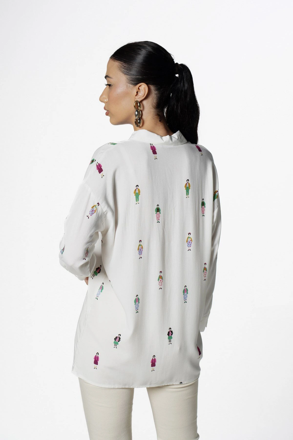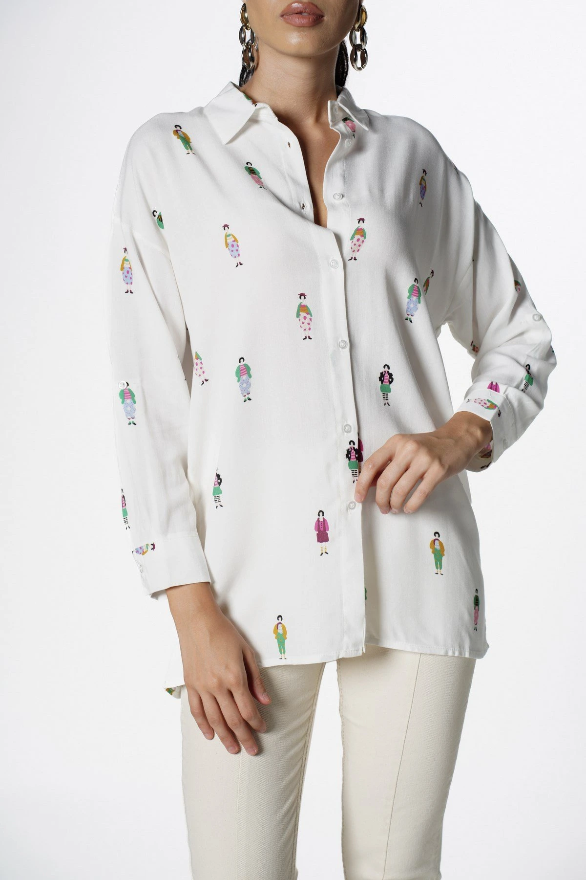 RENKLİ KADIN FİGÜR BASKI PAMUK GÖMLEK – EKRU