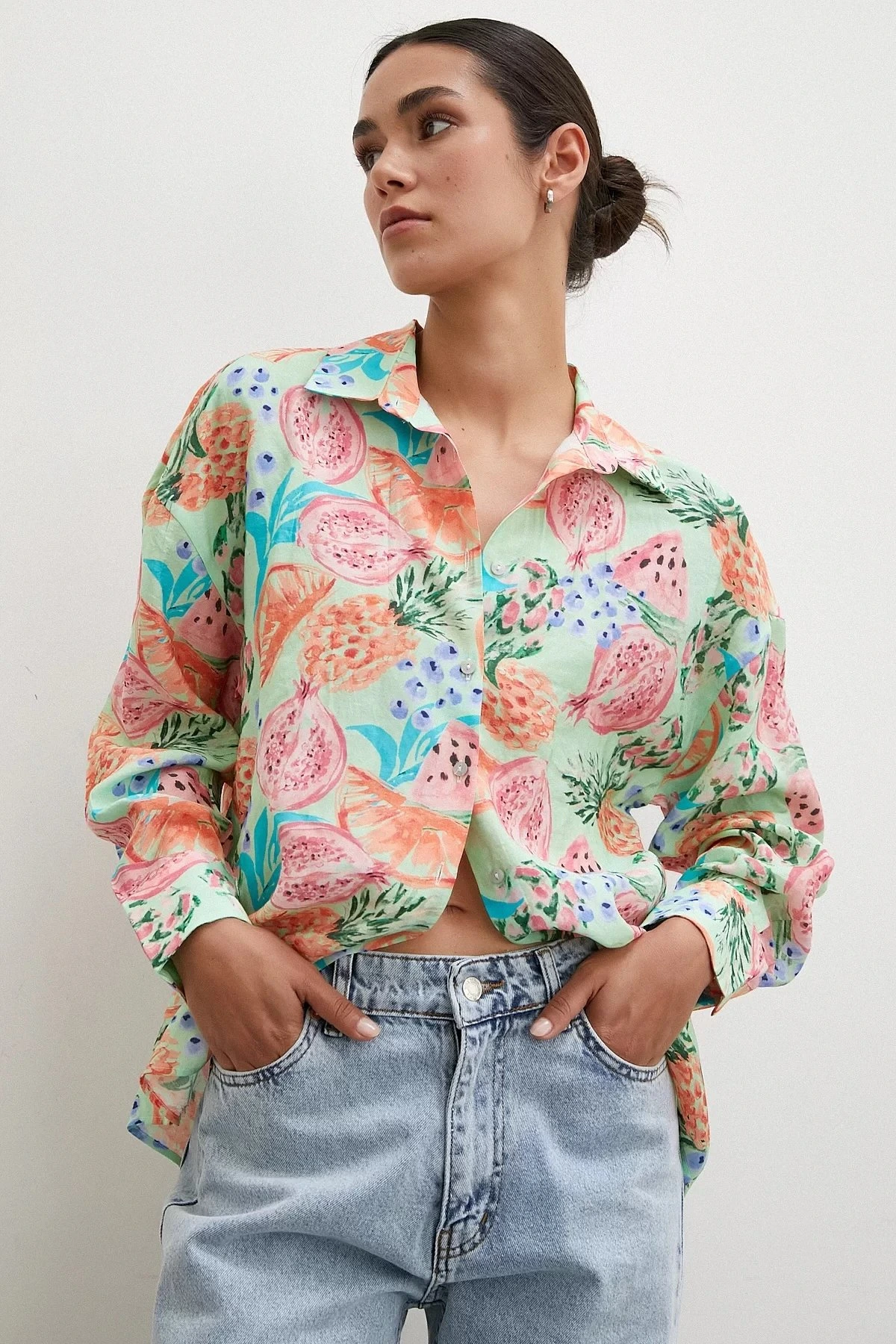 RENKLİ MEYVE DESEN MODAL GÖMLEK – YEŞİL
