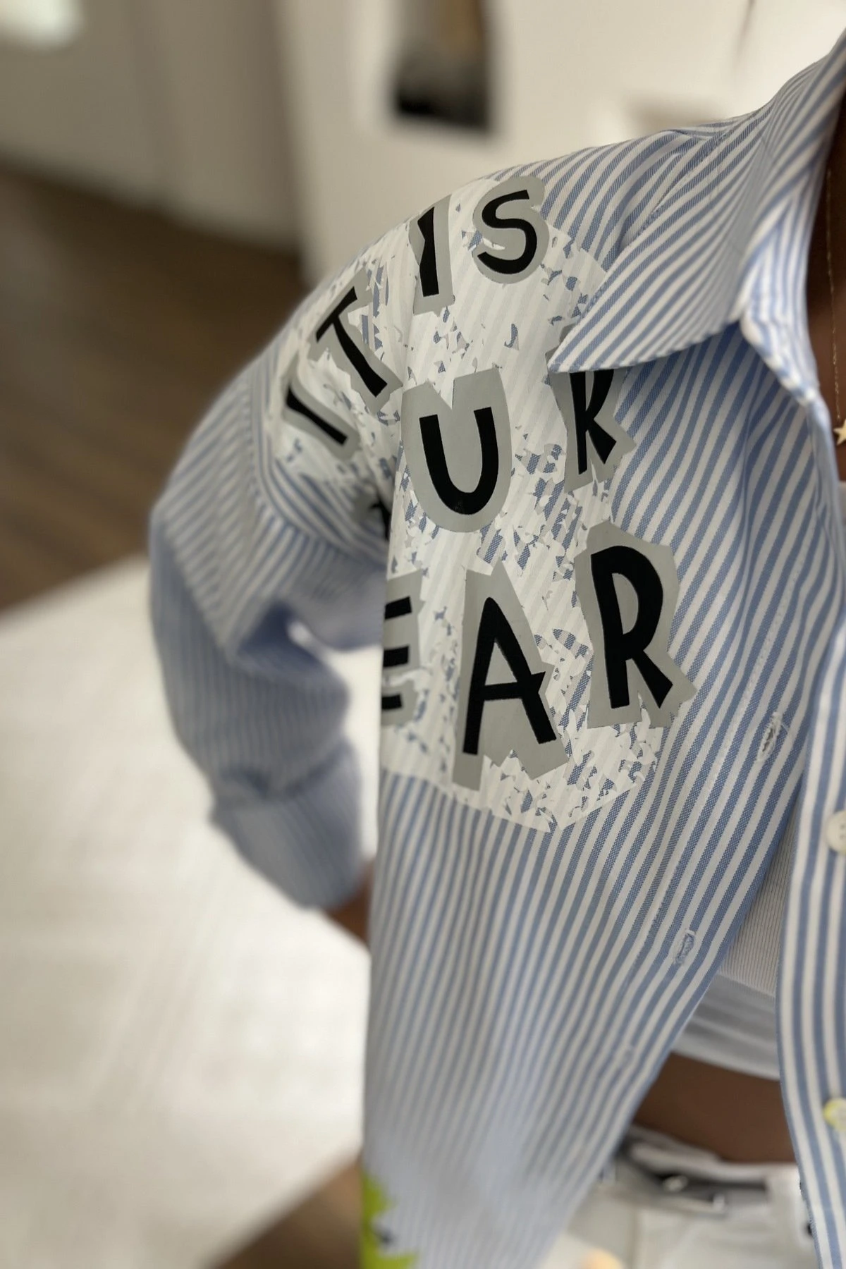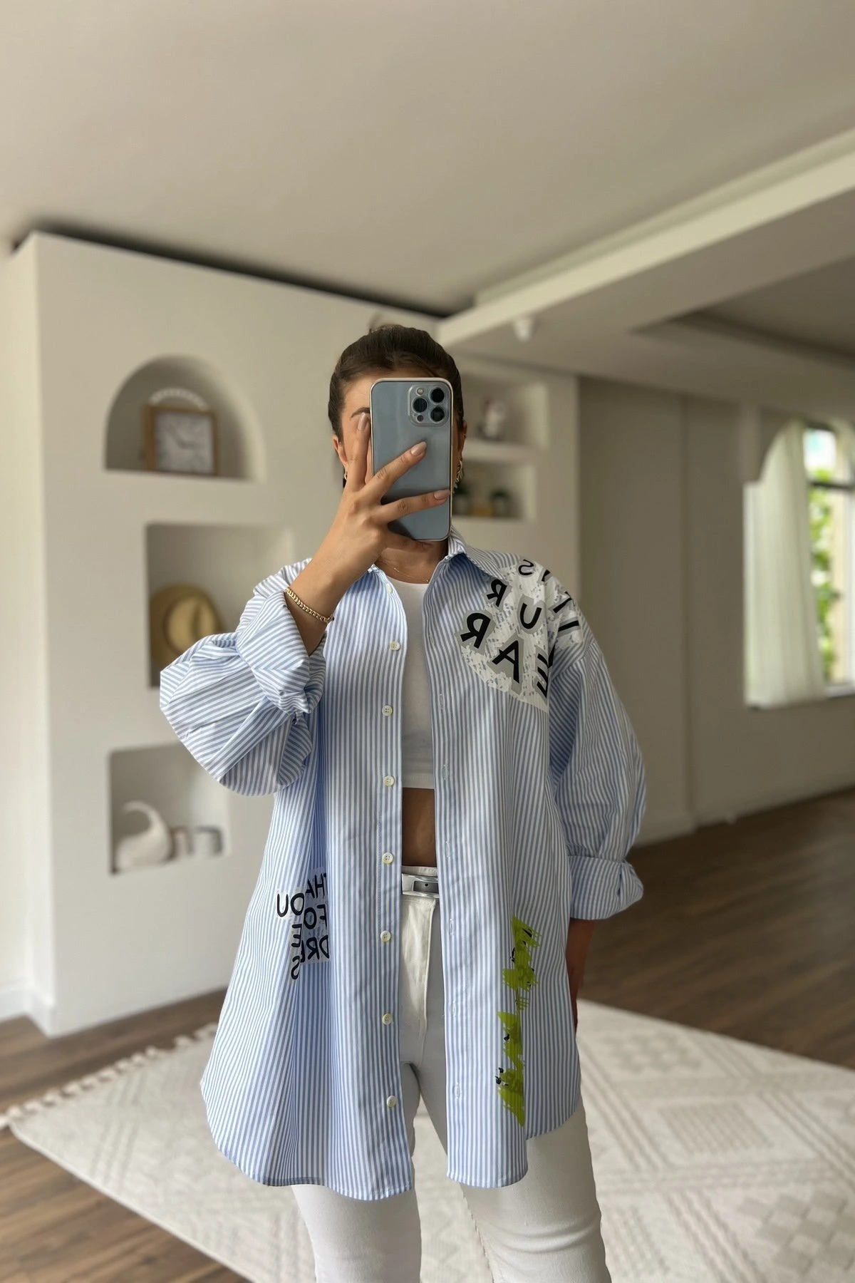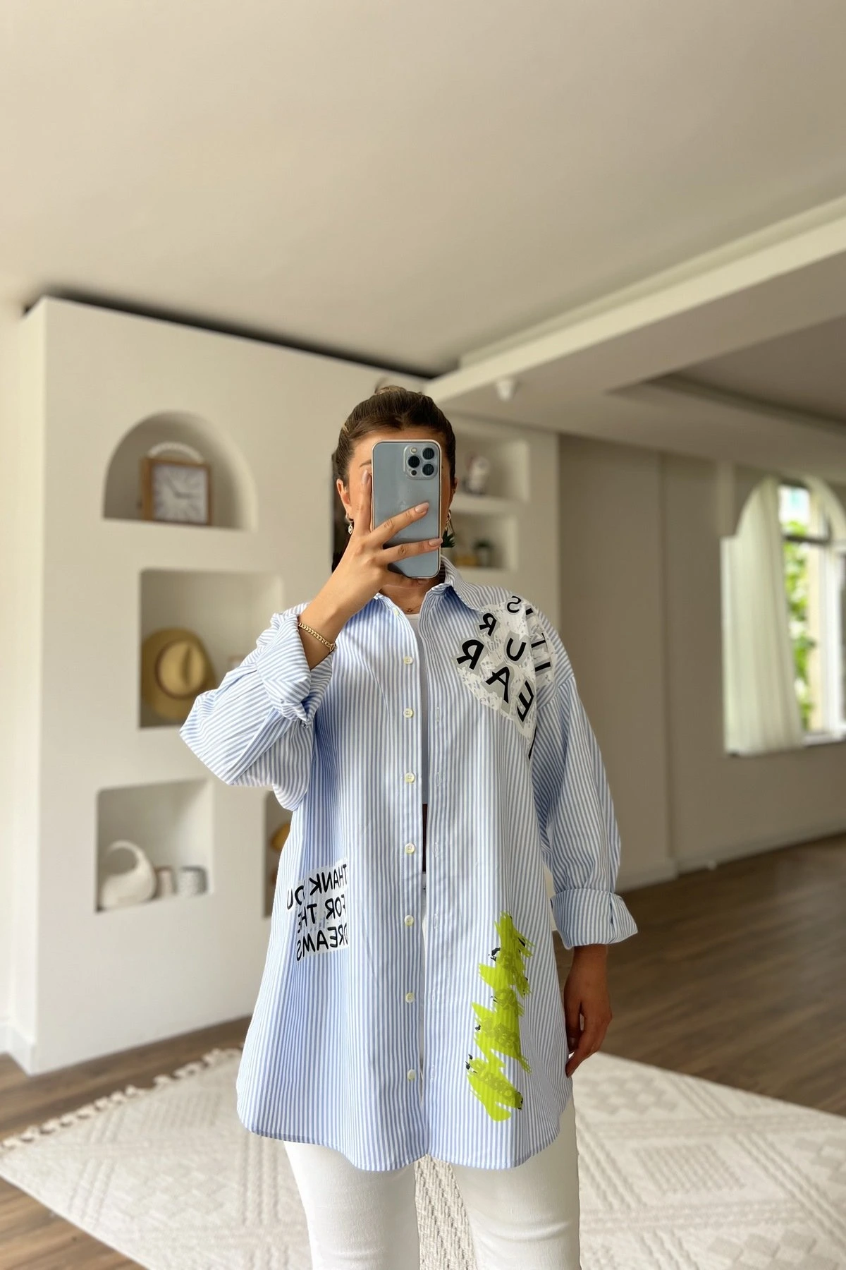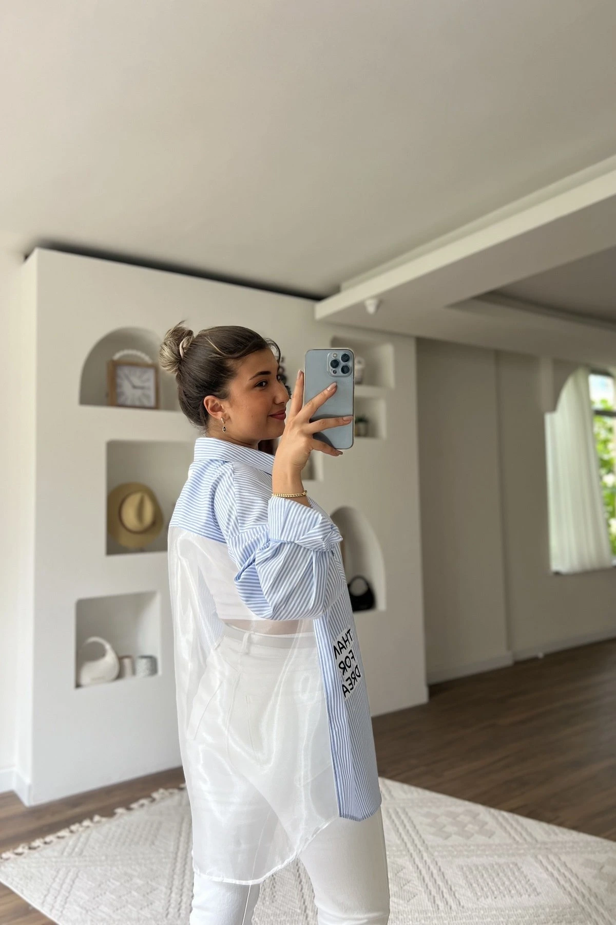 RENKLİ YAZI BASKI SIRT ORGANZE ÇİZGİLİ PAMUK GÖMLEK – MAVİ