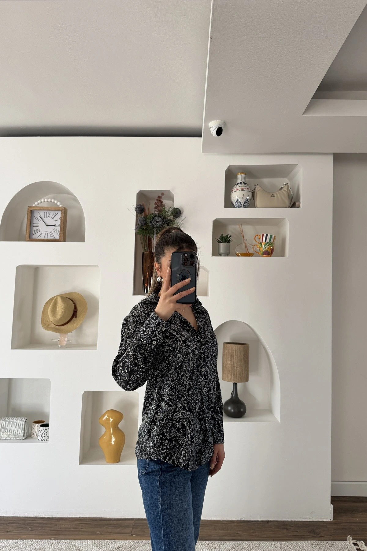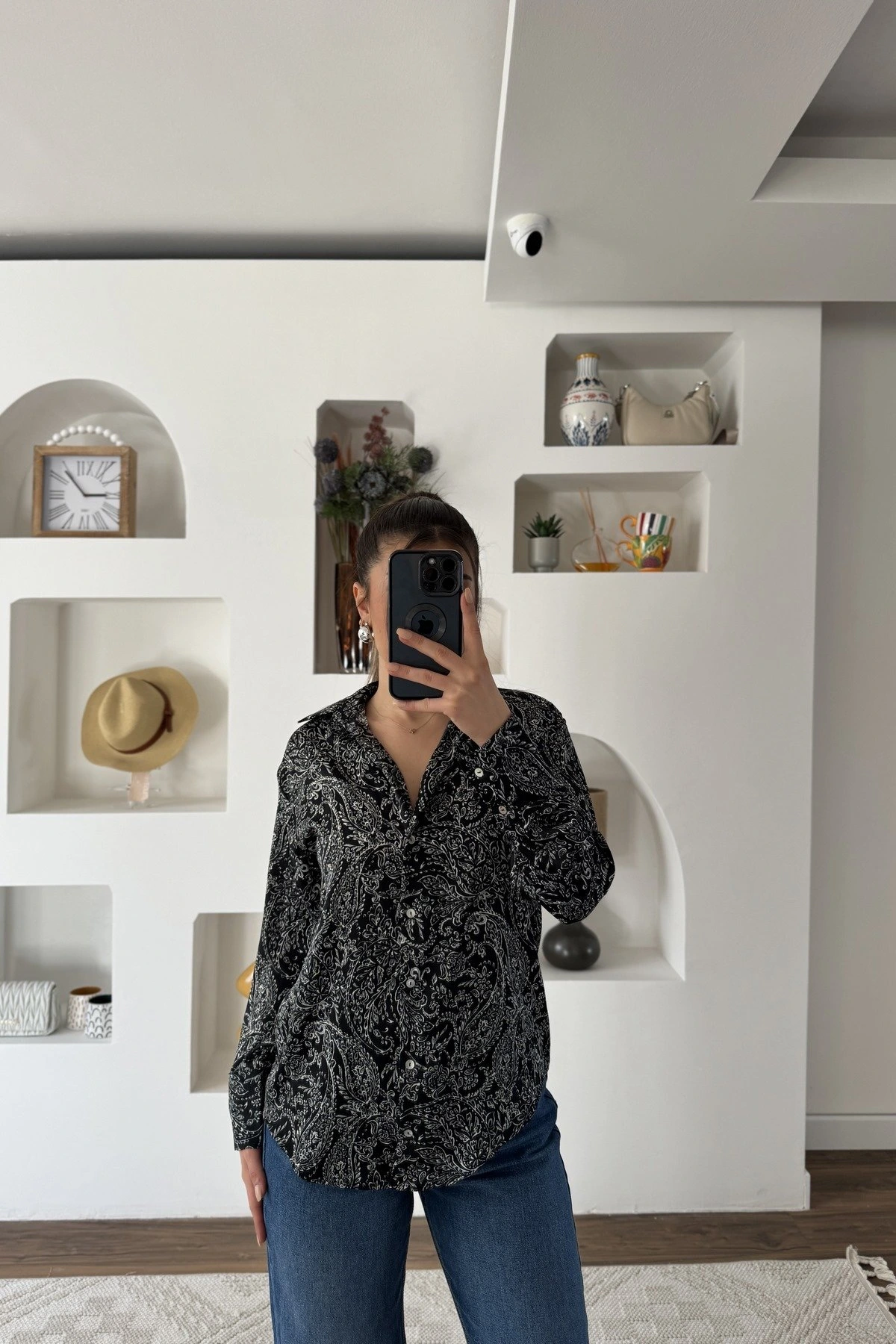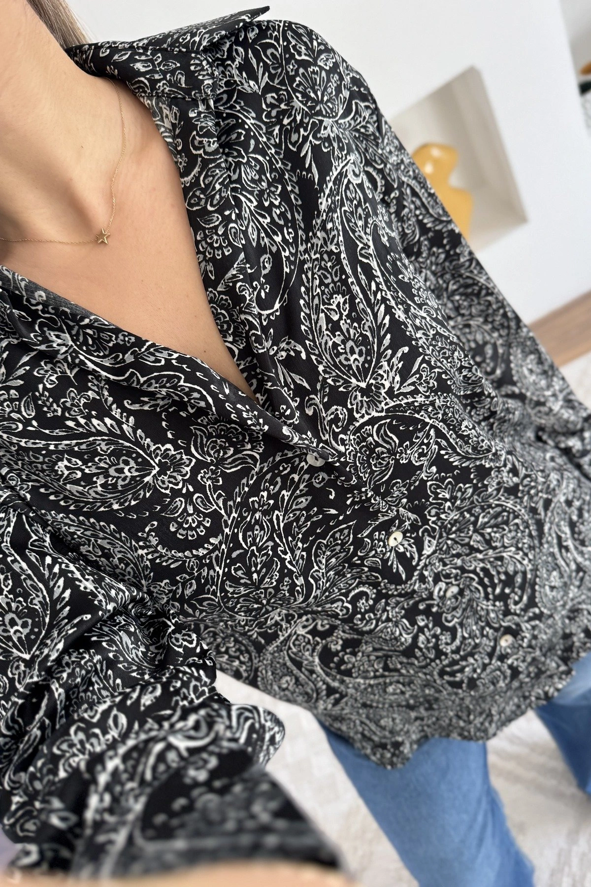ŞAL DESEN V YAKA SATEN GÖMLEK – SİYAH