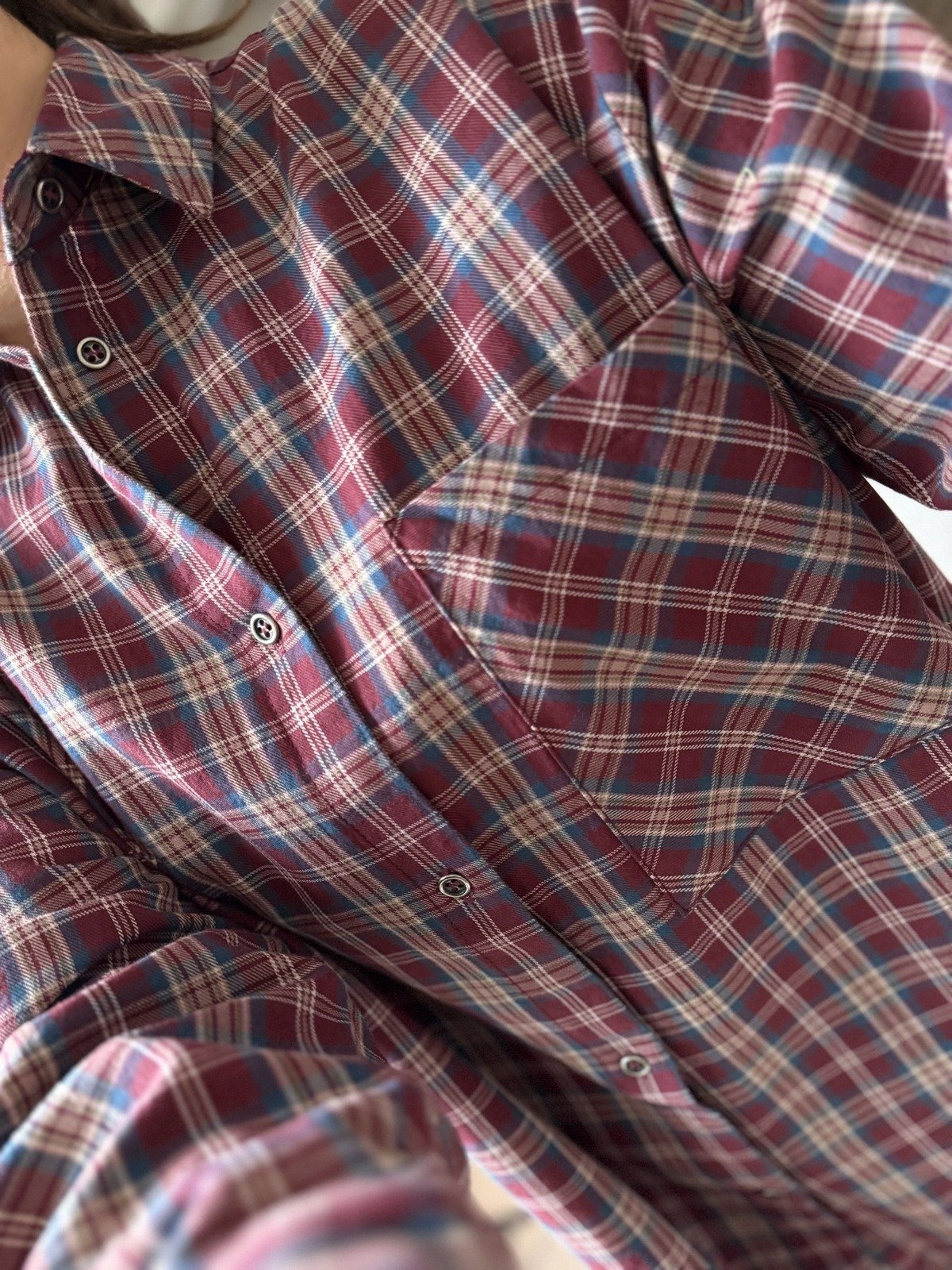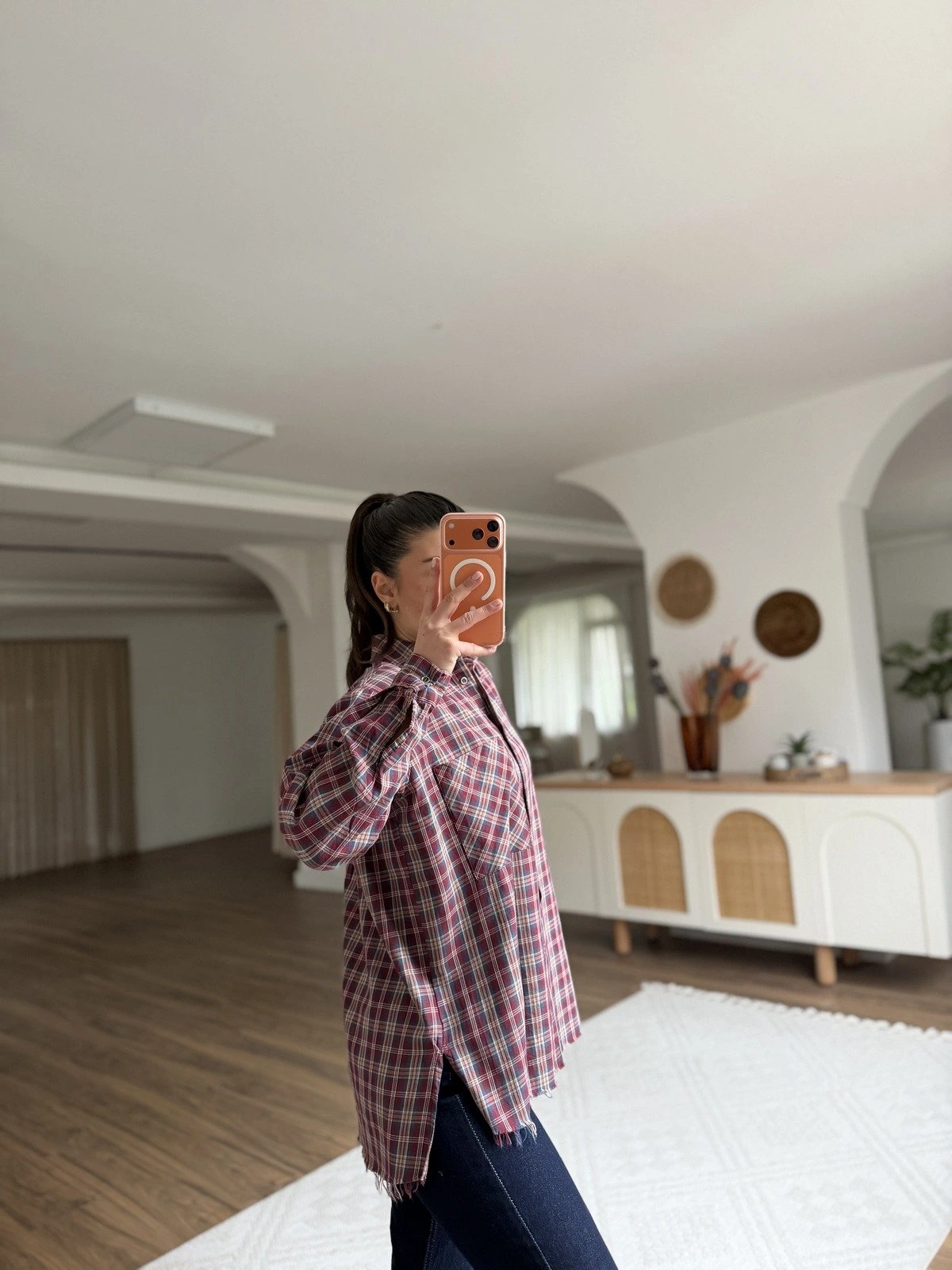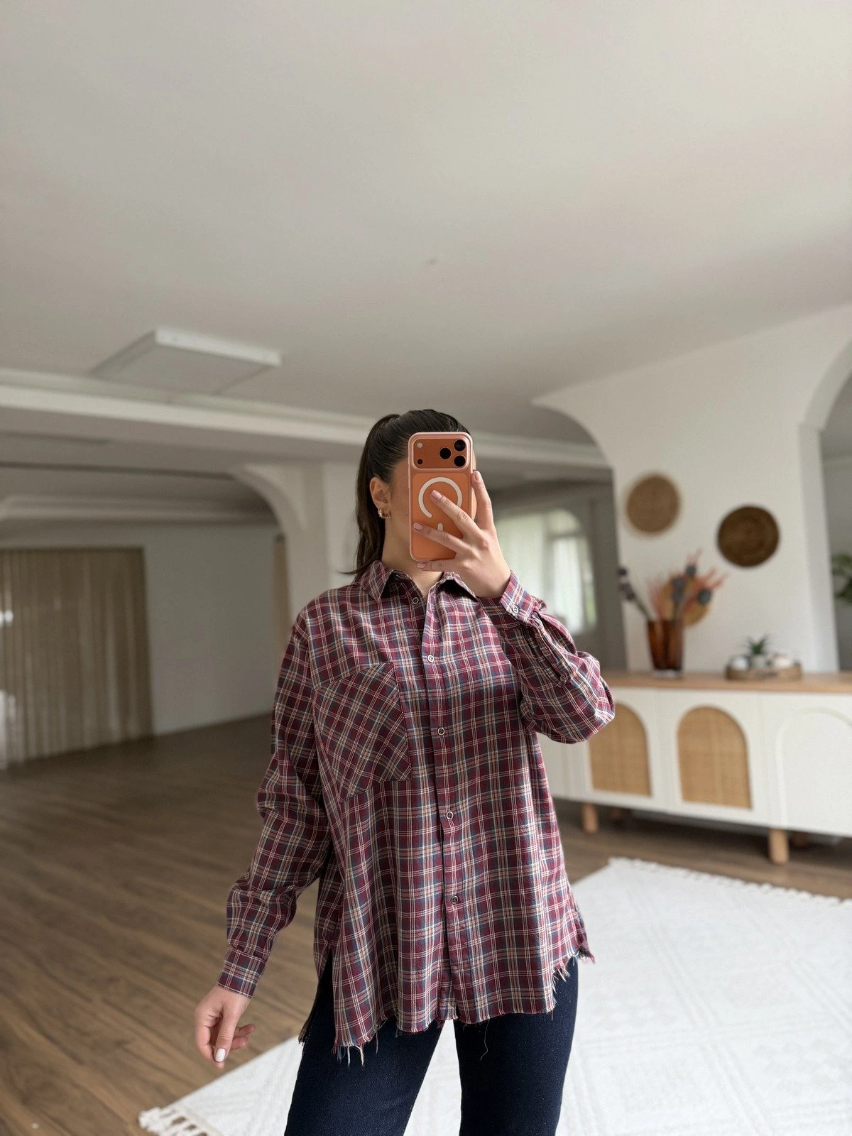 SIK ÇİZGİ TEK CEP ETEĞİ PÜSKÜL PAMUK GÖMLEK – BORDO