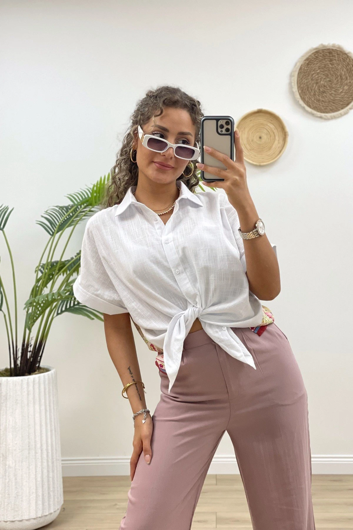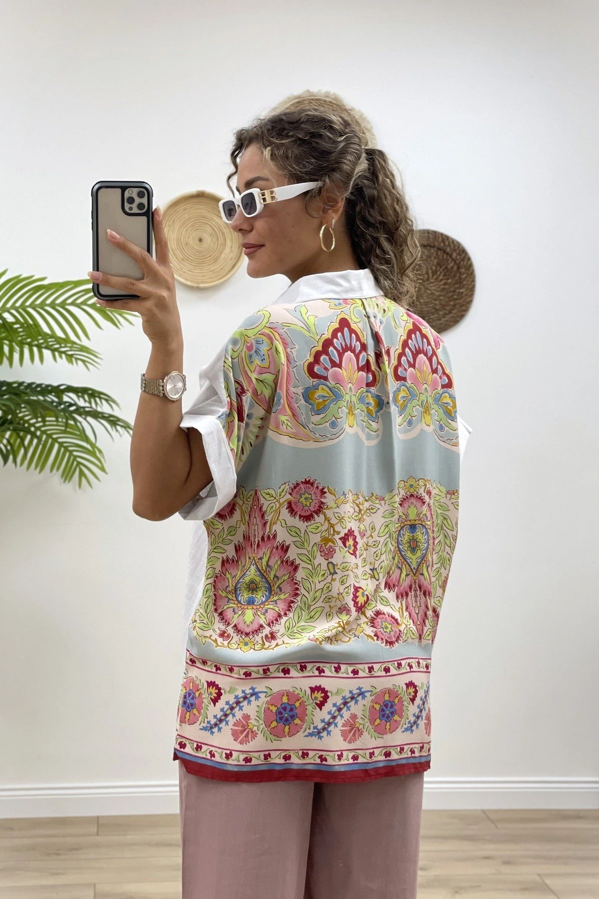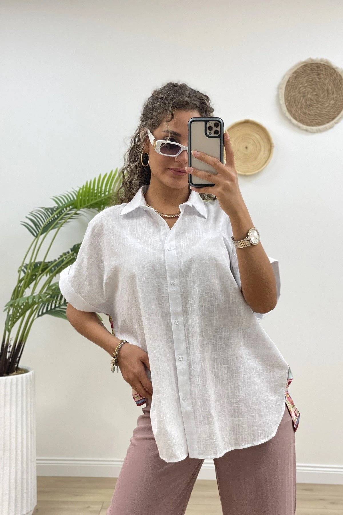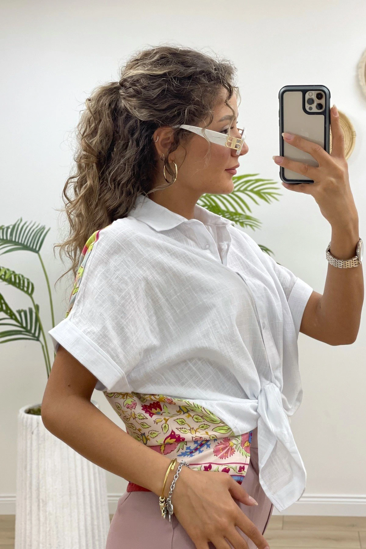 SIRT ÇİÇEK DESEN PANO KISA KOL GÖMLEK – BEYAZ
