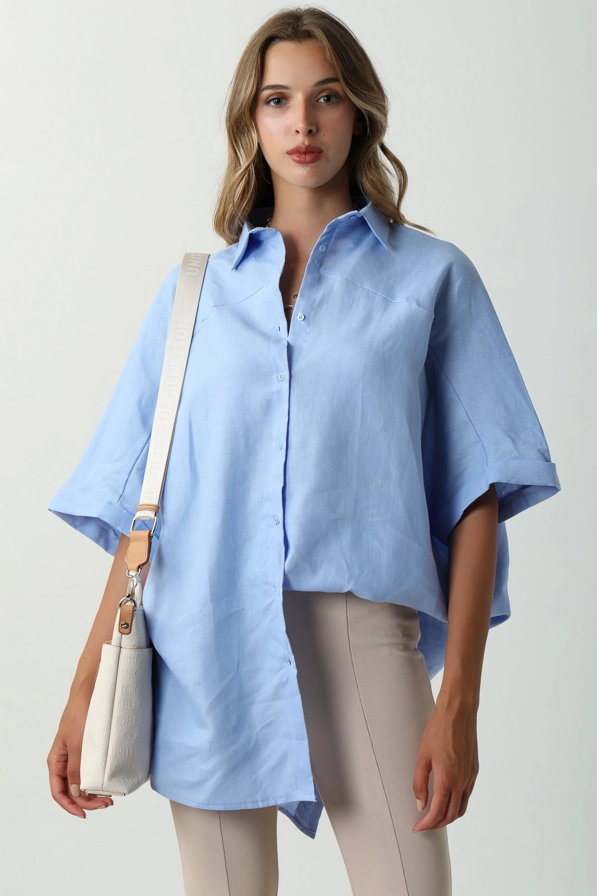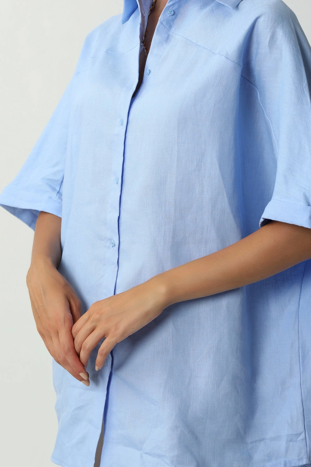 SIRT PENCERELİ KETEN GÖMLEK – AÇIK MAVİ