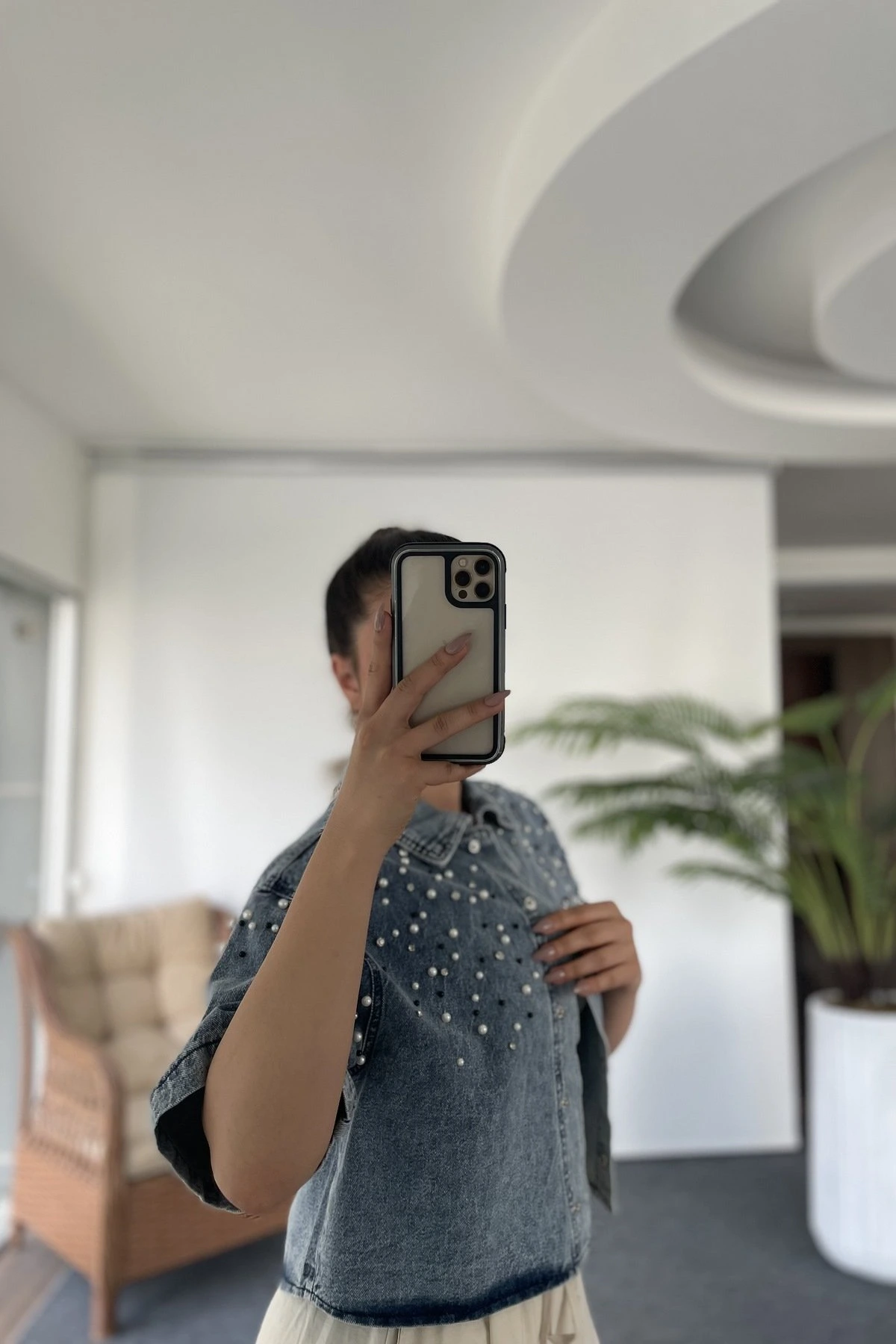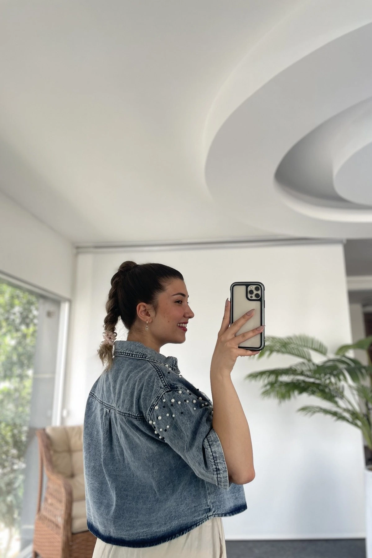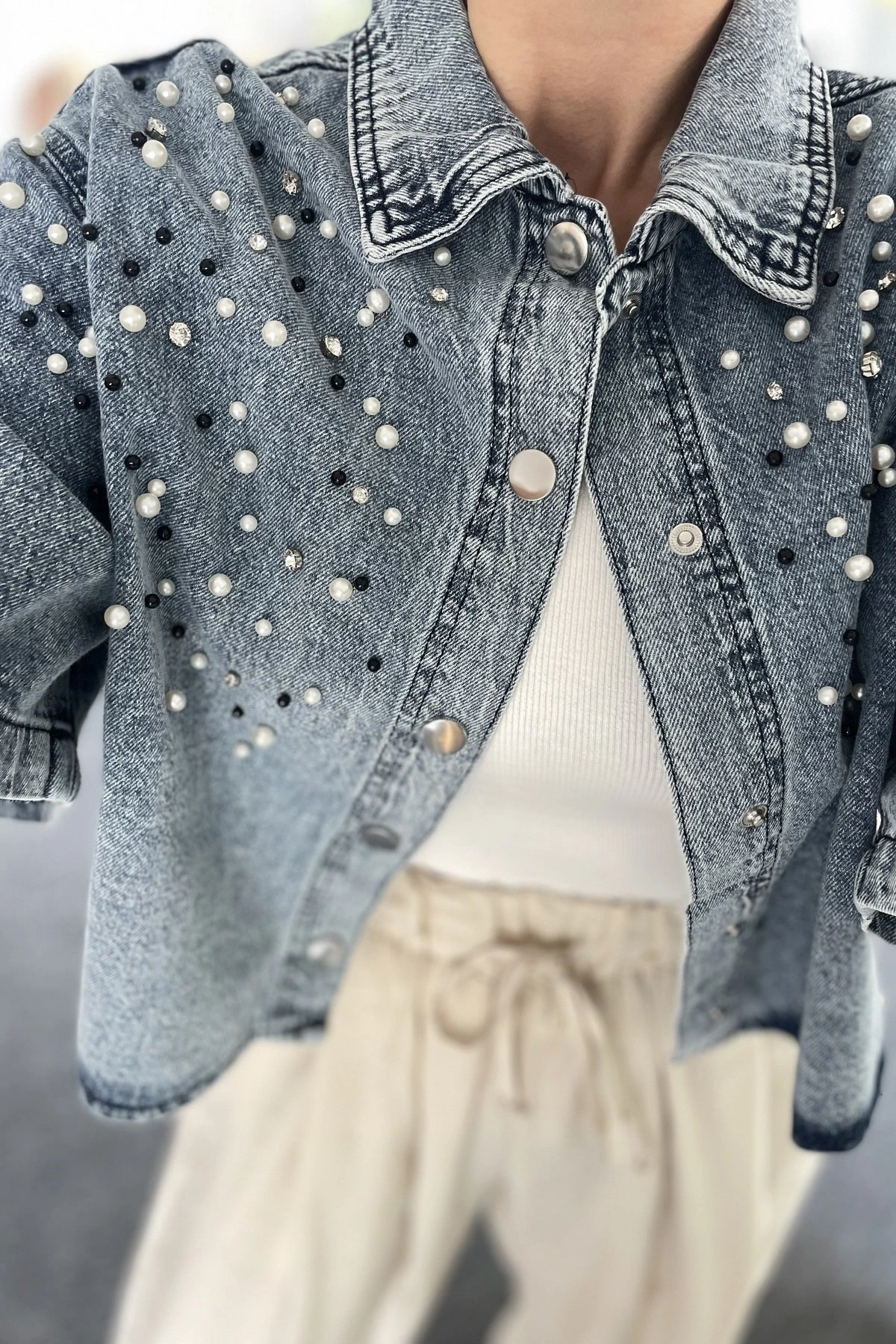 TAŞ VE İNCİ ÇAKIM CROP JEAN GÖMLEK CEKET – MAVİ