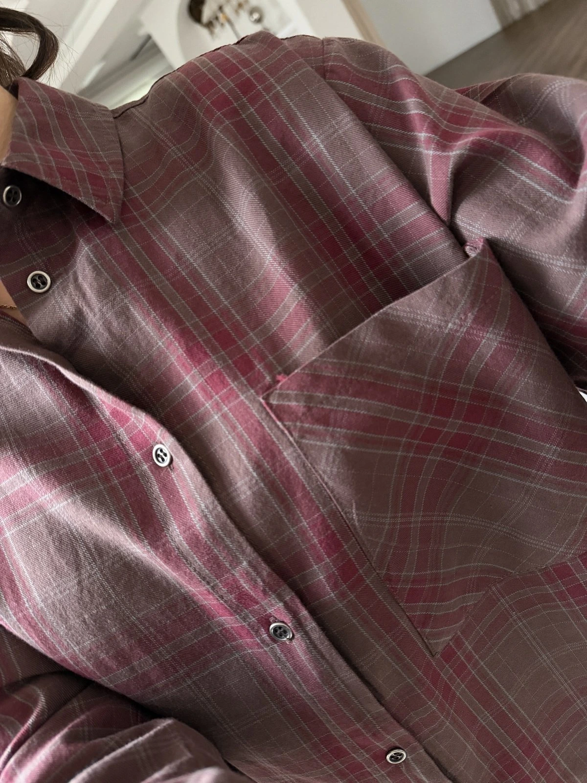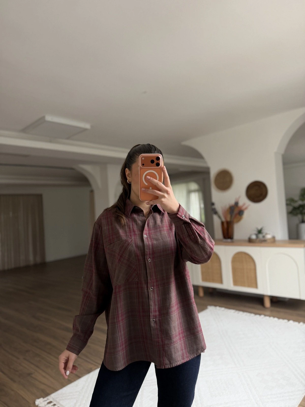TEK CEP ÇİZGİLİ ETEĞİ OVAL PAMUK GÖMLEK – KAHVE-BORDO