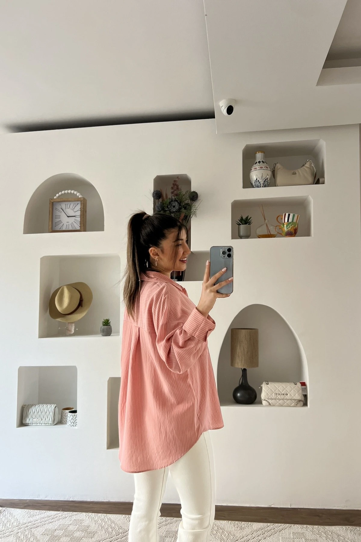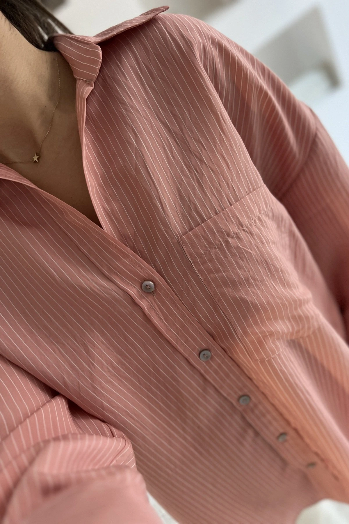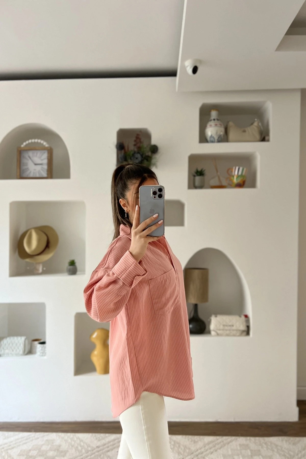 TEK CEP ÇİZGİLİ OVERSİZE V YAKA PAMUK GÖMLEK – GÜL KURUSU