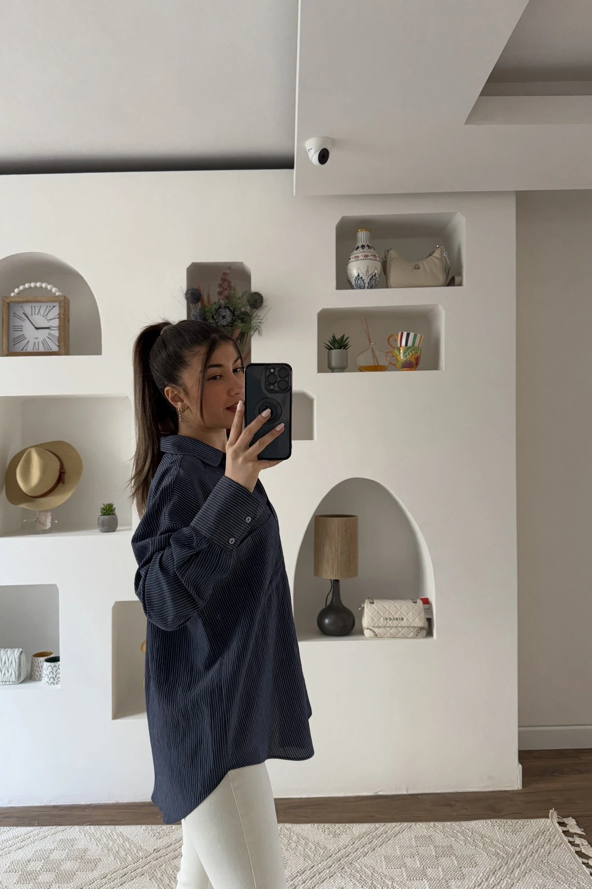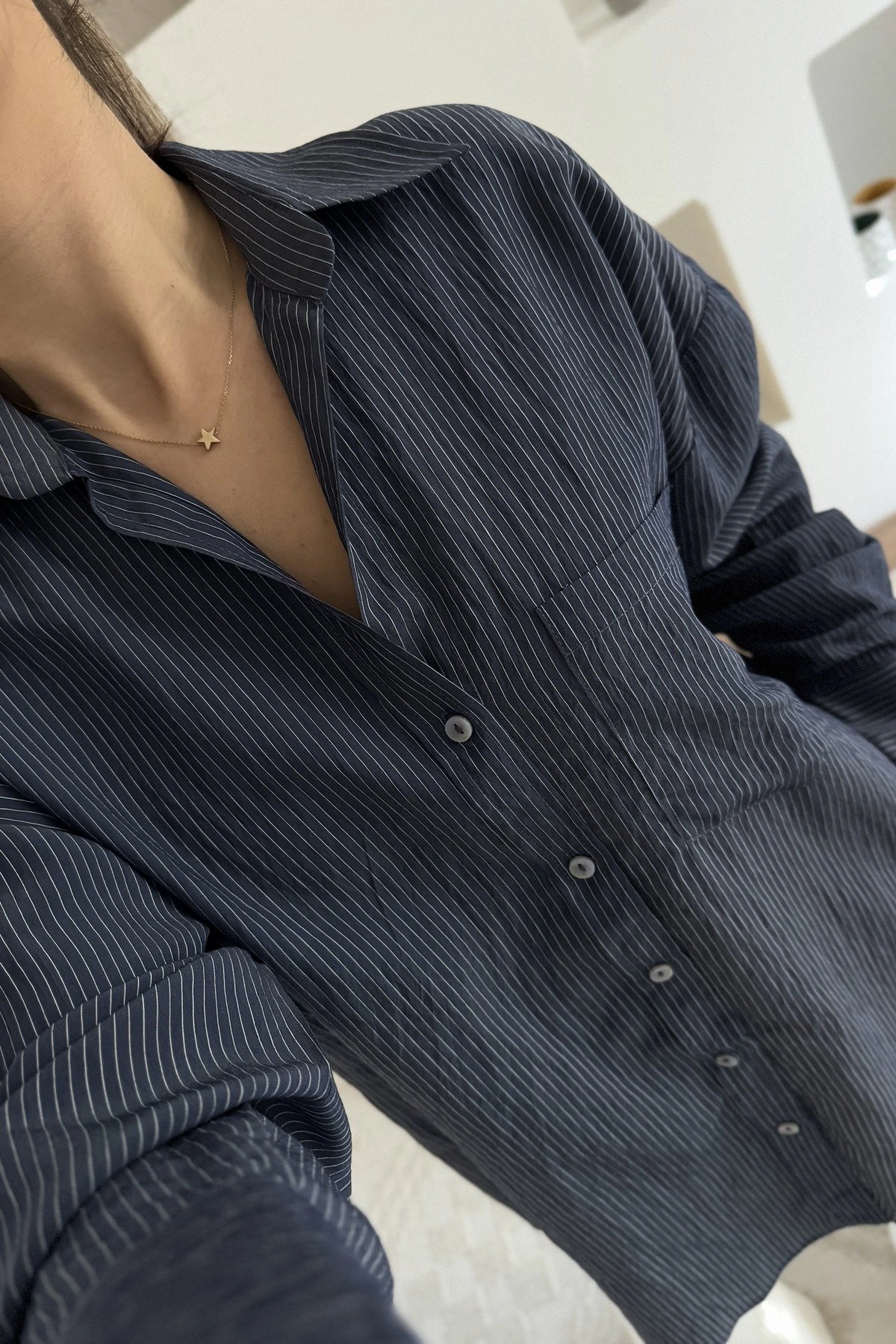TEK CEP ÇİZGİLİ OVERSİZE V YAKA PAMUK GÖMLEK – LACİVERT