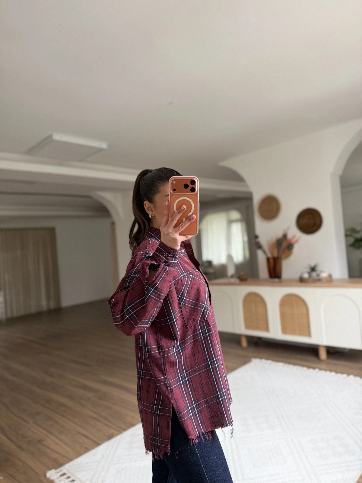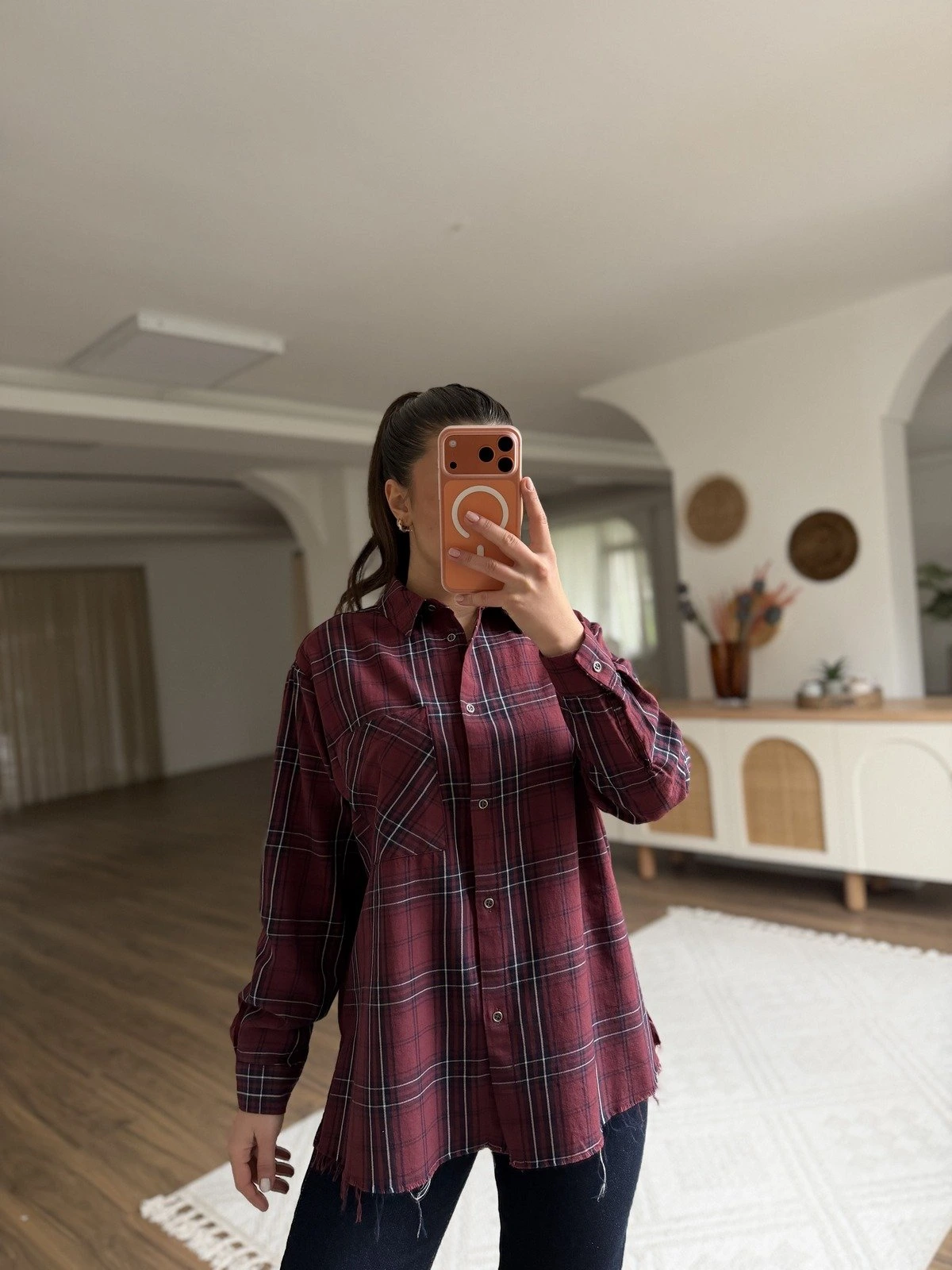 TEK CEP ETEĞİ PÜSKÜL ÇİZGİLİ PAMUK GÖMLEK – BORDO