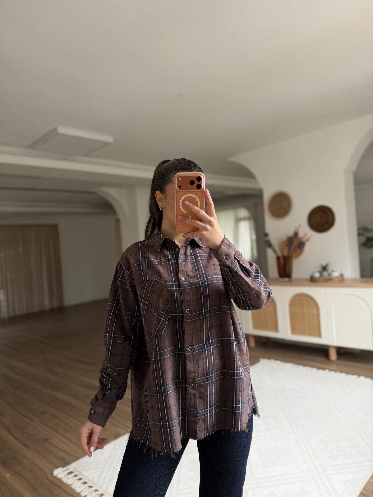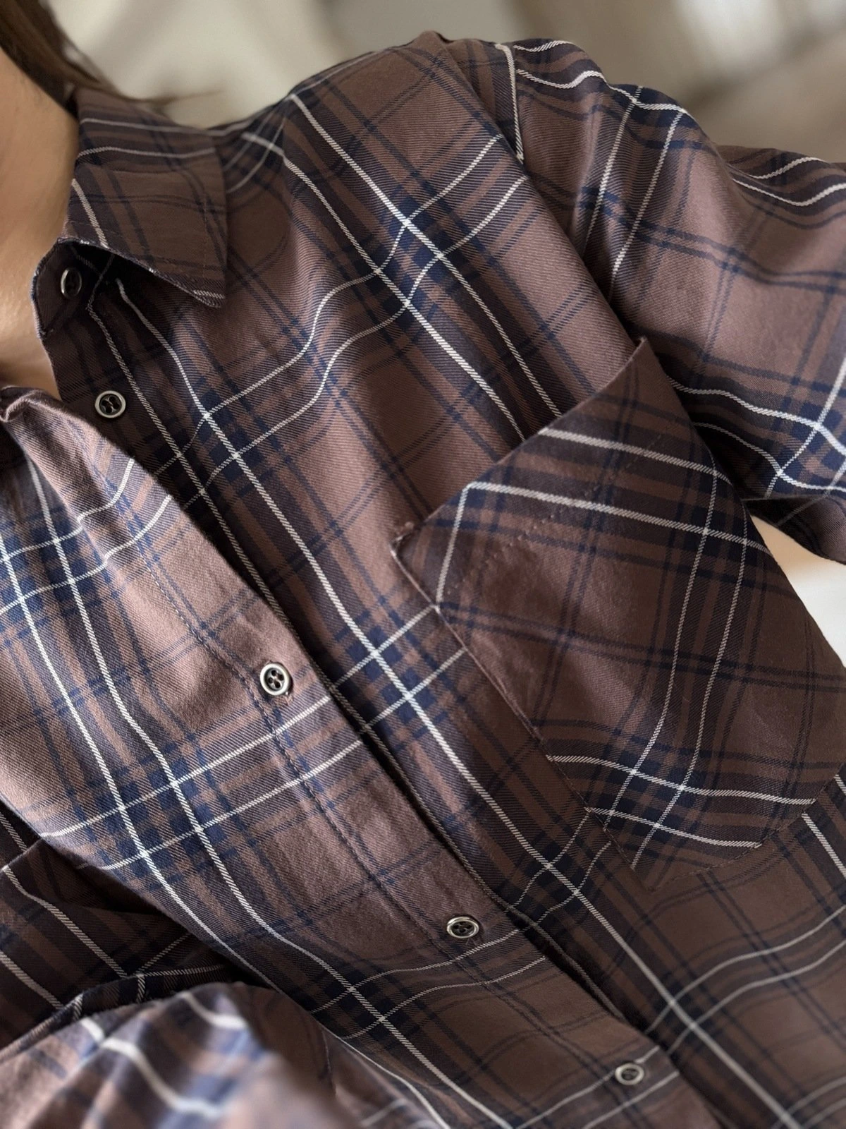 TEK CEP ETEĞİ PÜSKÜL ÇİZGİLİ PAMUK GÖMLEK – KAHVE