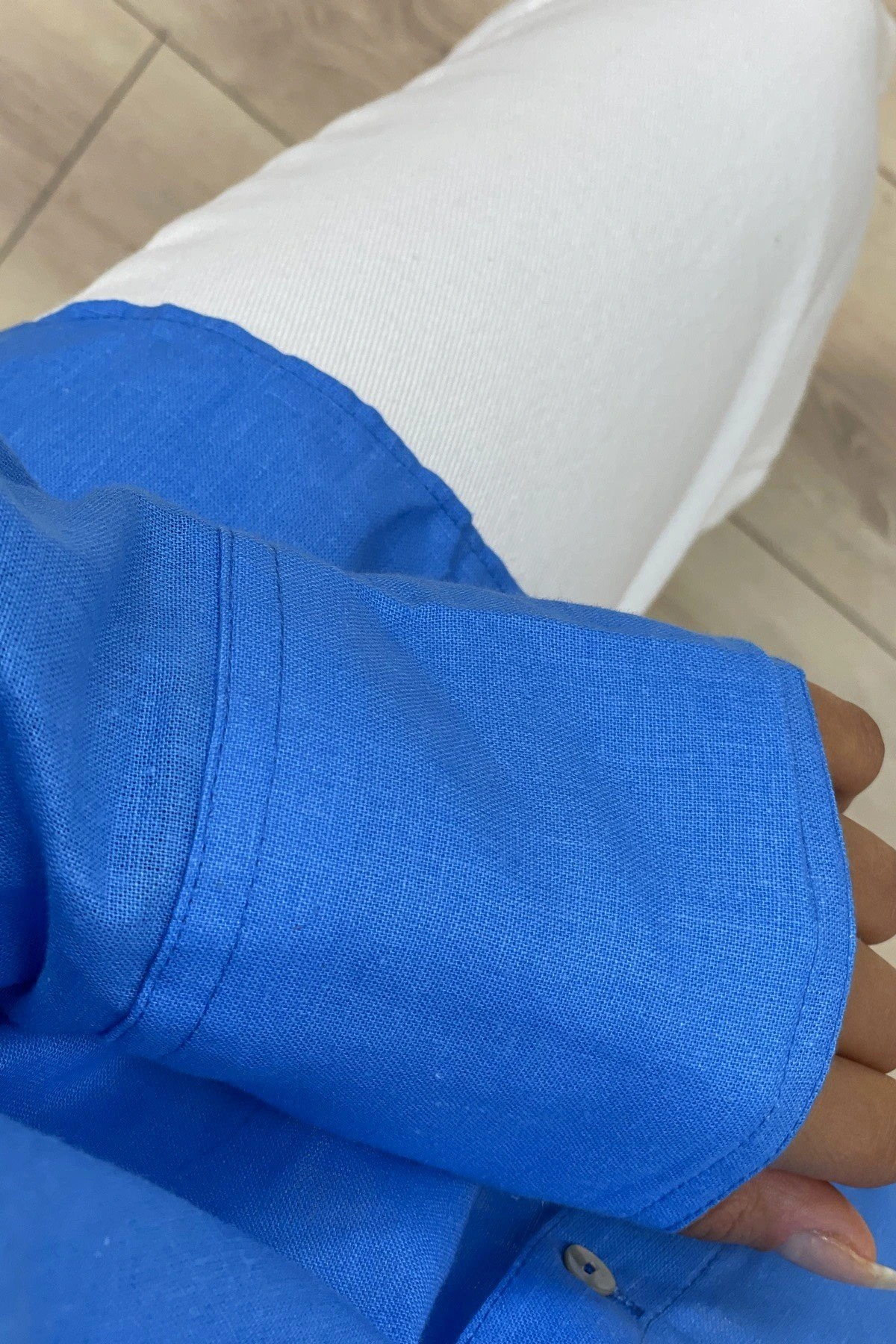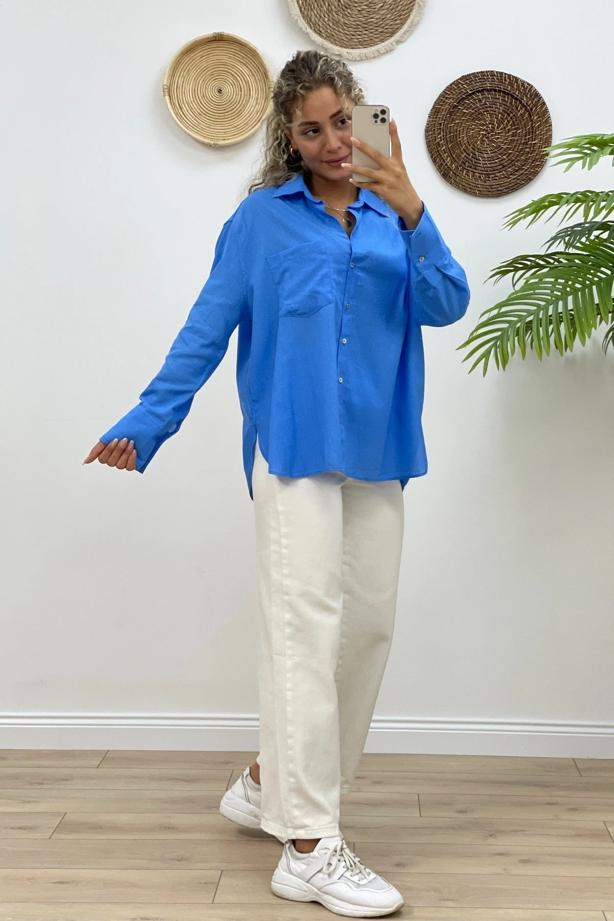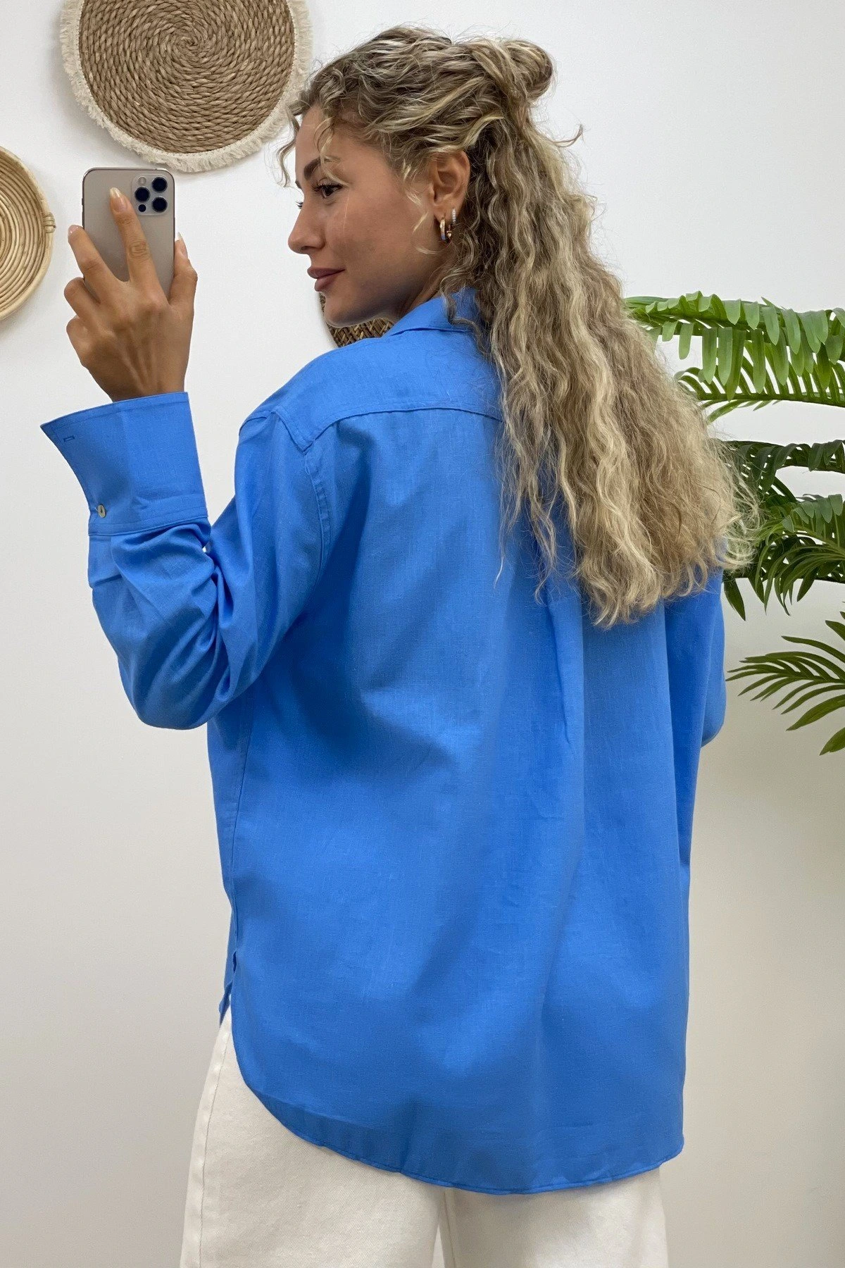 TEK CEP OVERSİZE KETEN GÖMLEK – MAVİ