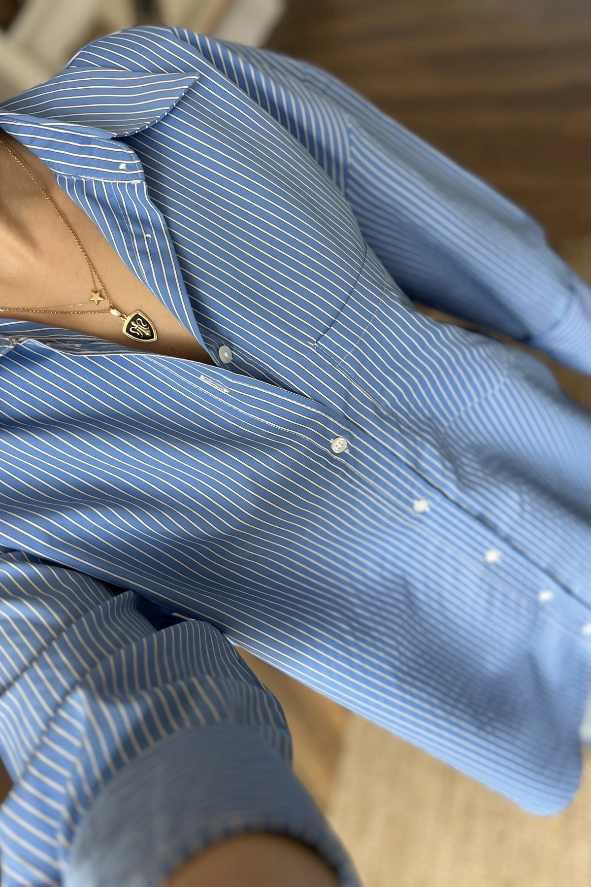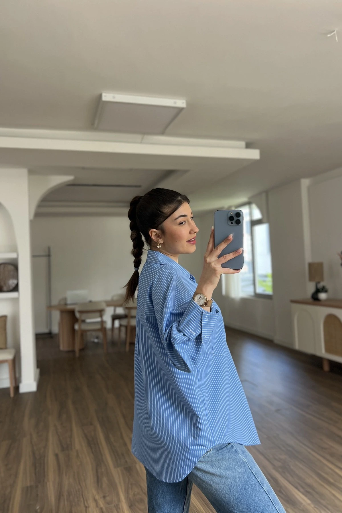 TEK CEPLİ OVERSİZE ÇİZGİLİ PAMUK TENSEL GÖMLEK – MAVİ