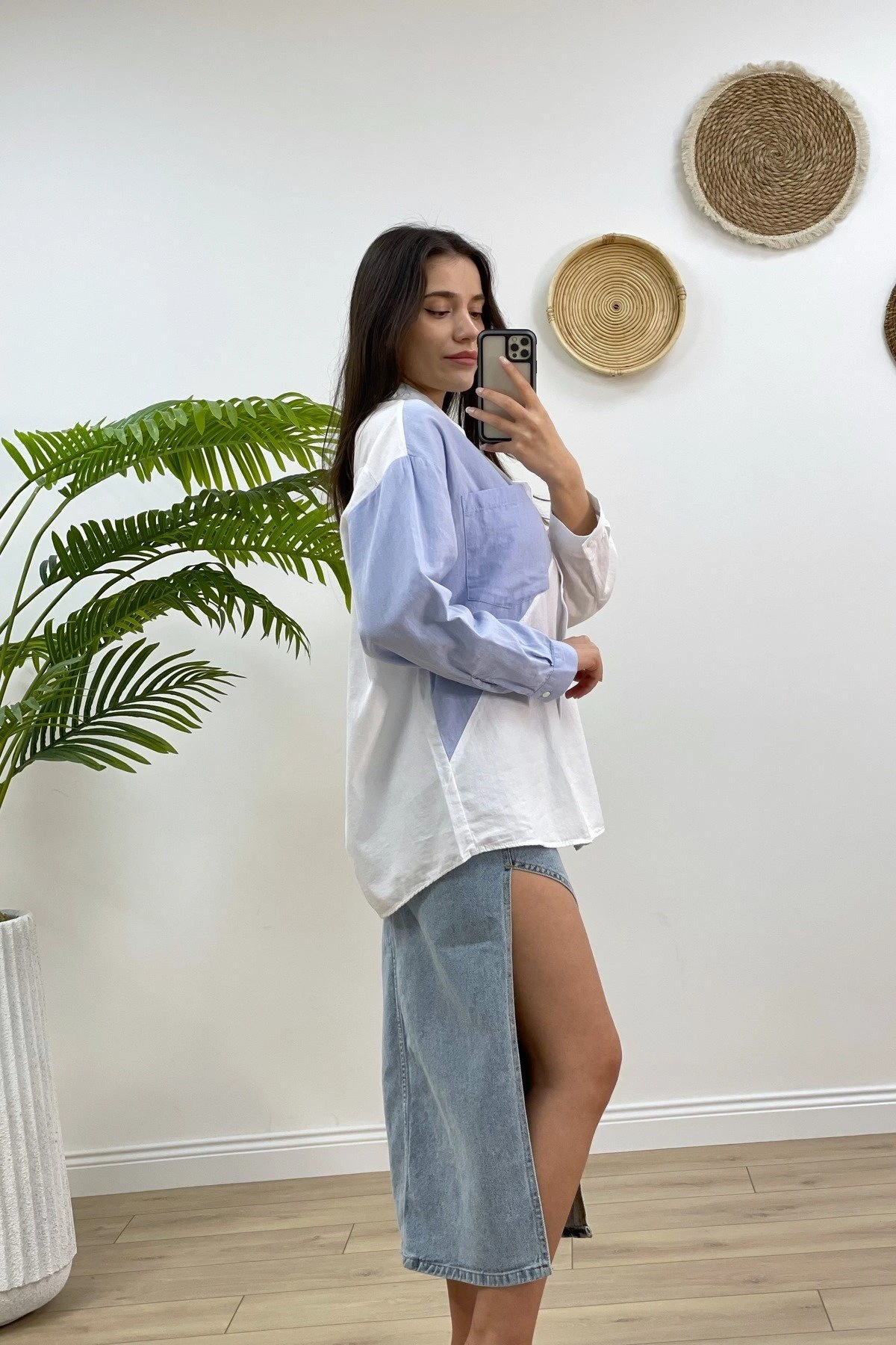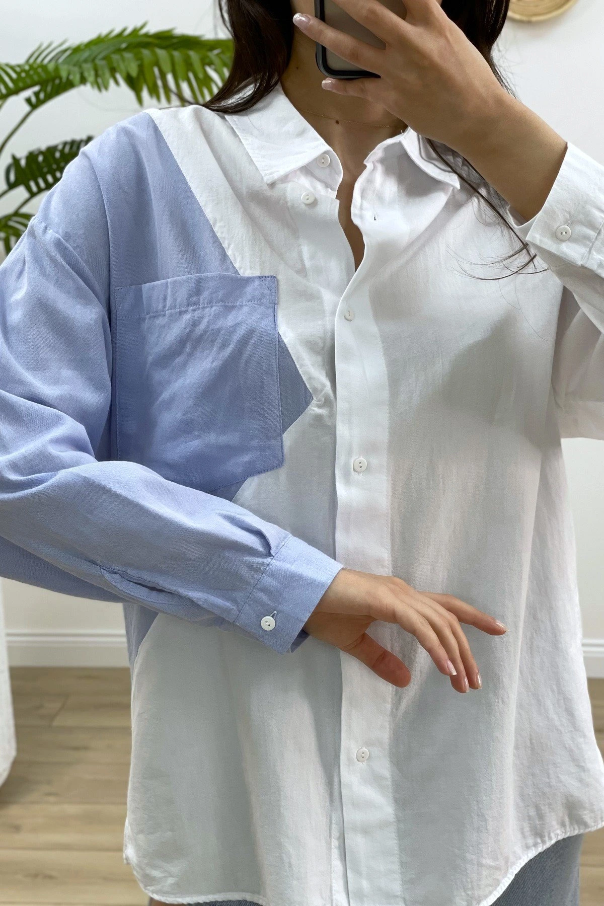 TEK KOL MAVİ RENK PAMUK SALAŞ GÖMLEK – BEYAZ