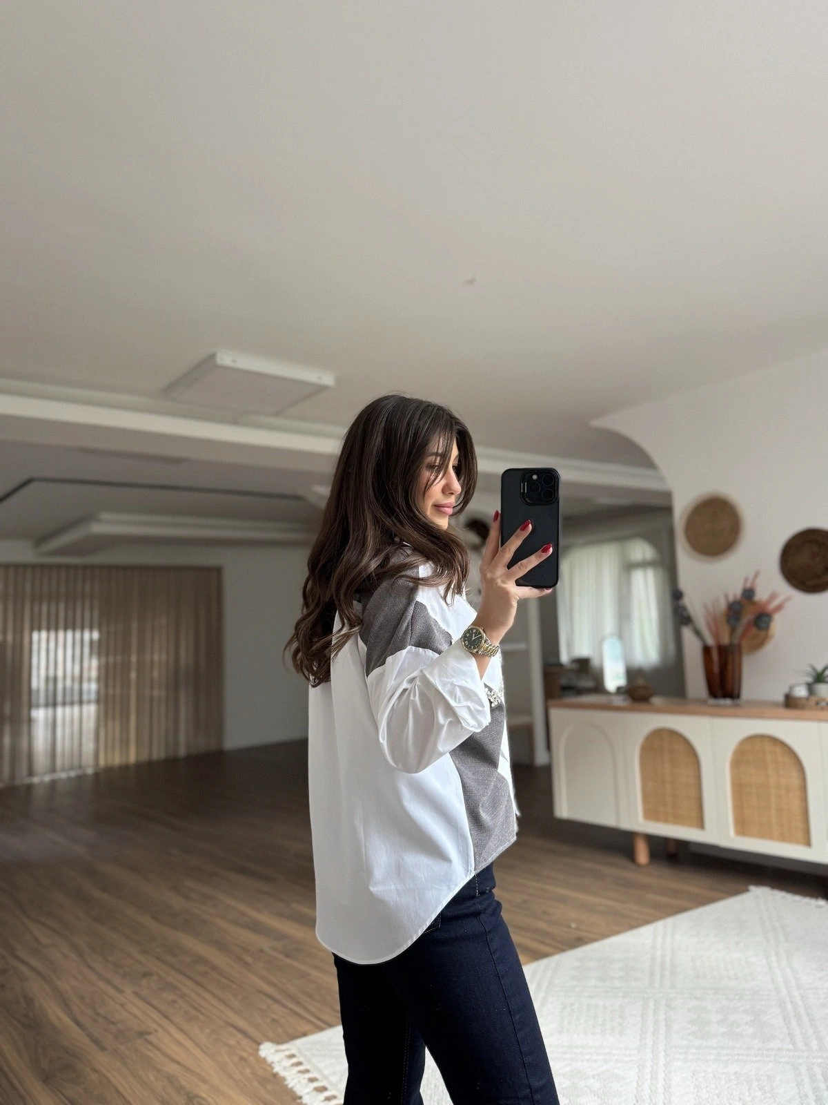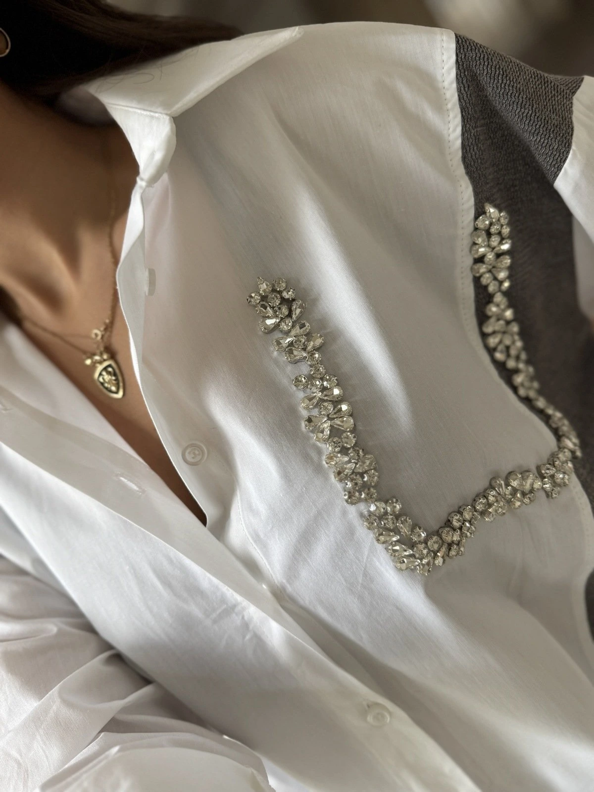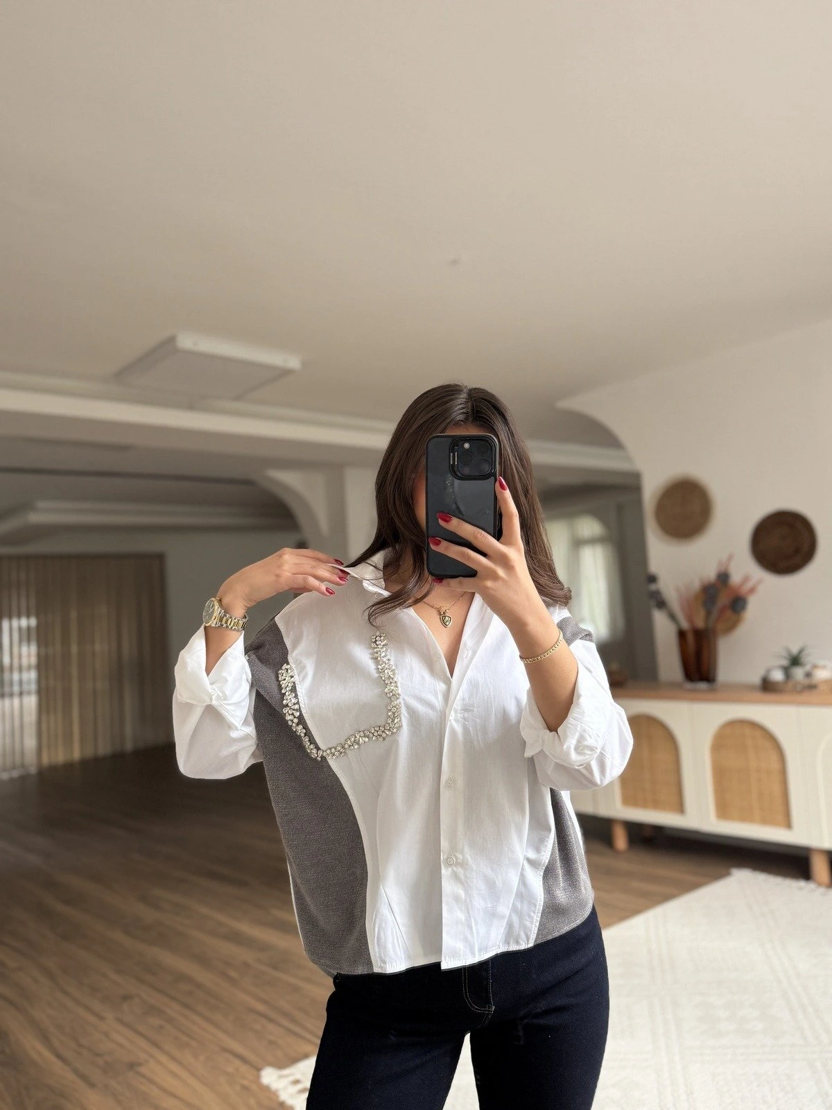 TRİKO POPLİN TAŞ DETAY ARKA UZUN PAMUK GÖMLEK – BEYAZ