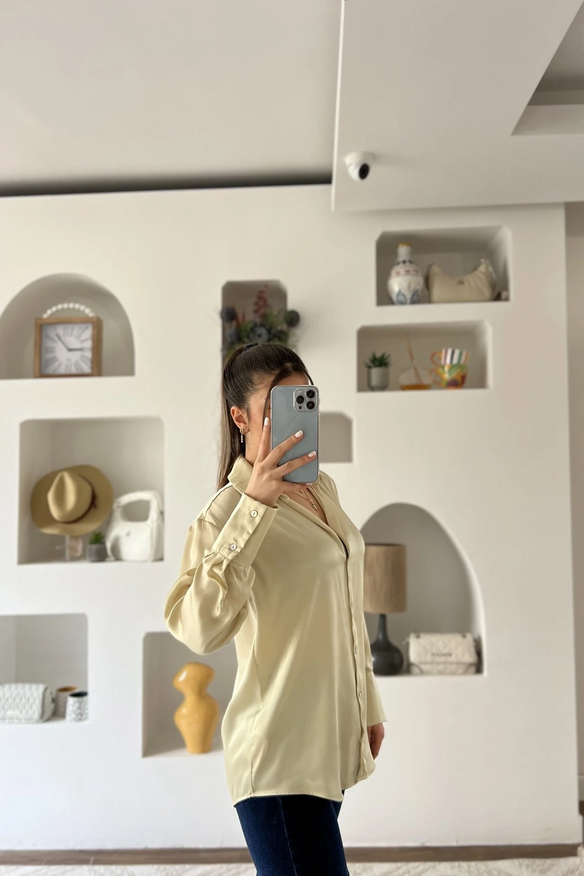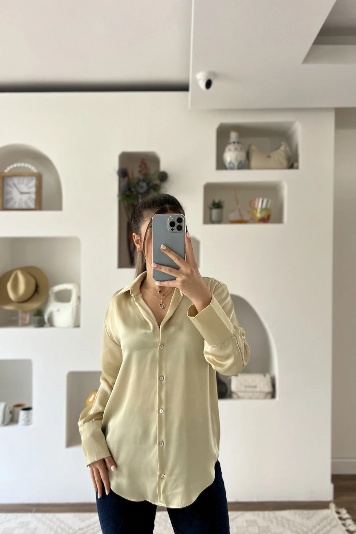 V YAKA BASİC SATEN GÖMLEK – KOYU EKRU