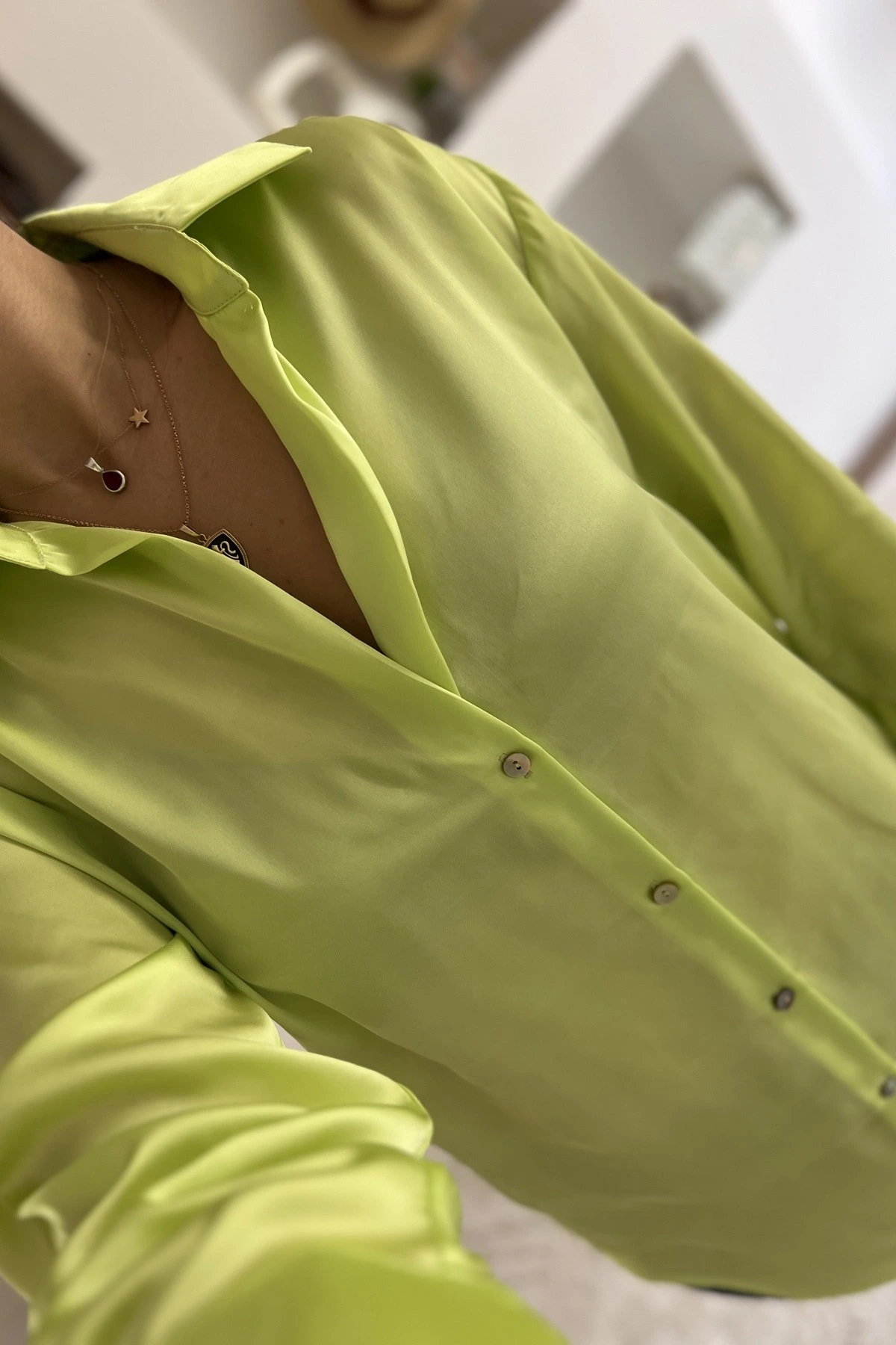 V YAKA BASİC SATEN GÖMLEK – NEON YEŞİL