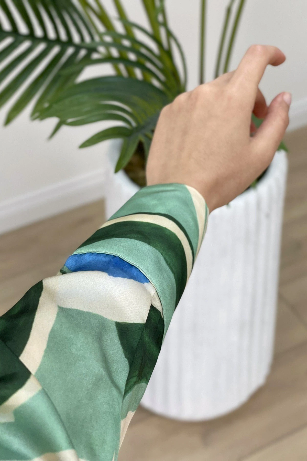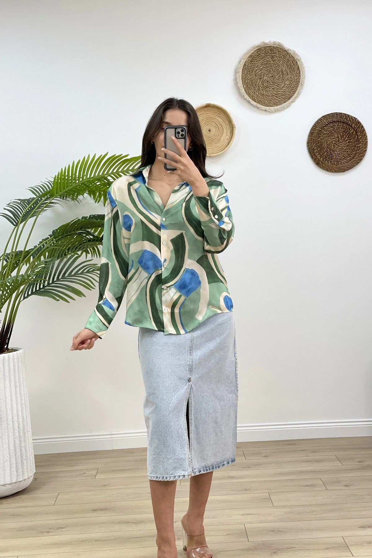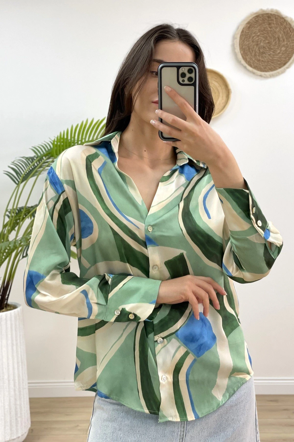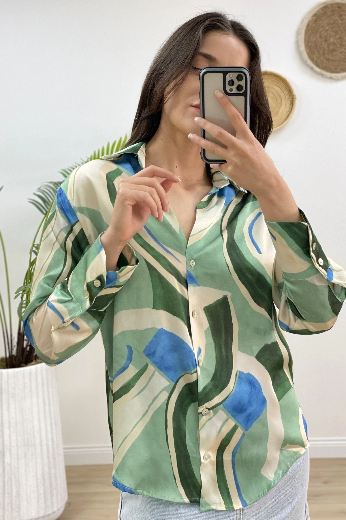 V YAKA DESENLİ SATEN GÖMLEK – MAVİ