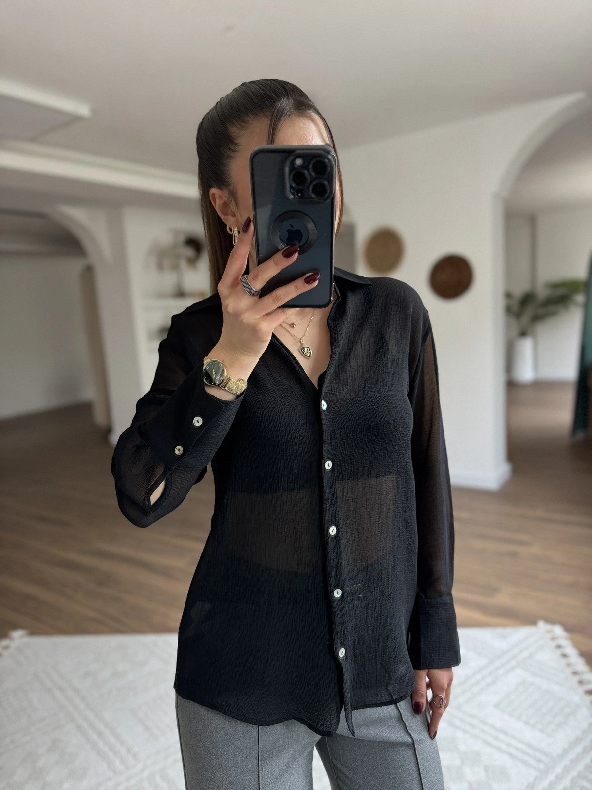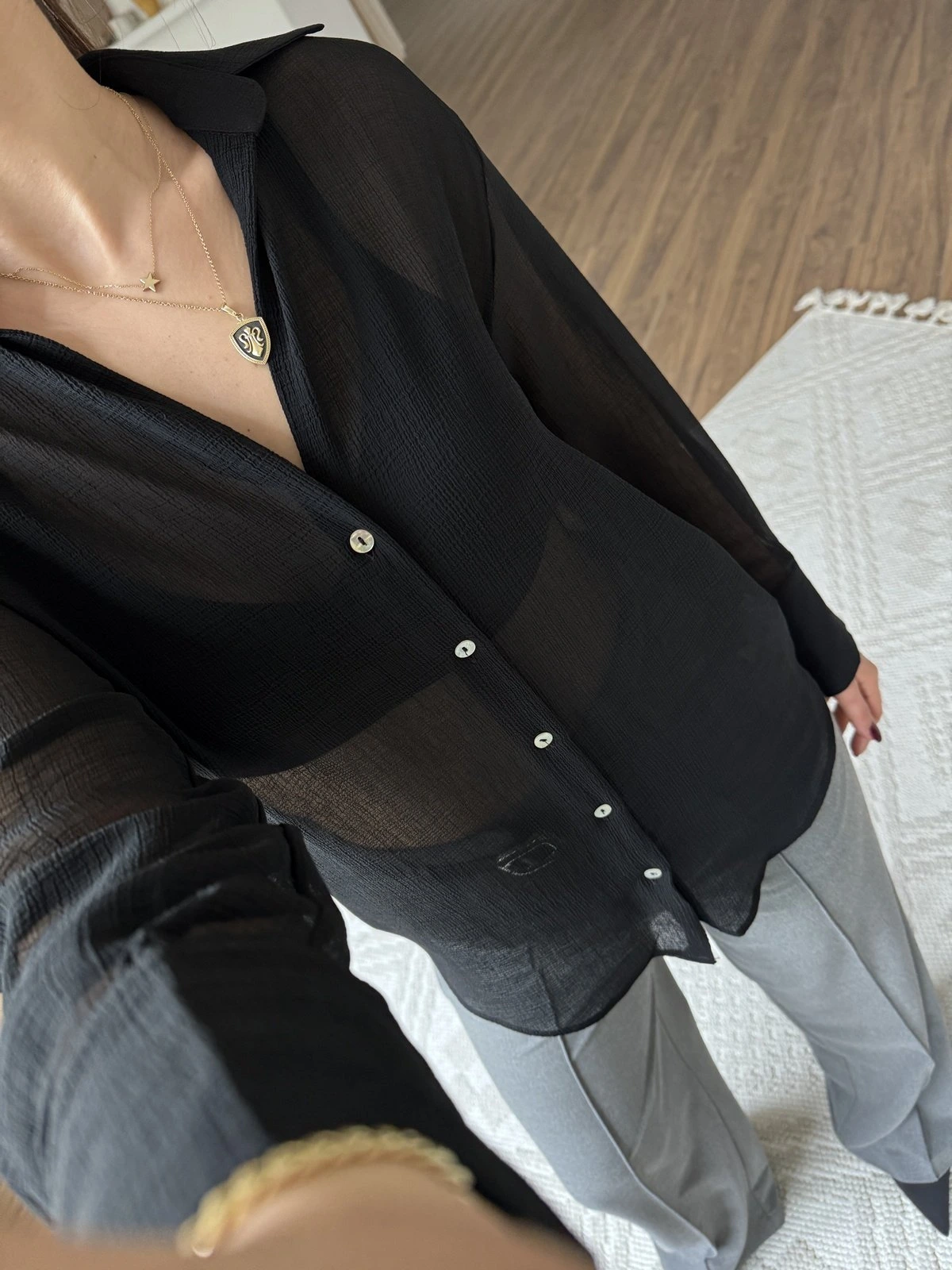 V YAKA DOKULU ŞİFON GÖMLEK – SİYAH
