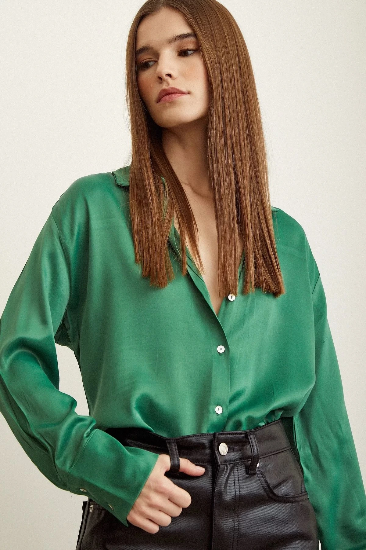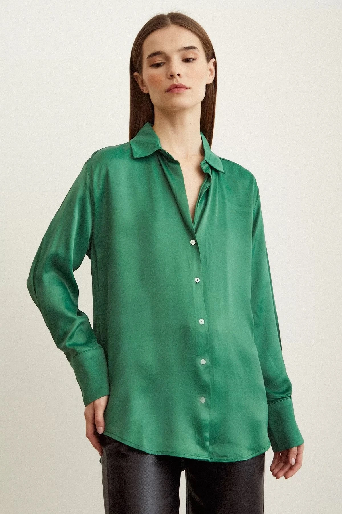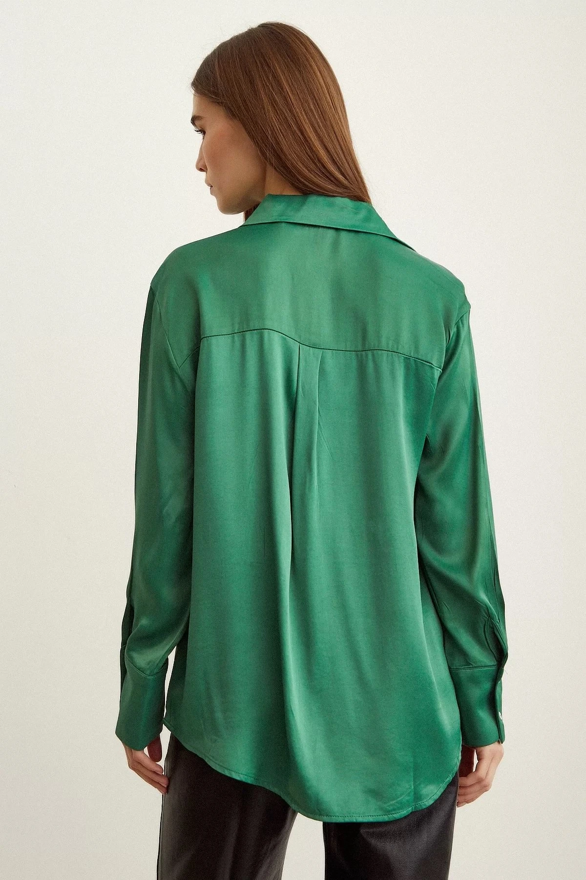 V YAKA KALIN PARLAK SATEN GÖMLEK – BENETTON YEŞİLİ