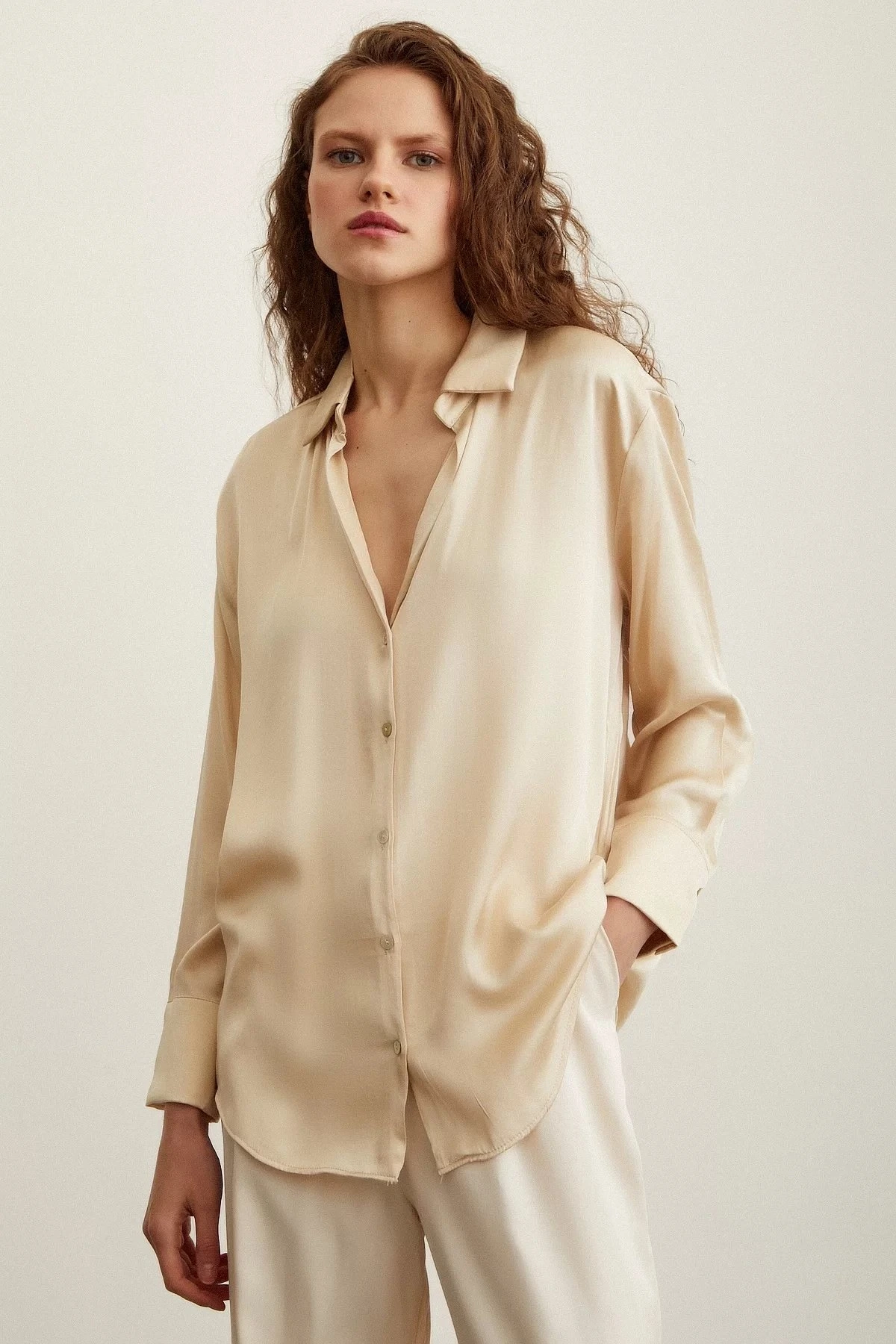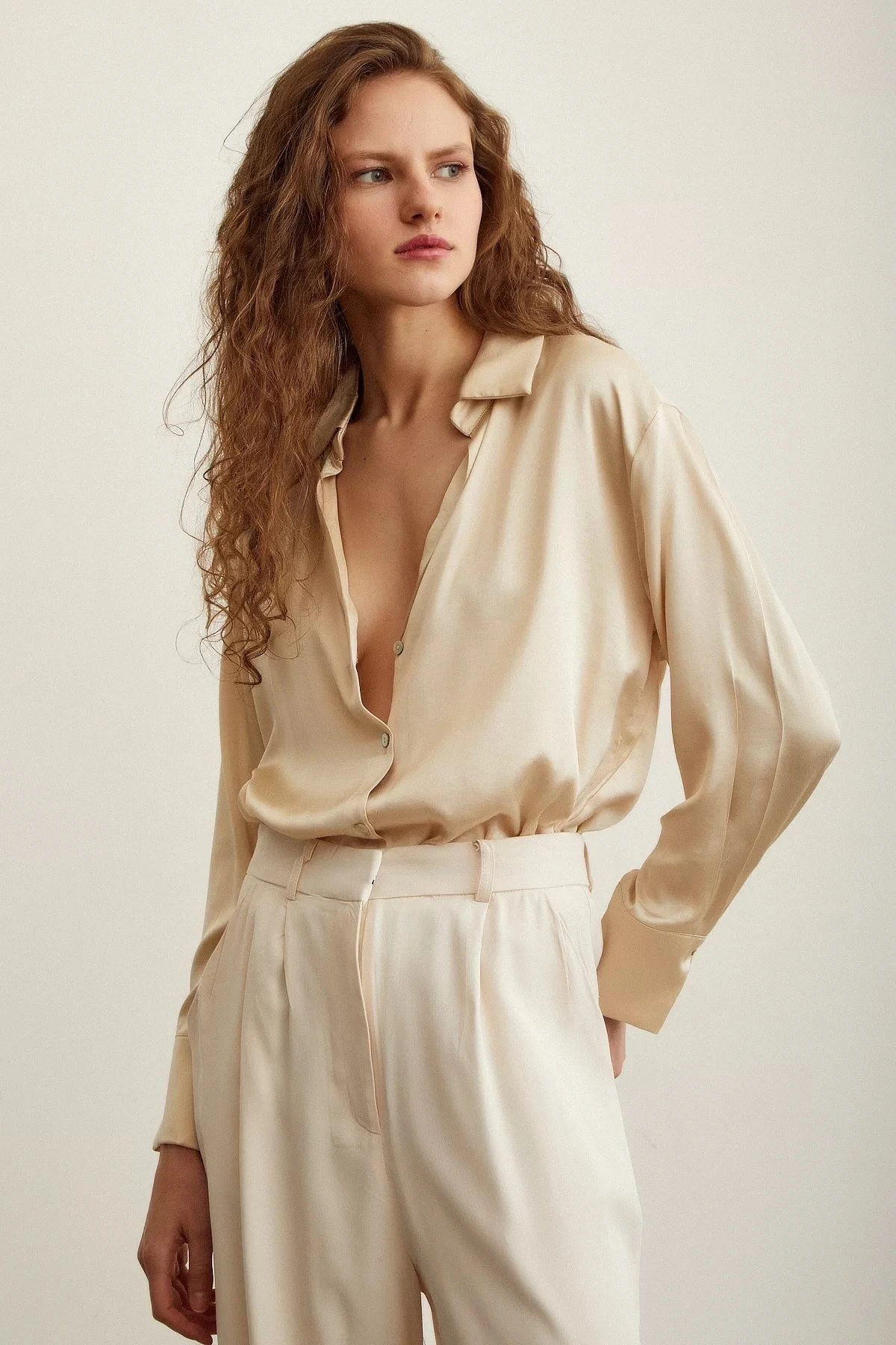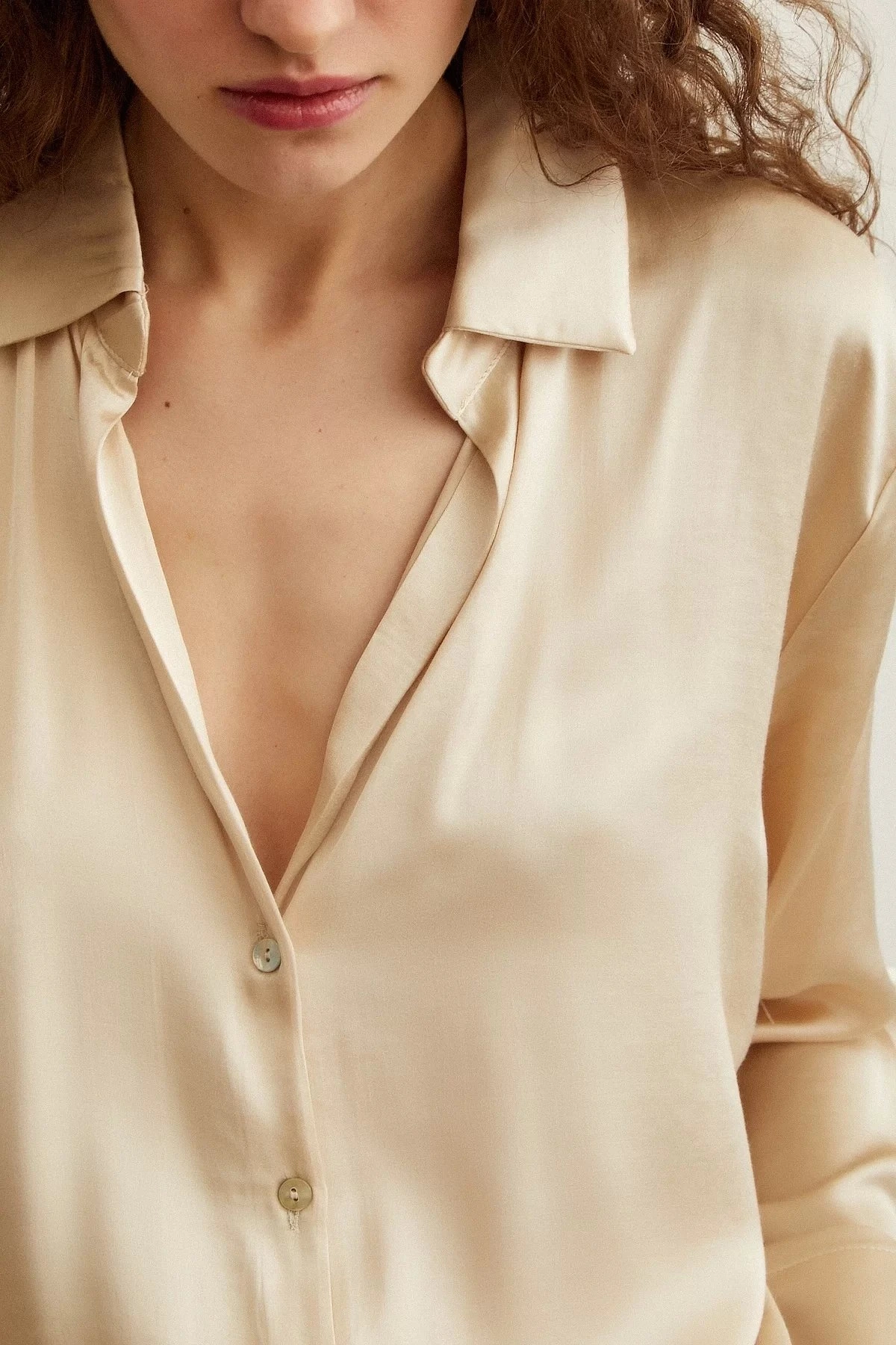 V YAKA VİSKON SATEN GÖMLEK – BEJ