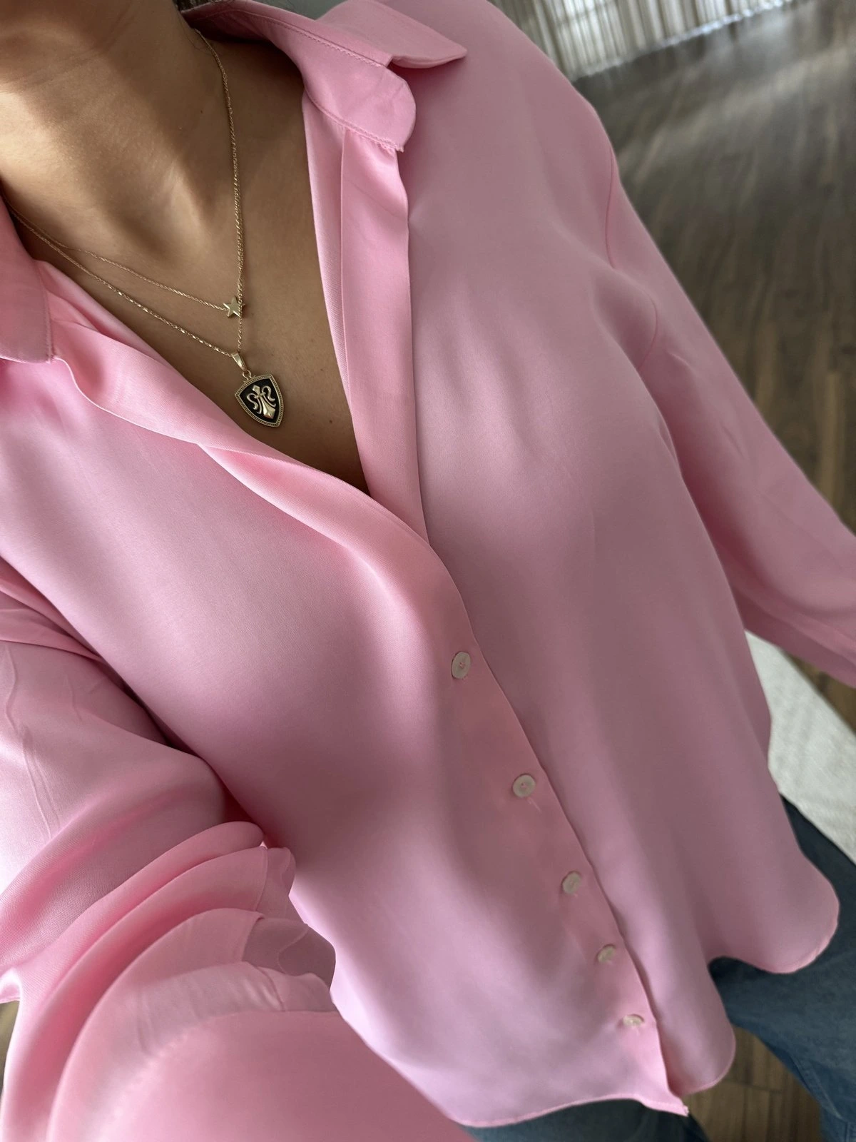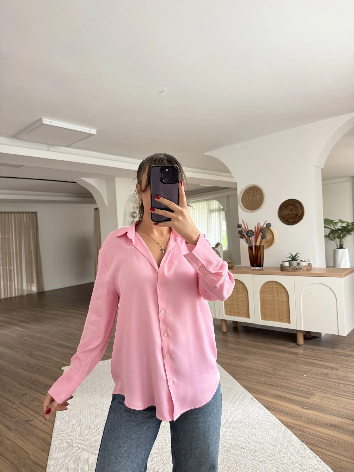 V YAKA VİSKON SATEN GÖMLEK – PEMBE