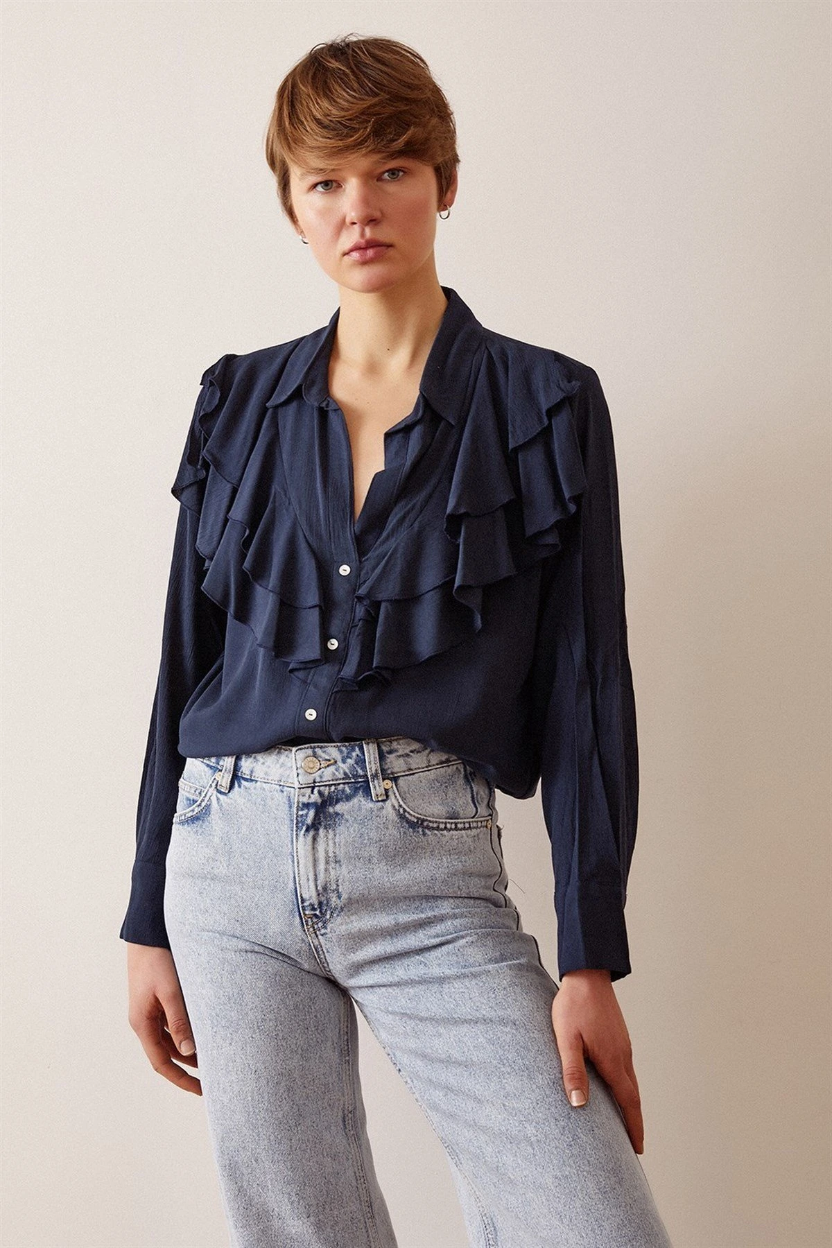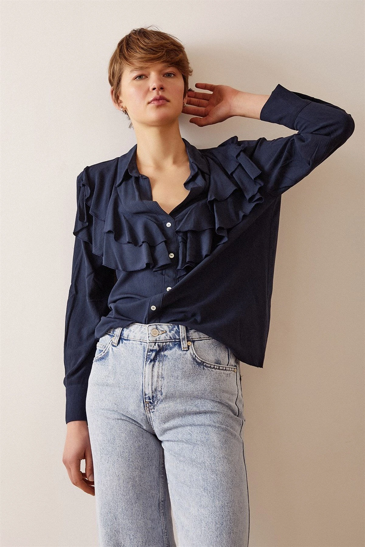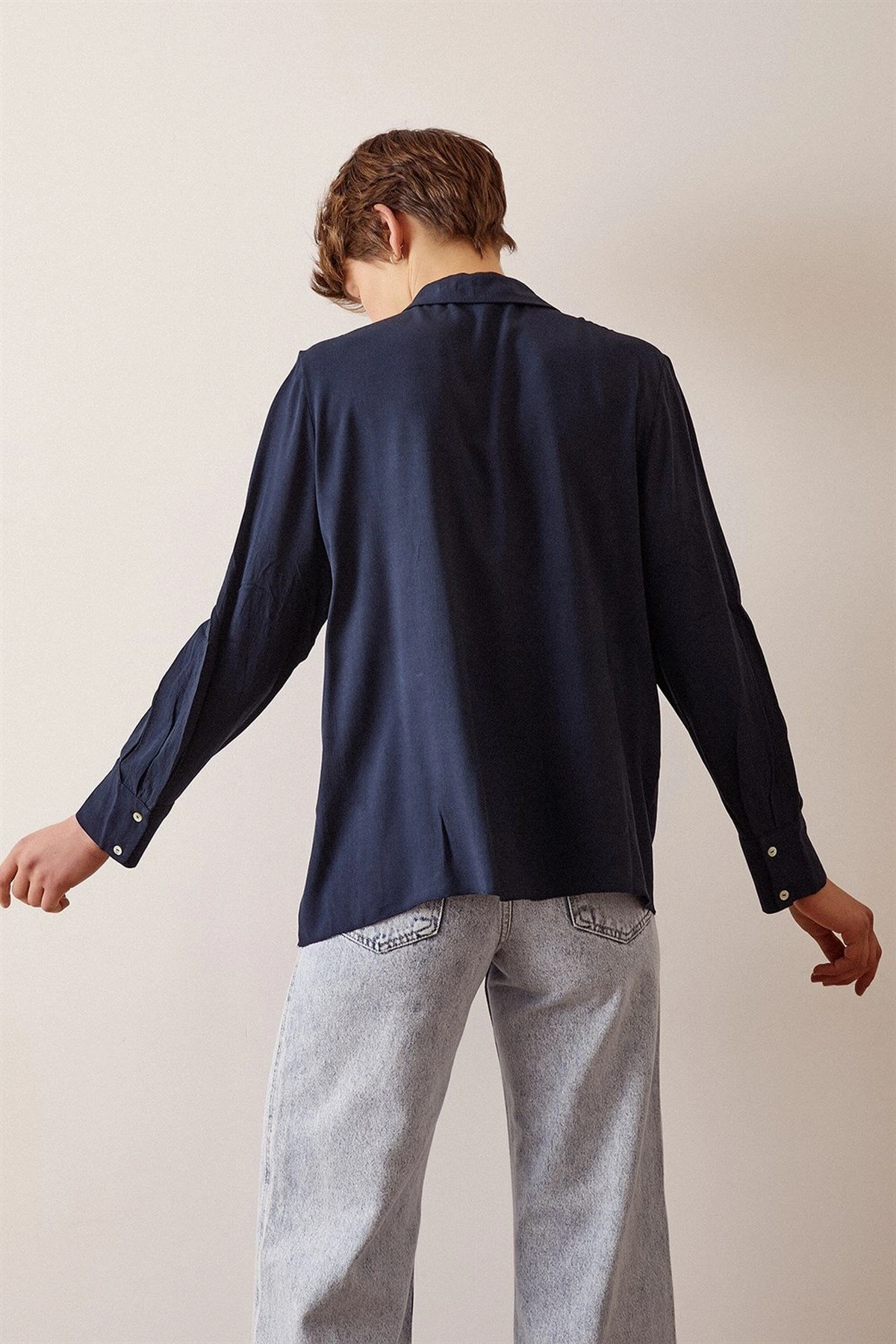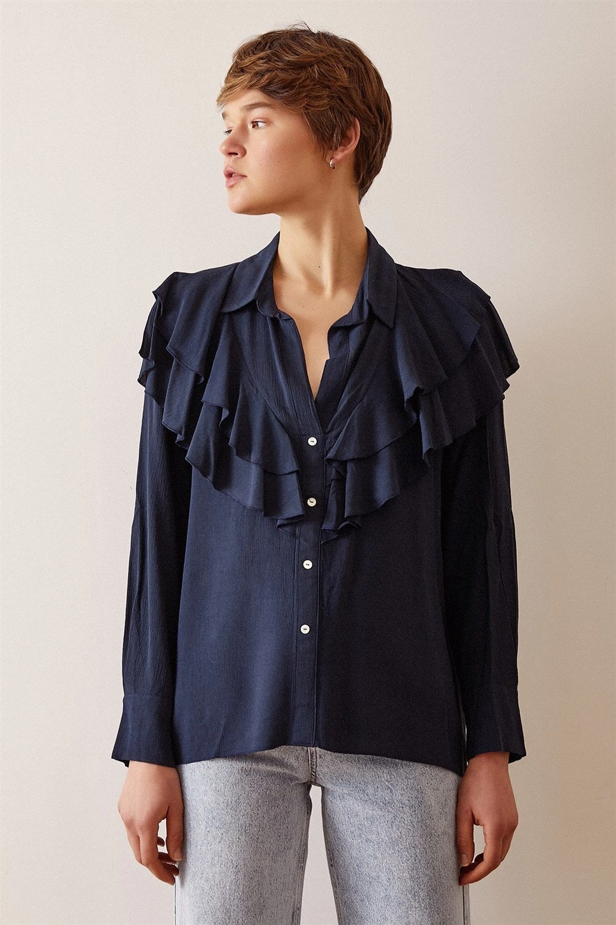 YAKA FIRFIRLI VİSKON GÖMLEK. – LACİVERT