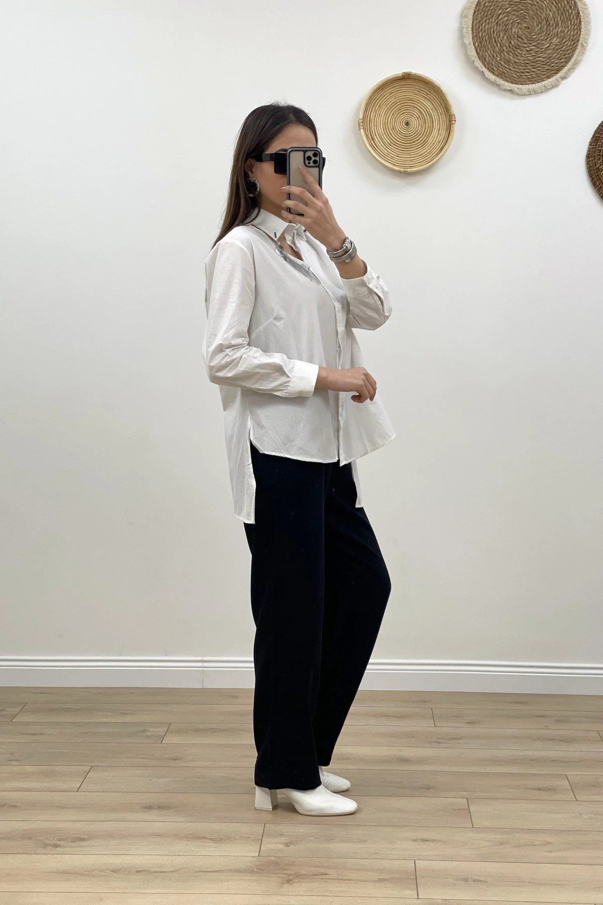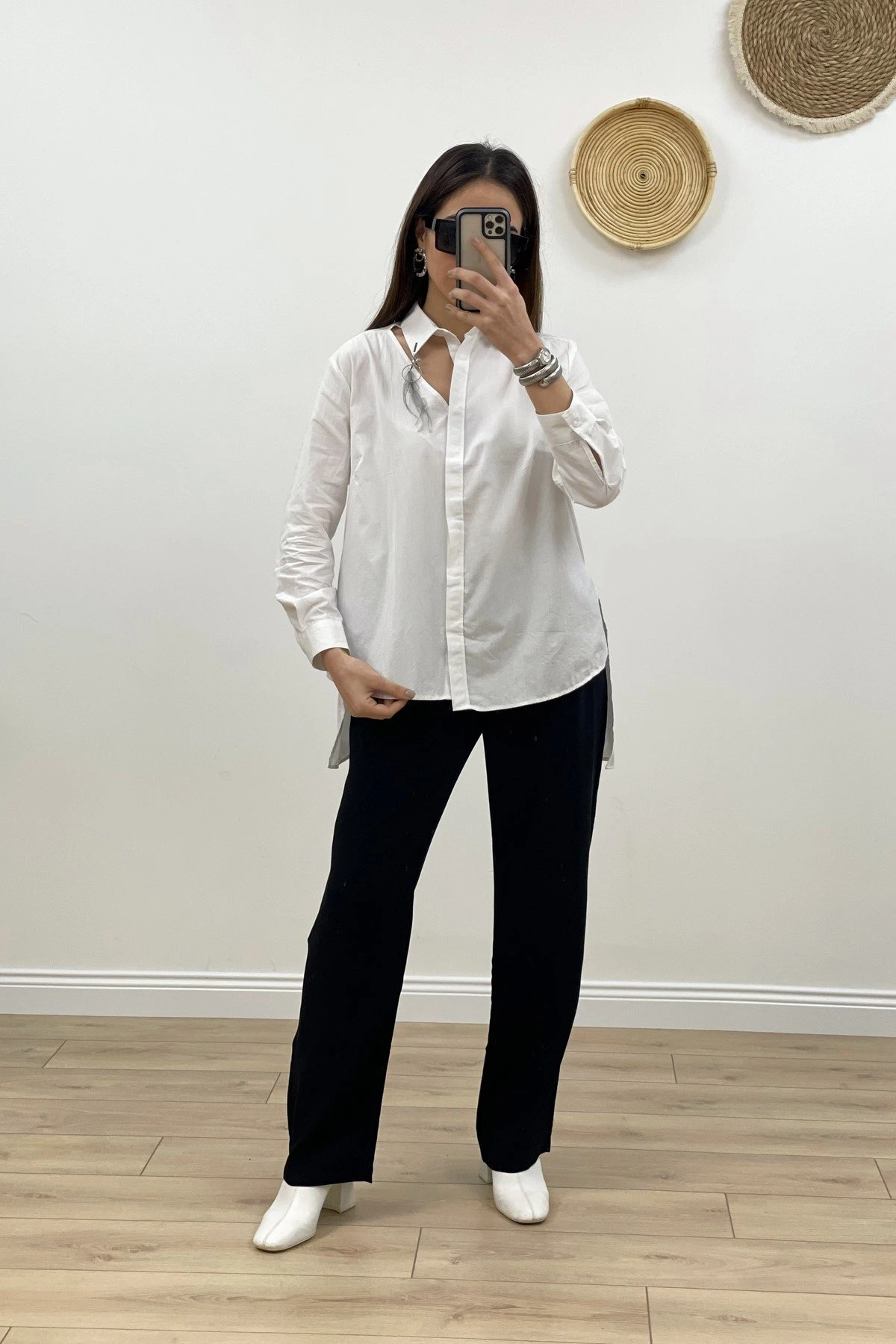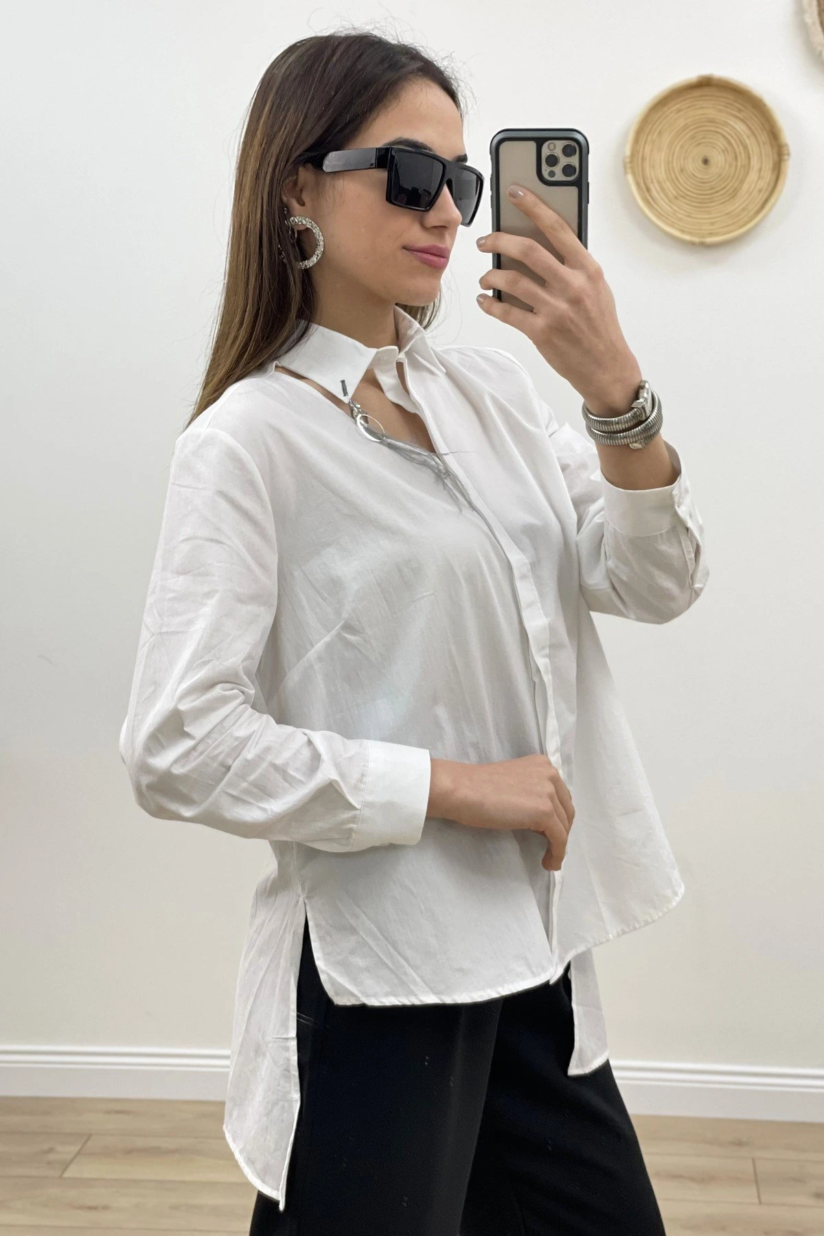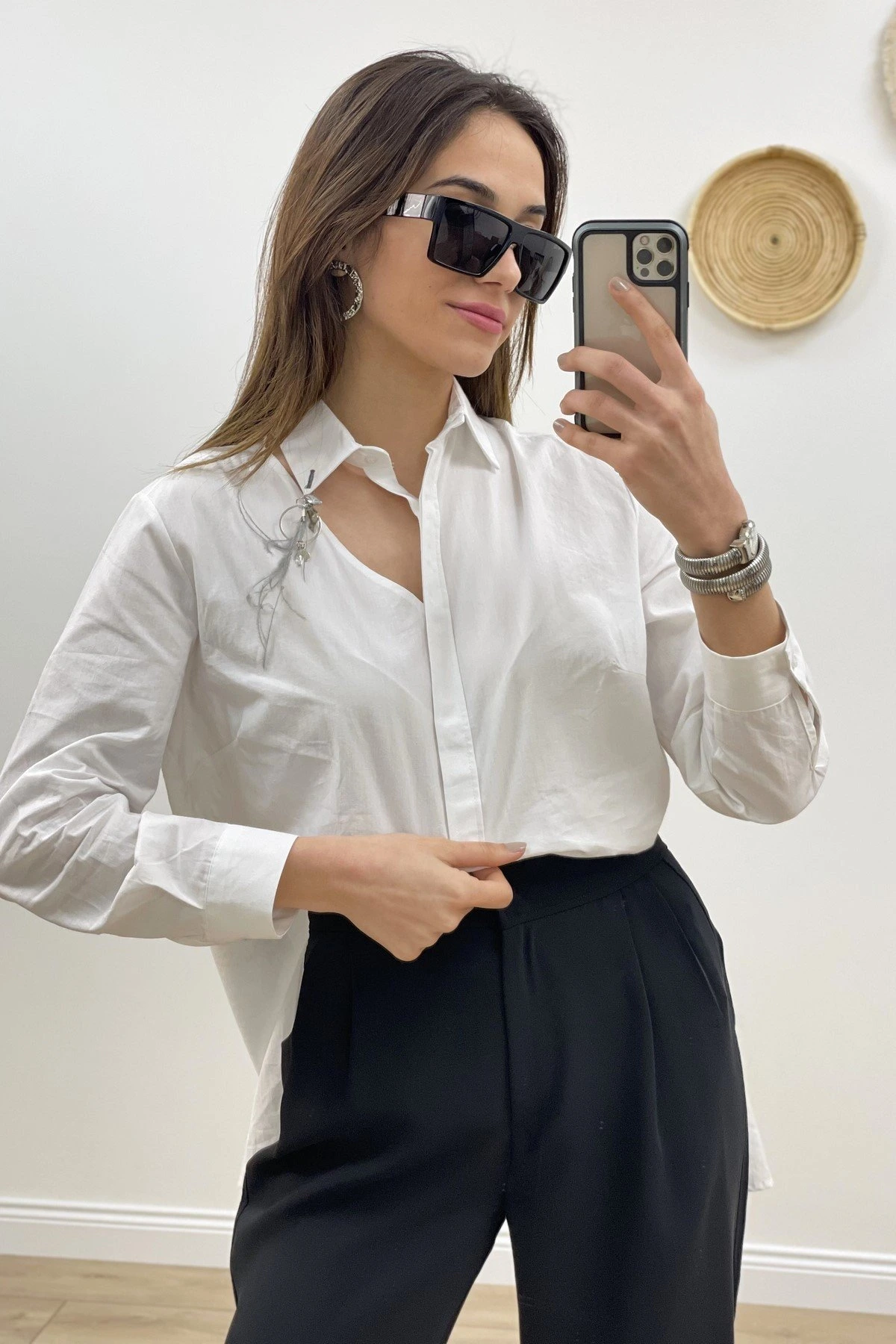 YAKA PENCERE AKSESUAR ASİMETRİK GÖMLEK – BEYAZ