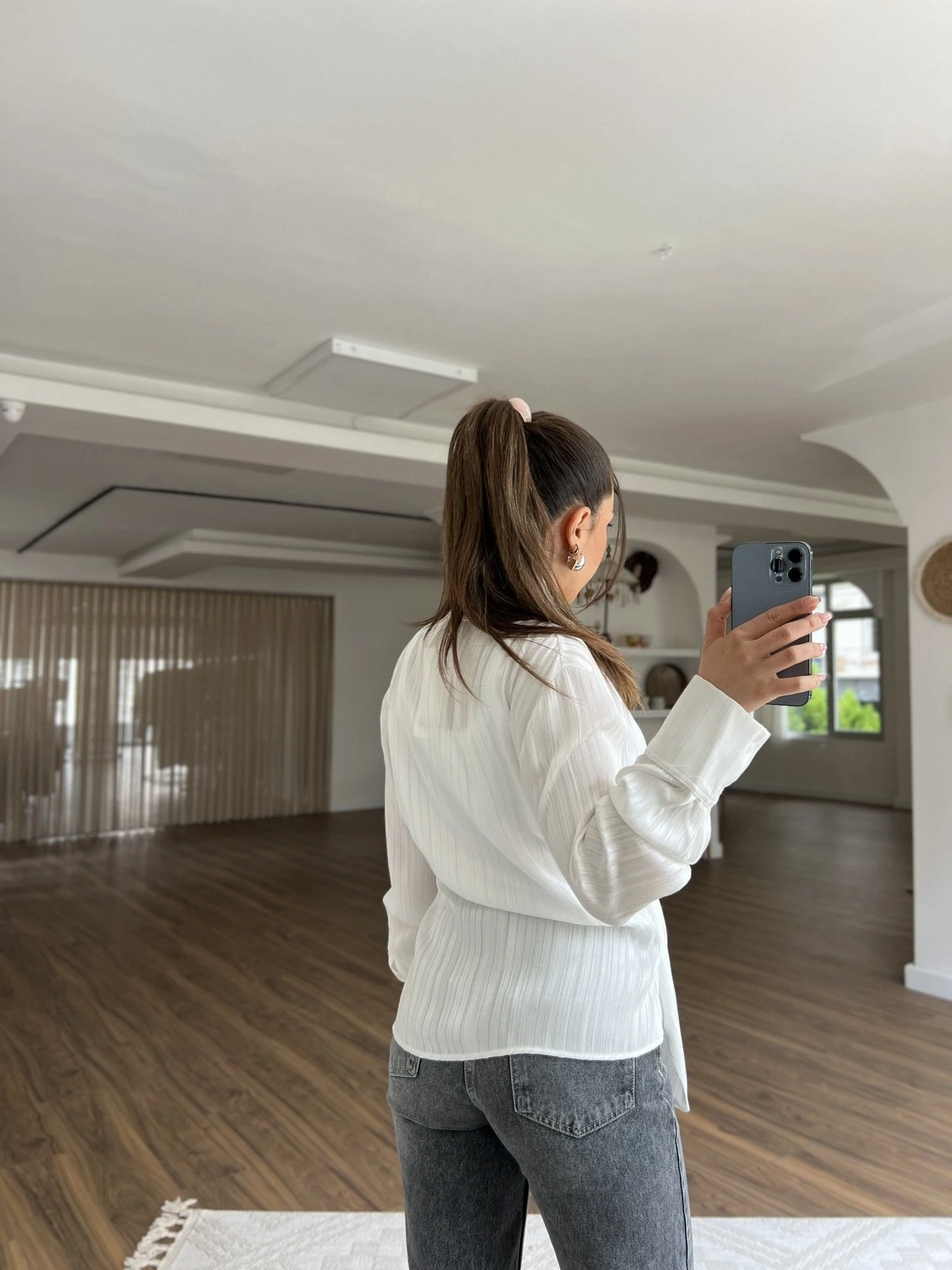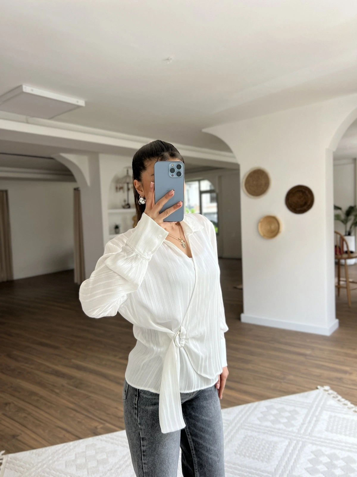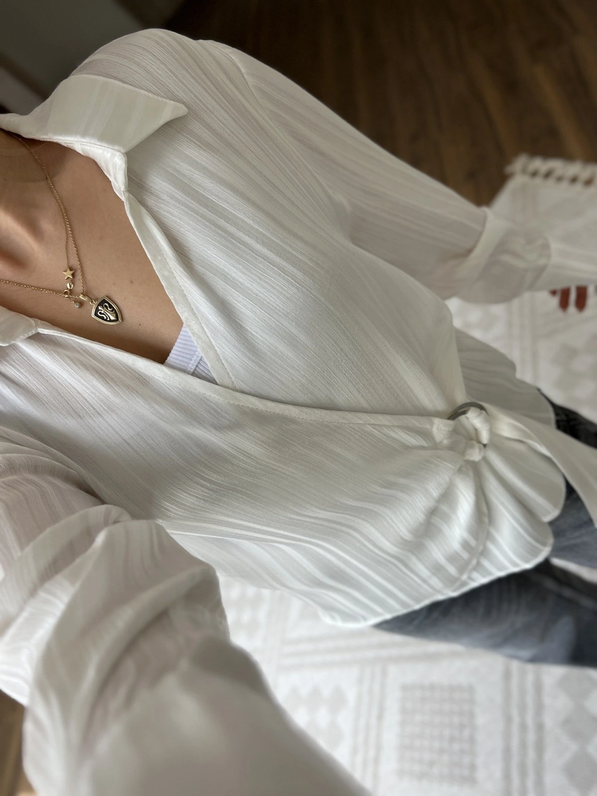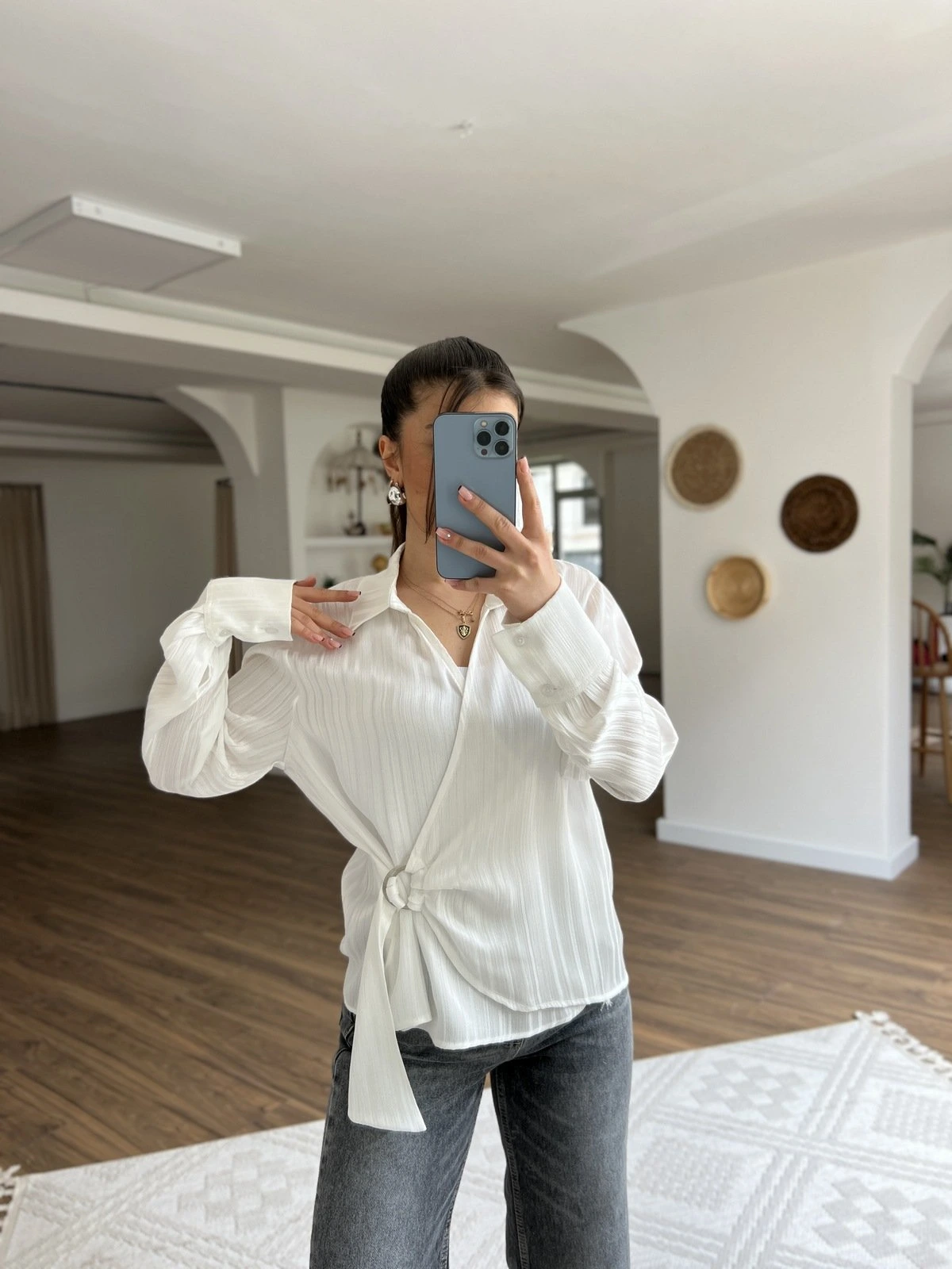 YAN TOKA BAĞLAMA DOKULU SATEN VİSKON GÖMLEK – BEYAZ