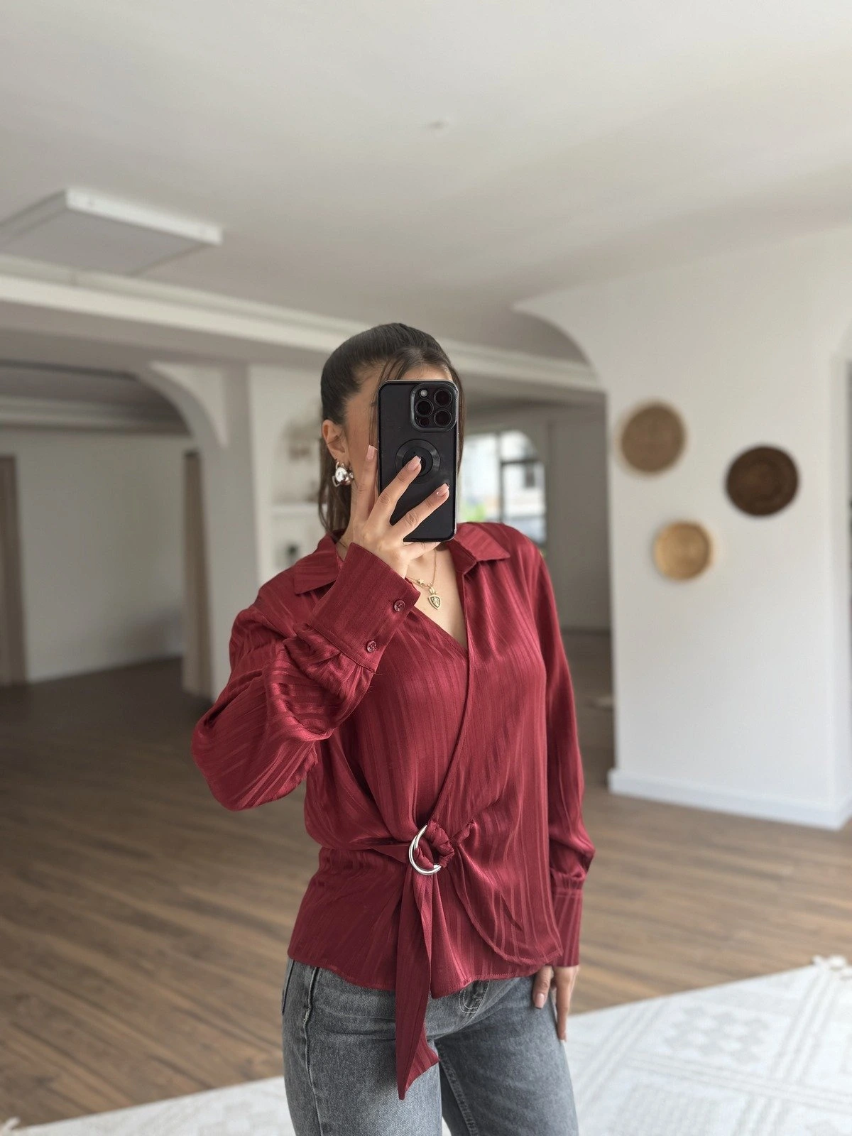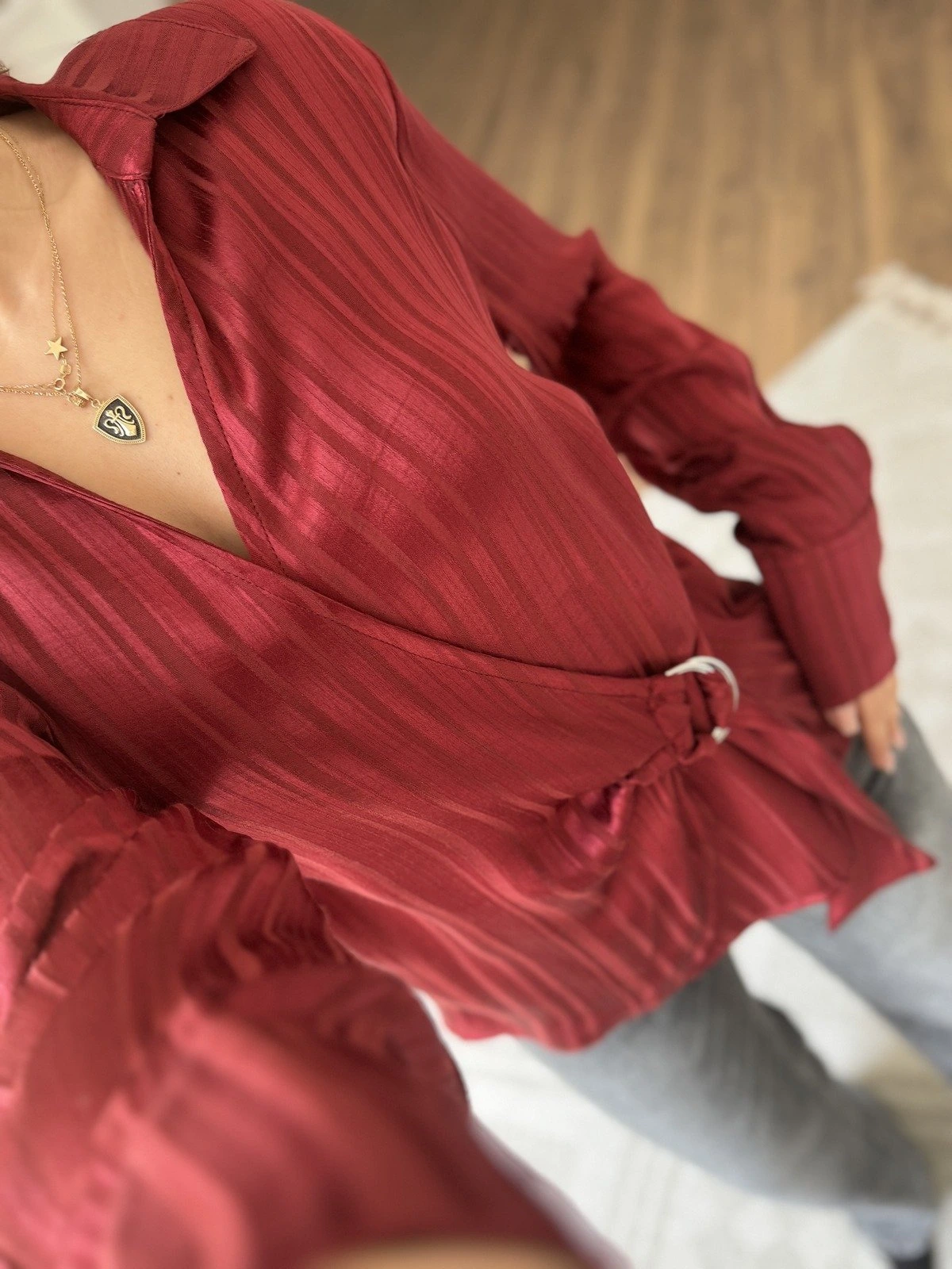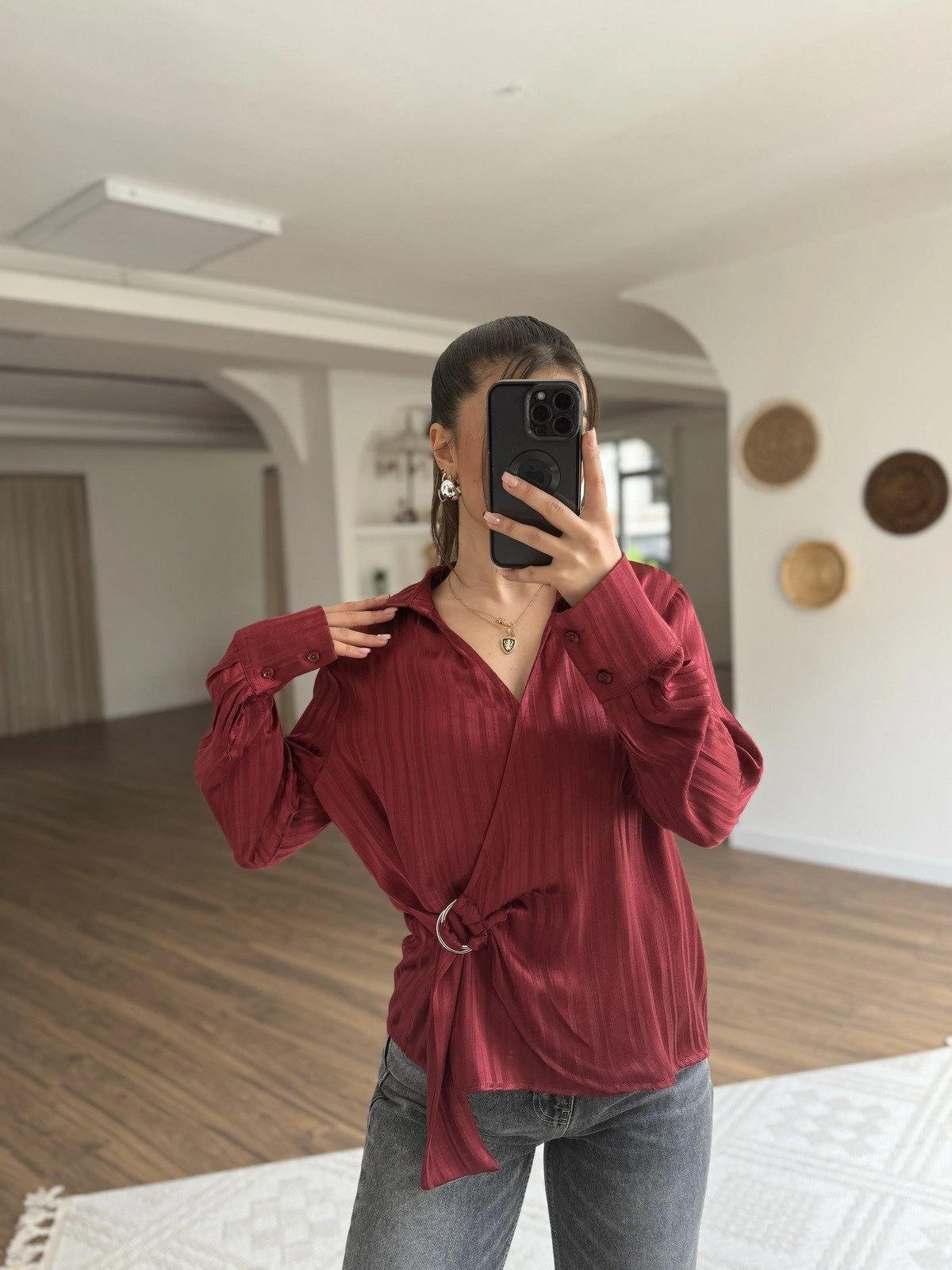YAN TOKA BAĞLAMA DOKULU SATEN VİSKON GÖMLEK – BORDO