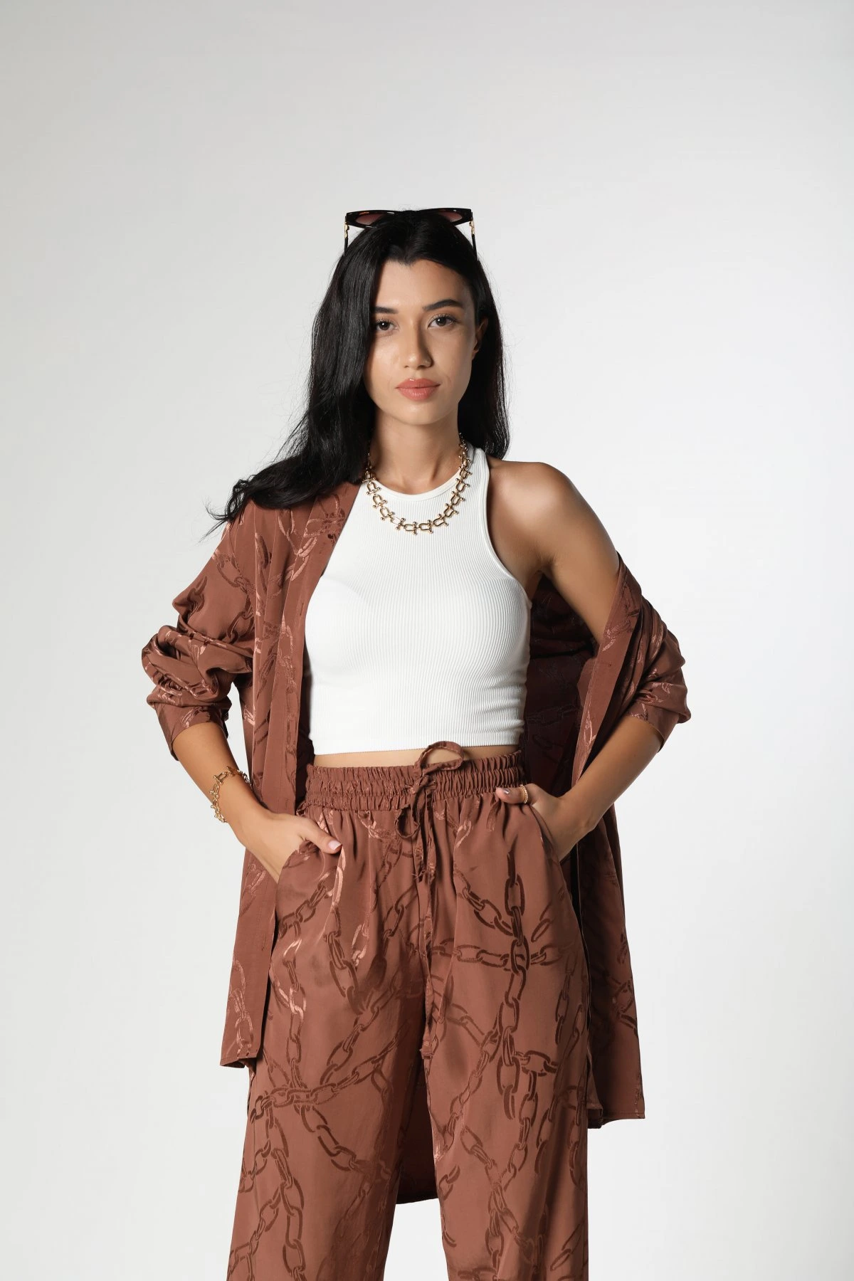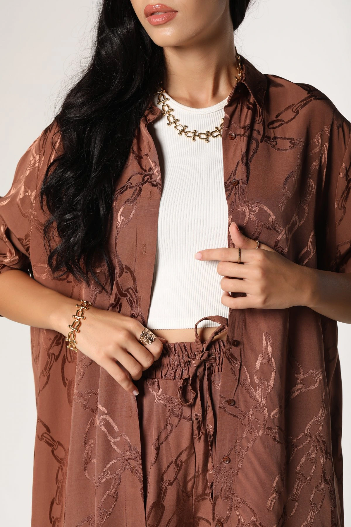 ZİNCİR DESEN SATEN GÖMLEK – KAHVE