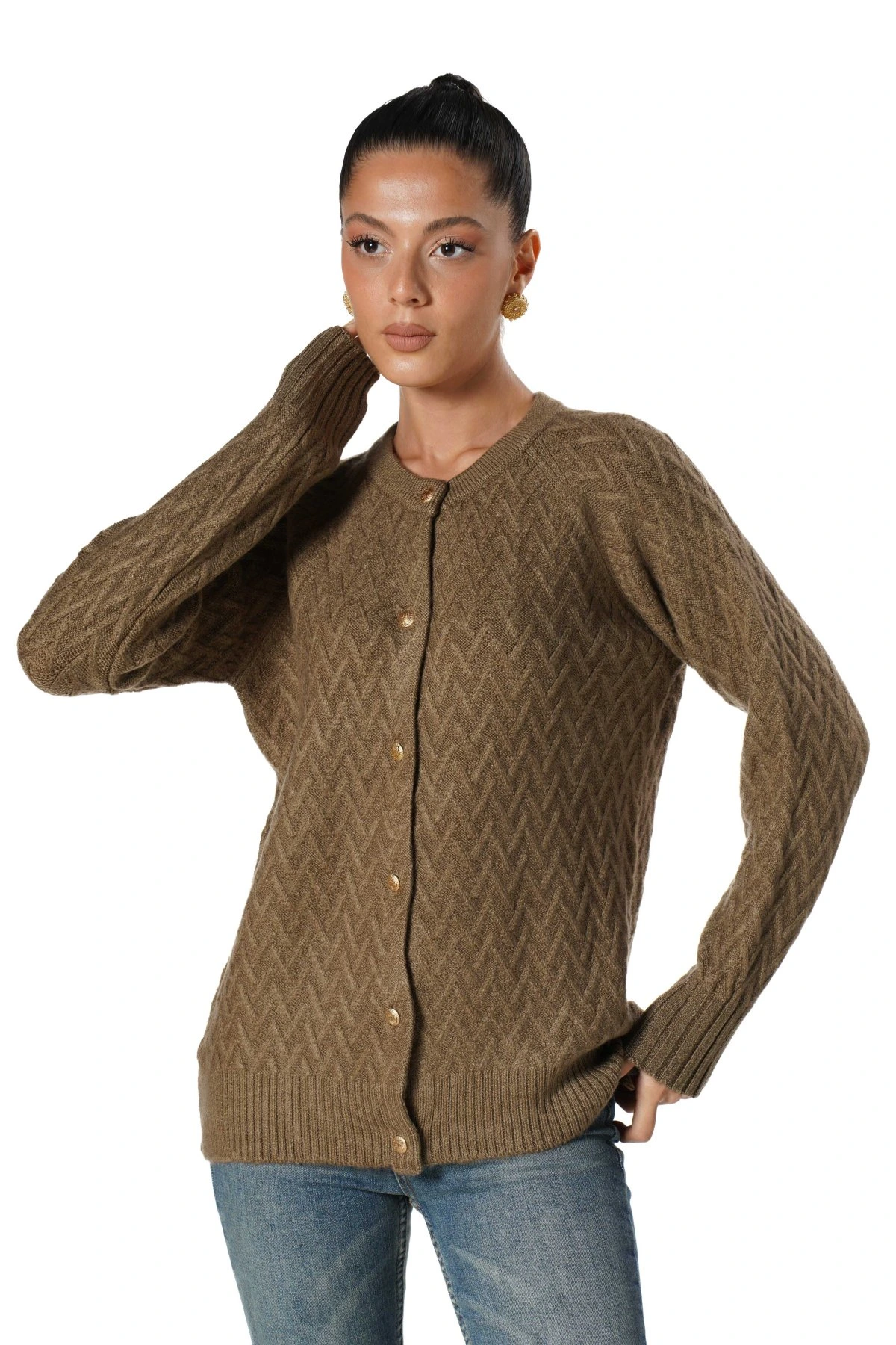 GENİŞ BAKLAVA DESEN BİSİKLET YAKA YUMOŞ HIRKA – CAMEL