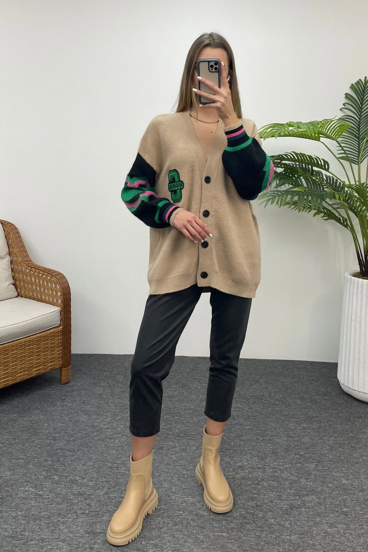 CEP GÖRÜNÜMLÜ SİLVER DÜĞMELİ UZUN KOL VİSKON HIRKA – CAMEL
