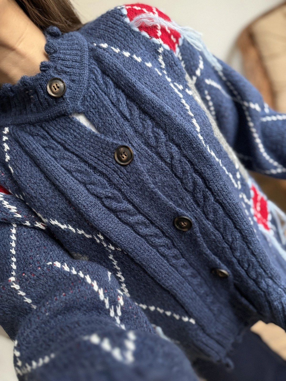 BAKLAVA DESEN DİK YAKA SAÇAKLI HIRKA – İNDİGO
