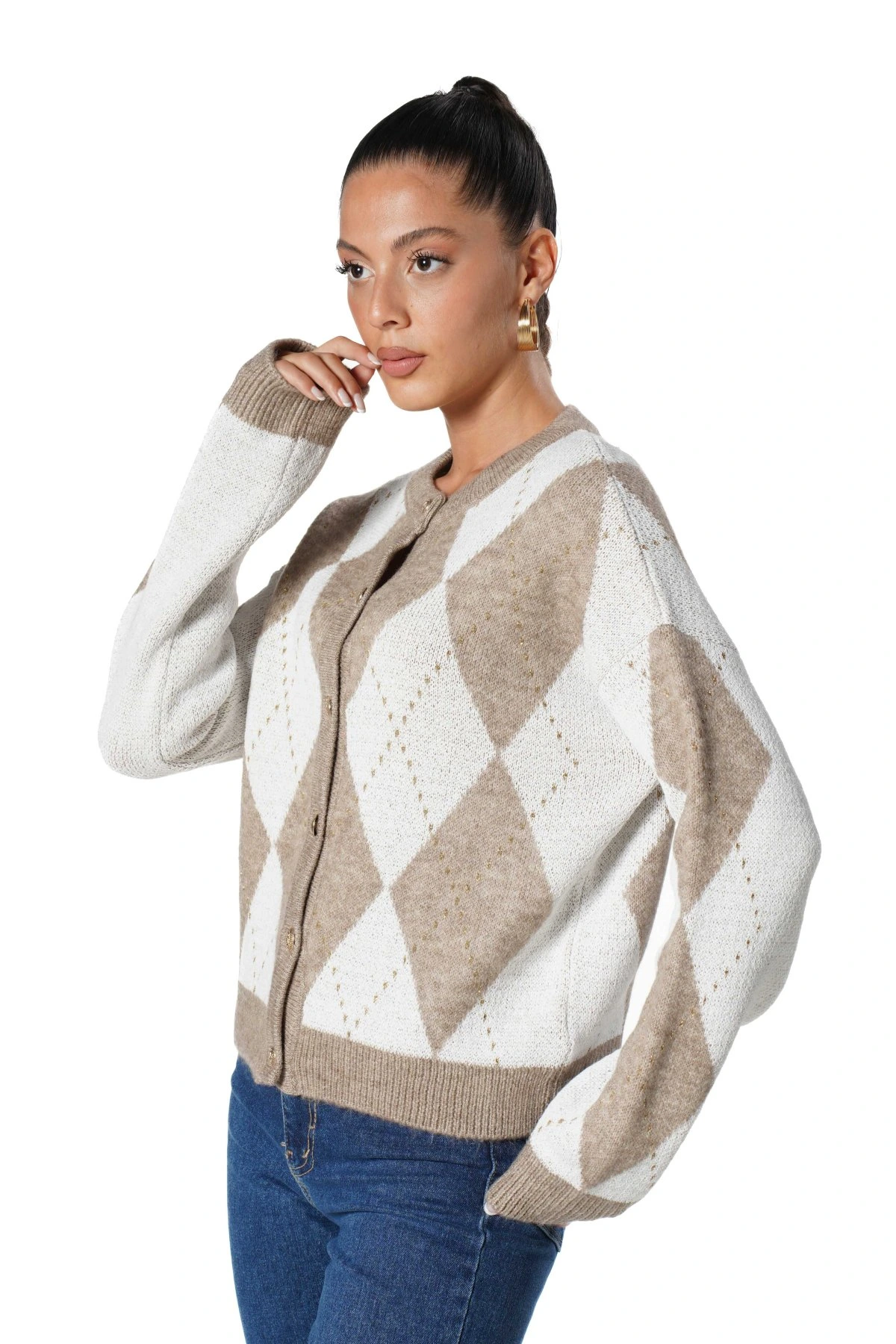 BAKLAVA DESEN GOLD DÜĞME SİM DETAY VİSKON HIRKA – CAMEL EKRU
